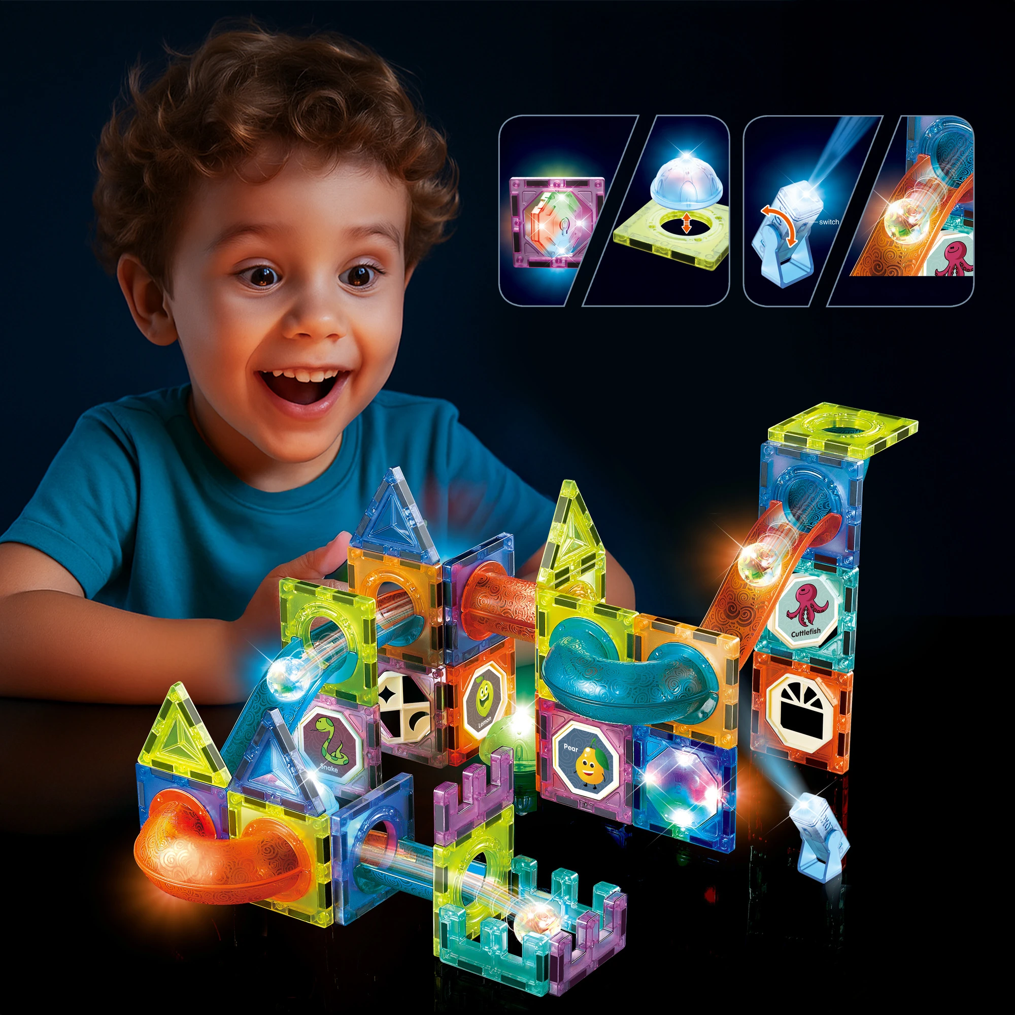 Klocki Magnetyczne - Light Magnetic Blocks to edukacyjna zabawka, która jednocześnie zapewnia bezpieczną i kreatywną zabawę. W skład zestawu wchodzi 75 różnorodnych elementów, takich jak klocki z wzorami, naklejki z różnymi motywami, tunele oraz figurki.