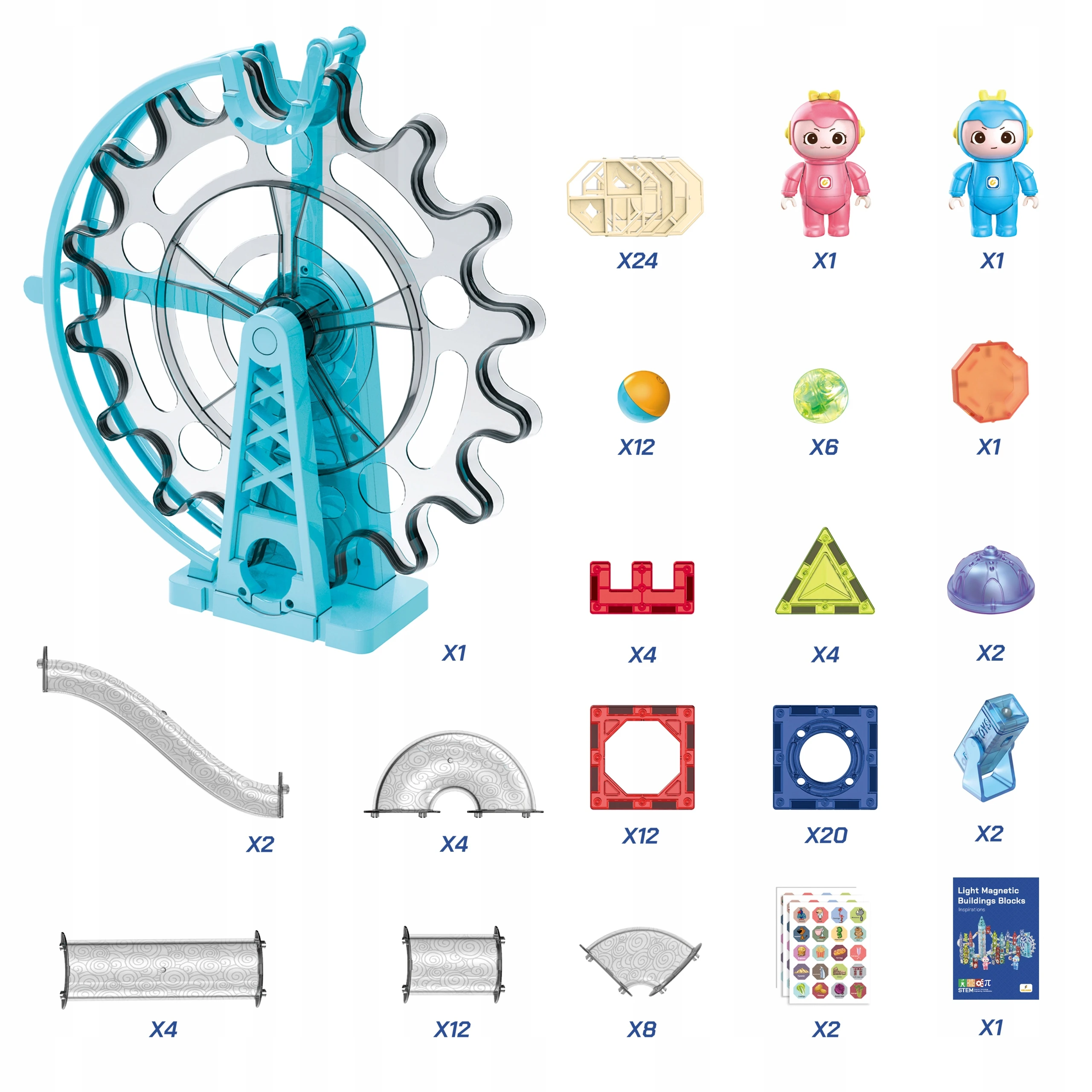 120 Elementów konstrukcyjnych, w tym: klocki magnetyczne, świecące kulki, naklejki.