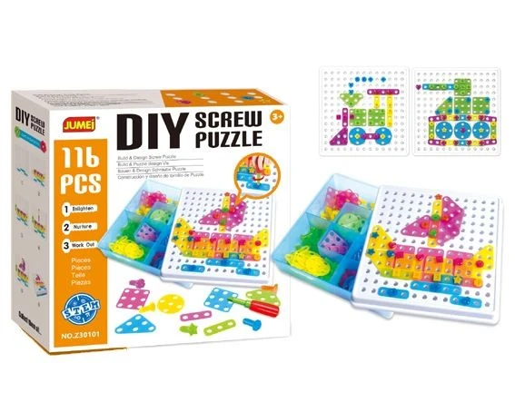 Zestaw puzzli konstrukcyjnych, który składa się z 116 różnych elementów. Dziecko ma do dyspozycji elementy płaskie w różnych kształtach i kolorach, które może swobodnie ze sobą łączyć za pomocą śrubek.