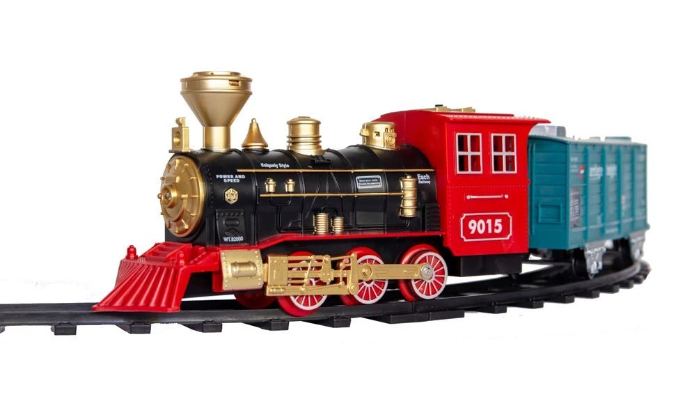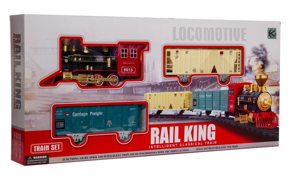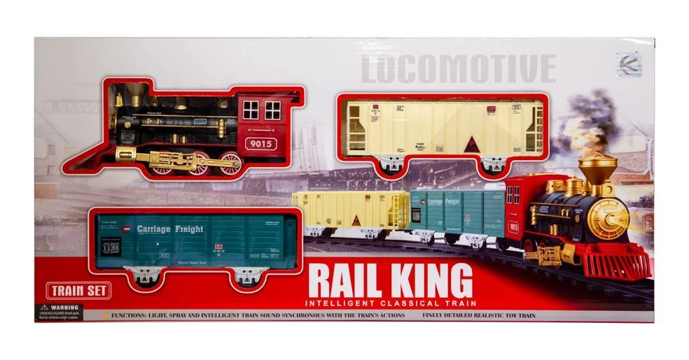 Kto z nas nie marzył kiedyś o własnej kolejce? Zabawa nią to dla dziecka znakomita okazja do pobudzenia wyobraźni i zdolności manualnych. Dla rodziców to możliwość aktywnego spędzania czasu z dzieckiem. Zestaw składa się z 8 odcinków torów, lokomotywy i dwóch wagonów. Poszczególne elementy toru bardzo łatwo się ze sobą łączą tworząc trasę w kształcie okręgu. Lokomotywa wyposażona jest w światło LED, po uruchomieniu imituje odgłosy jadącego pociągu, a dodatkowo wraz z upływem czasu przyspiesza. Najatrakcyjniejszą cechą kolejki jest możliwość wytworzenia pary wodnej. Przy pomocy dołączonej do zestawu buteleczki napełniamy wodą zbiorniczek w lokomotywie i gotowe: „para buch, koła w ruch…”, dokładnie jak w znanym każdemu wierszyku! Realistyczny wygląd i dźwięki kolejki to dodatkowa zachęta do wspaniałej zabawy. Niepowtarzalne emocje towarzyszące wykorzystaniu poszczególnych elementów zestawu to tylko wstęp do prawdziwej rodzinnej zabawy. Produkt zapakowany jest w kartonowe pudełko, które świetnie nadaje się na prezent.