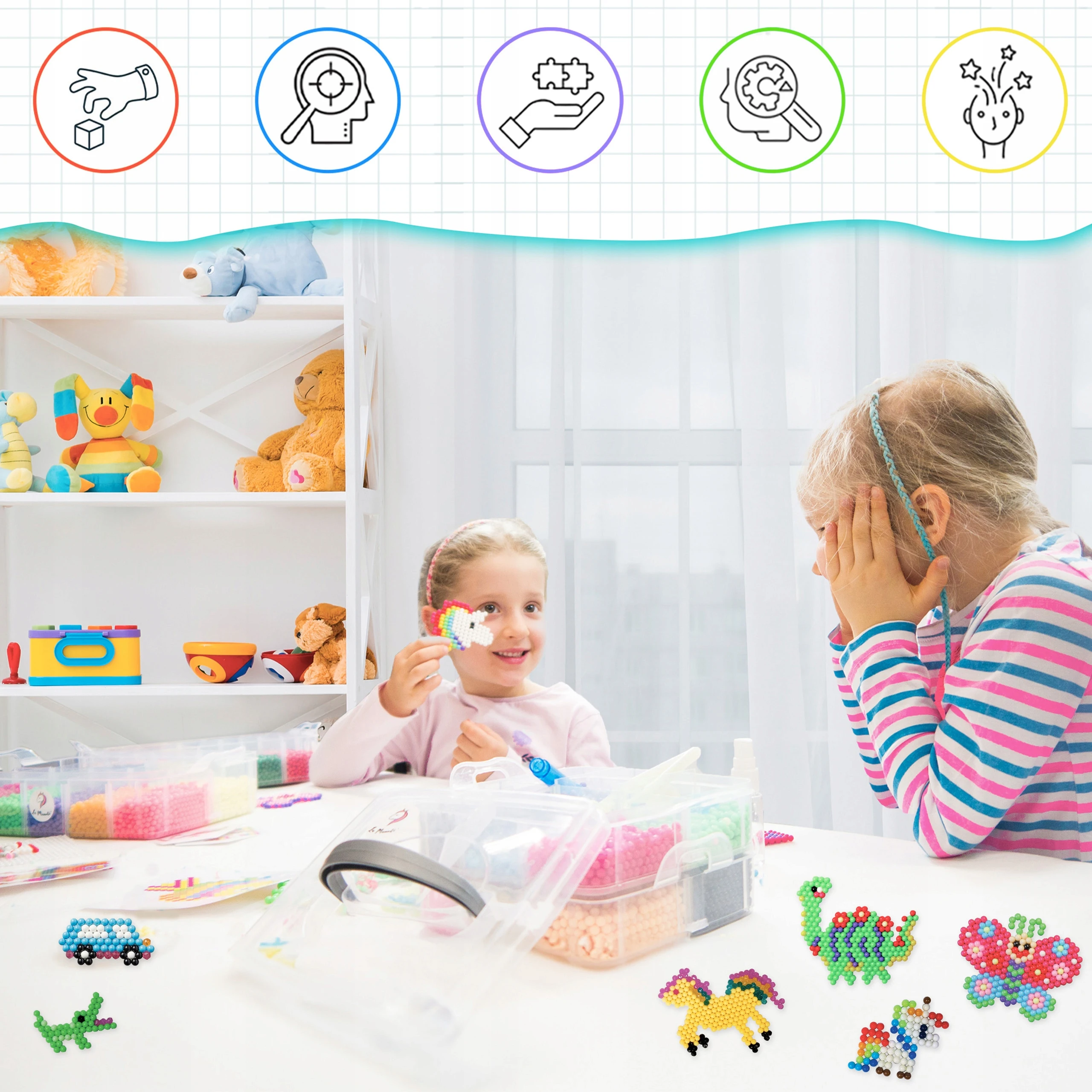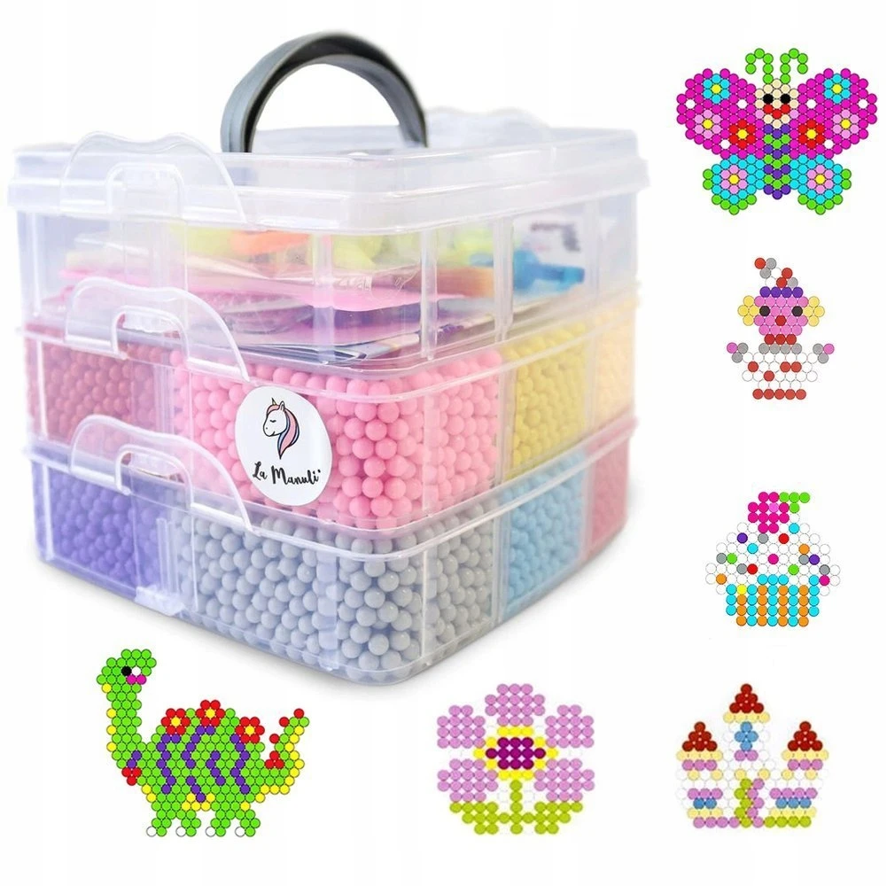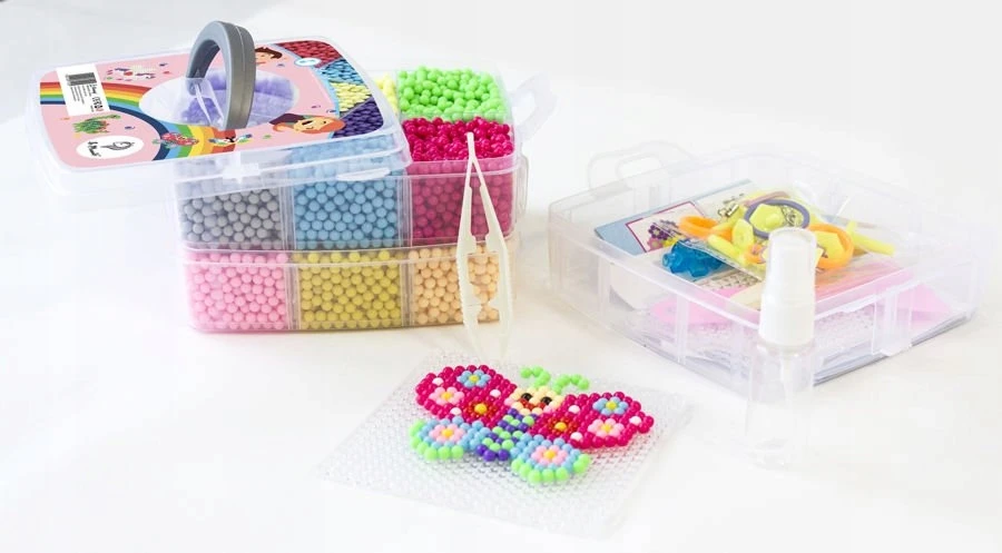 Koraliki wodne to super zabawa dla dzieci, rozwijająca kreatywność i zdolności manualne. Cały zestaw zawiera 10000 koralików, 3 podkładki, 6 szablonów, spryskiwacz, zawieszki, pincetę, pędzelek oraz aplikator.