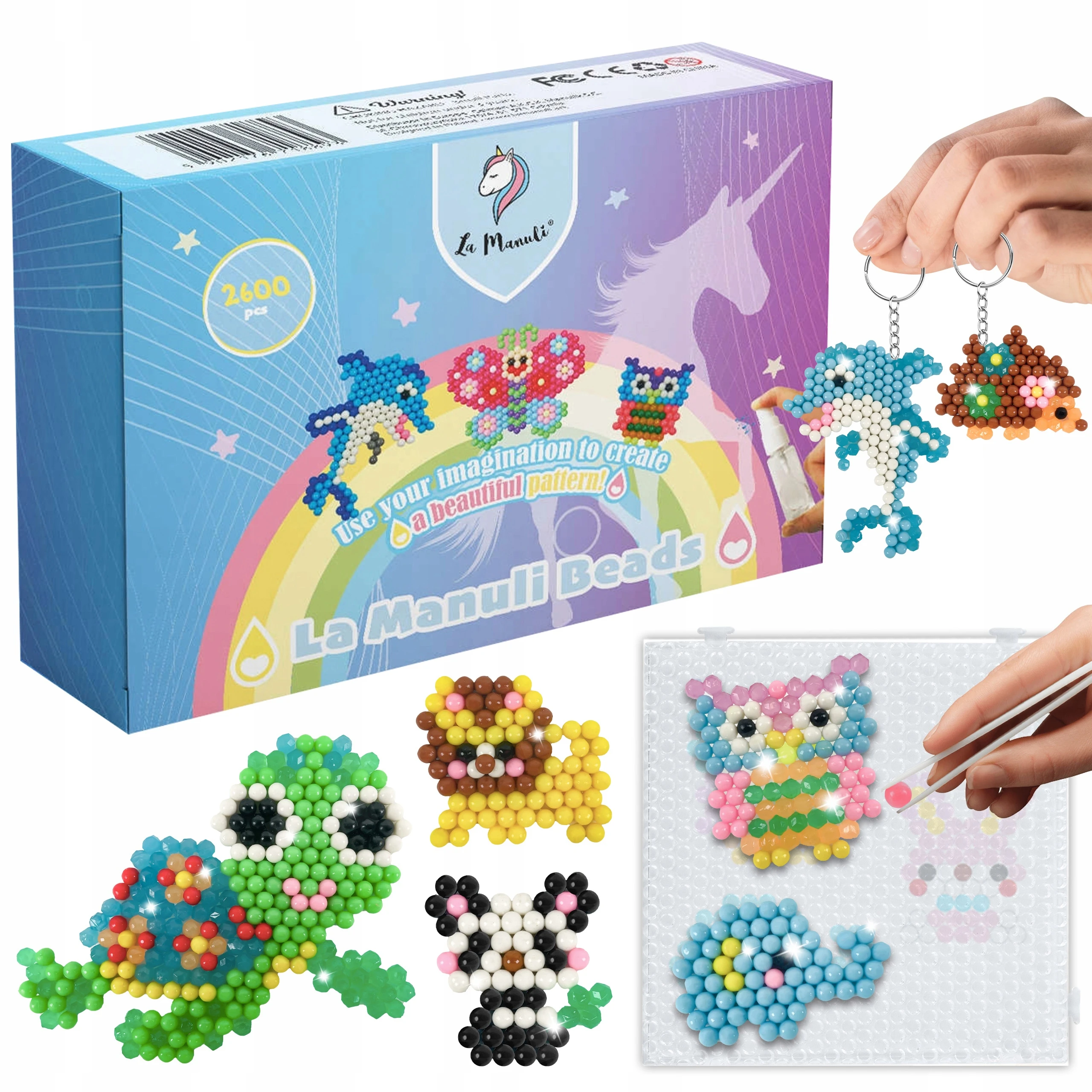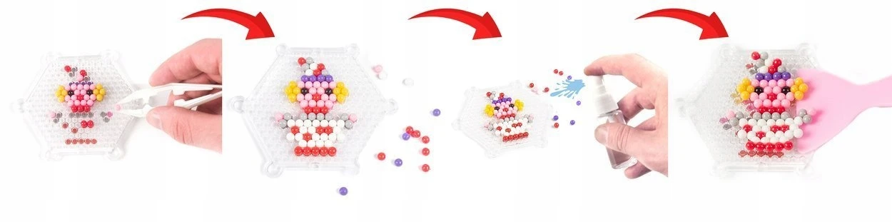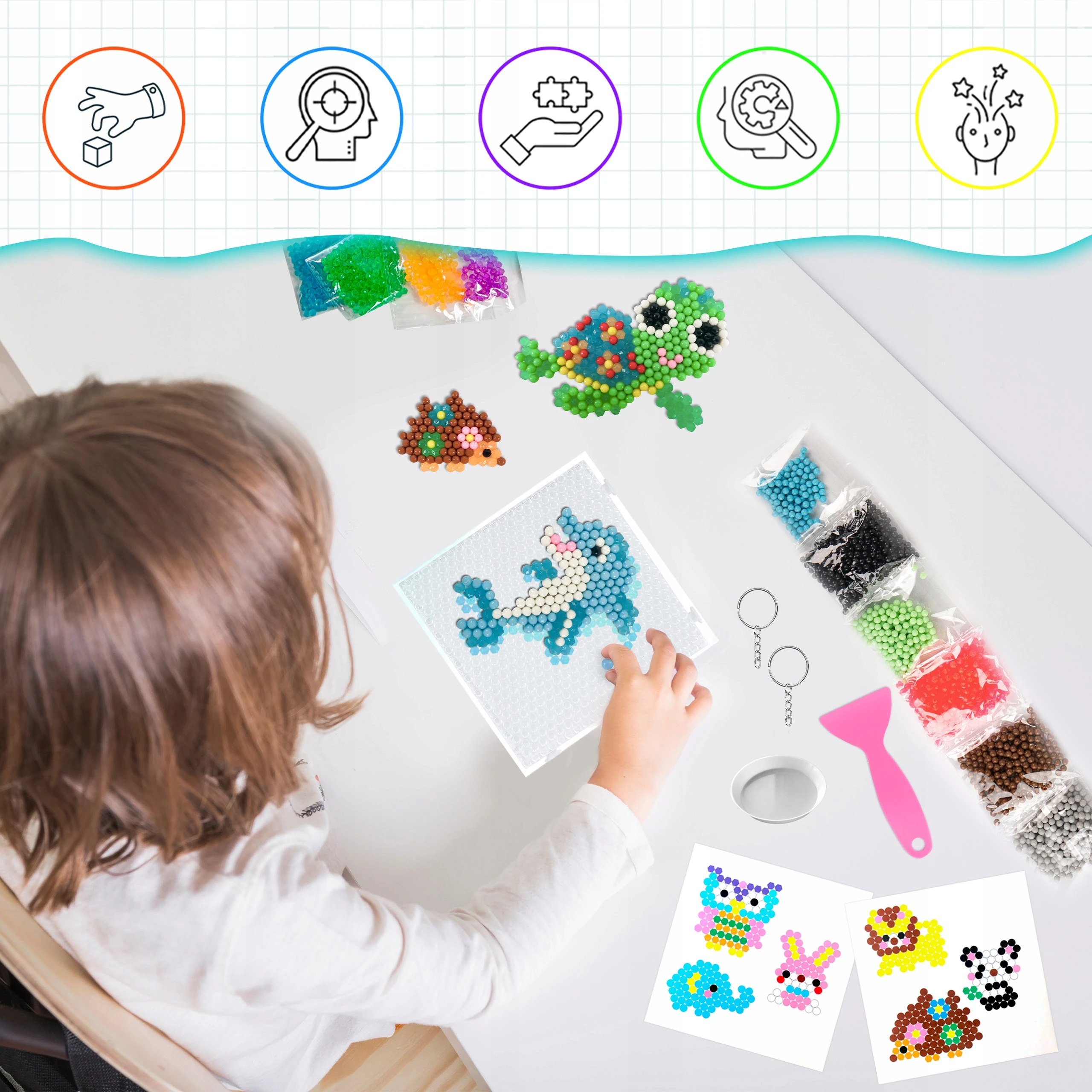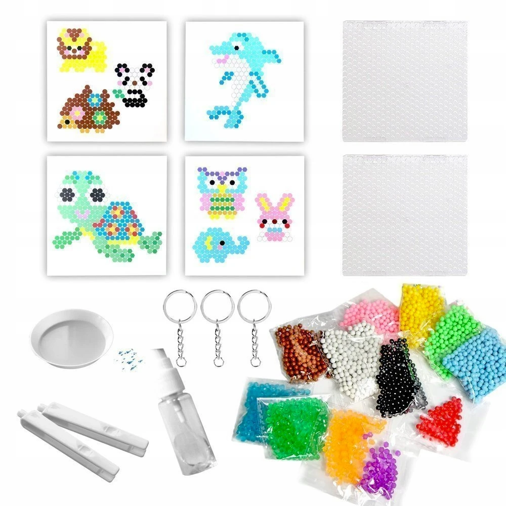 Pudełko pełne kuleczek, które łączą się ze sobą po spryskaniu ich wodą. To super zabawa dla dzieci, rozwijająca kreatywność i zdolności manualne. 2600 koralików, 2 podkładki, 4 szablony