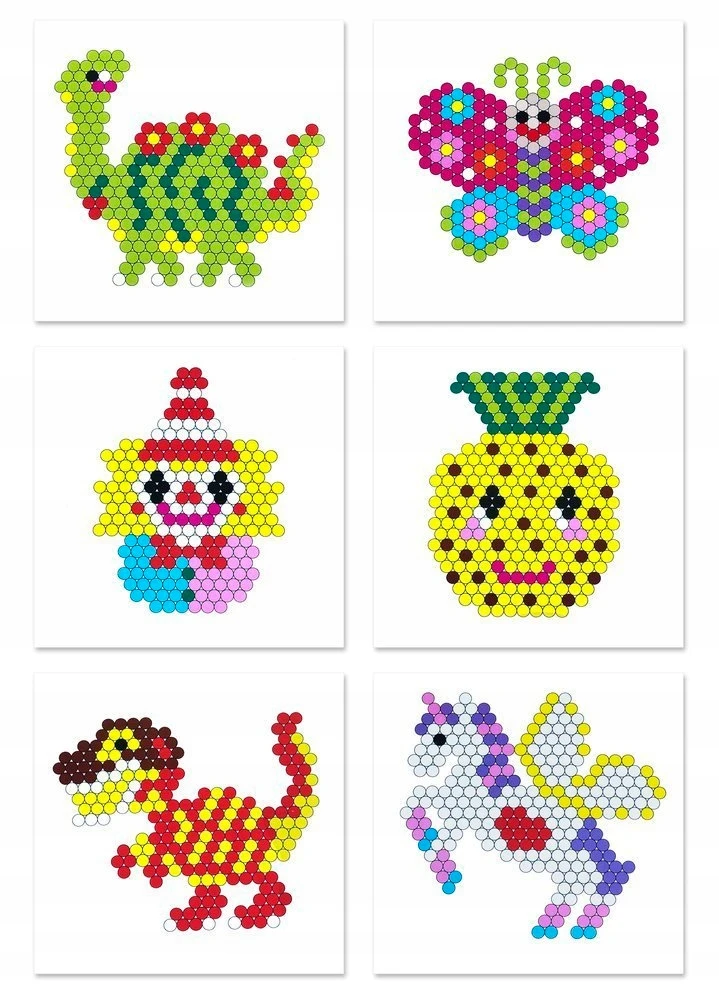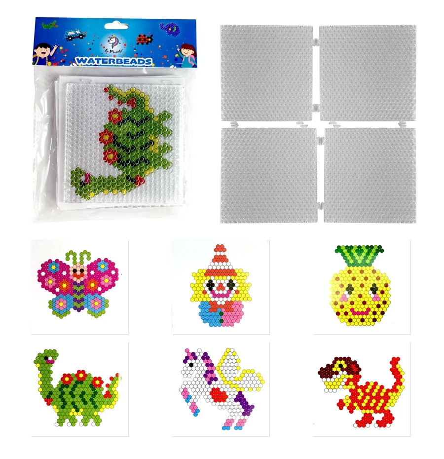 Zestaw 4 przezroczystych podkładek do układania koralików wodnych + 6 gotowych szablonów graficznych. Kompatybilne z 5mm koralikami wodnymi - m.in. Aquabeads, La Manuli.