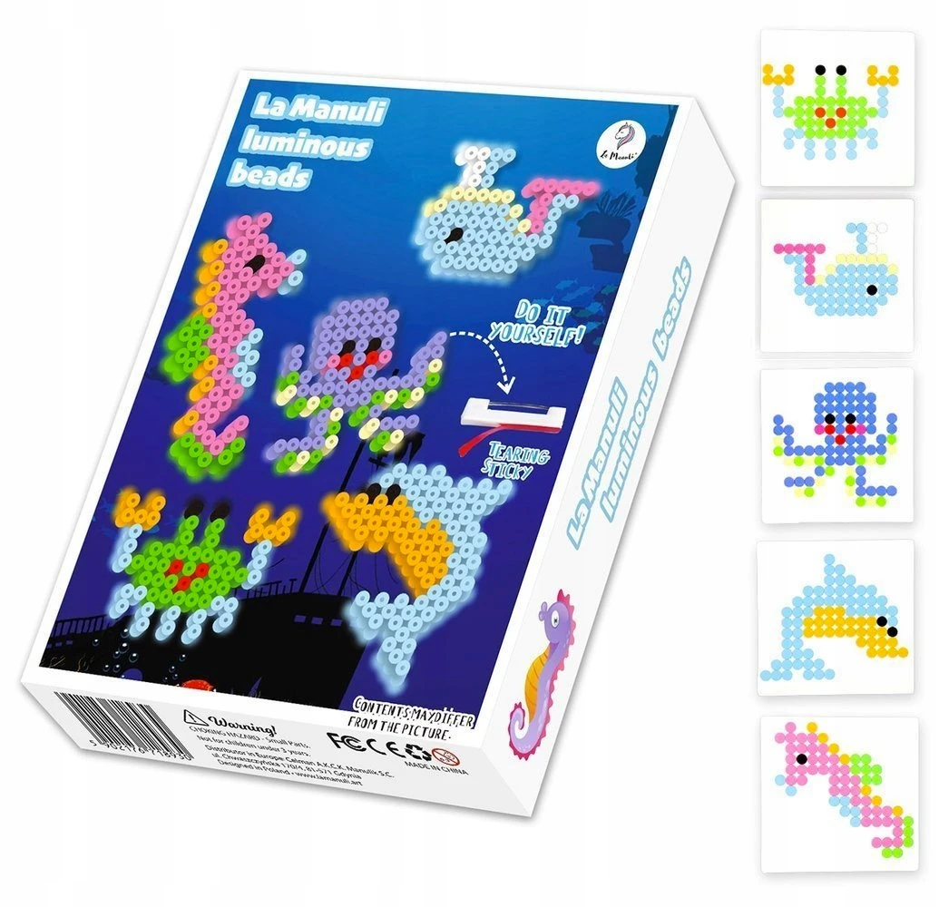 Zestaw zwierzątek z koralików do prasowania świecących w ciemności. W zestawie aż 5 wzorów zwierzątek morskich do ułożenia oraz akcesoria do stworzenia broszek i zawieszek.