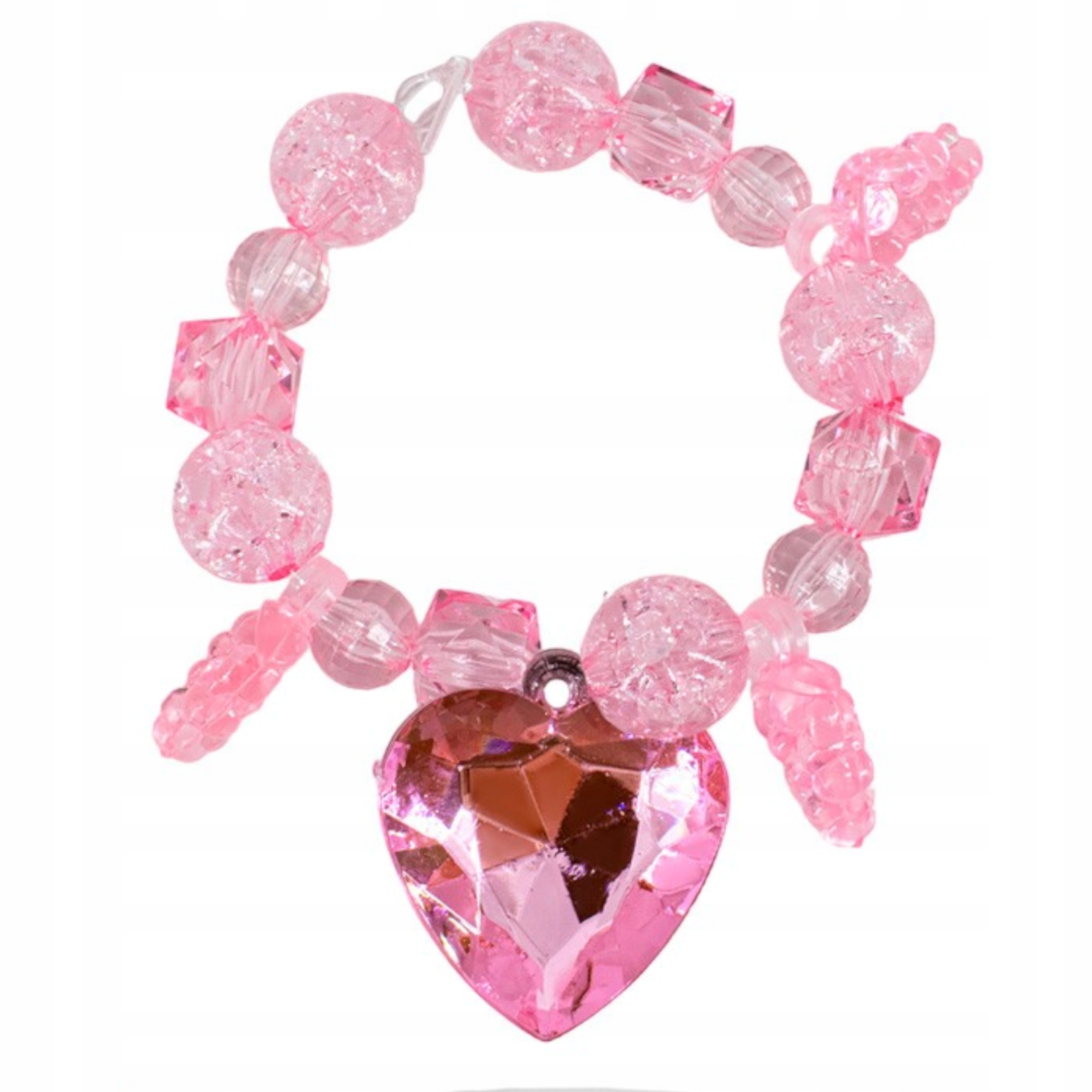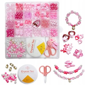 Zestaw zawiera wszystko co potrzebne do rozpoczęcia zabawy w tworzenie biżuterii: wiele różnych koralików, zawieszki w kształcie serc, nożyczki oraz przezroczystą żyłkę. Wszystkie elementy spakowane są w poręczne plastikowe pudełko.