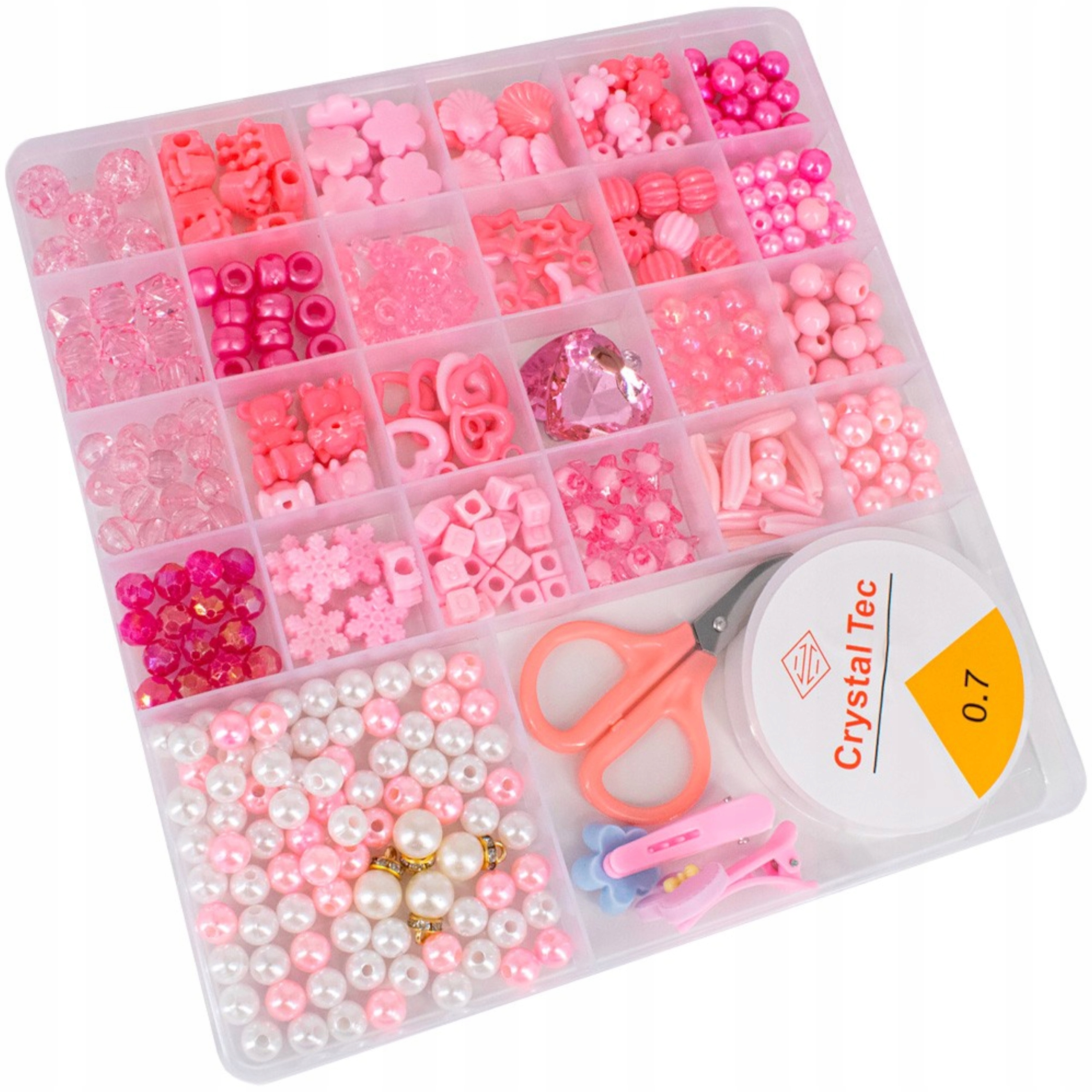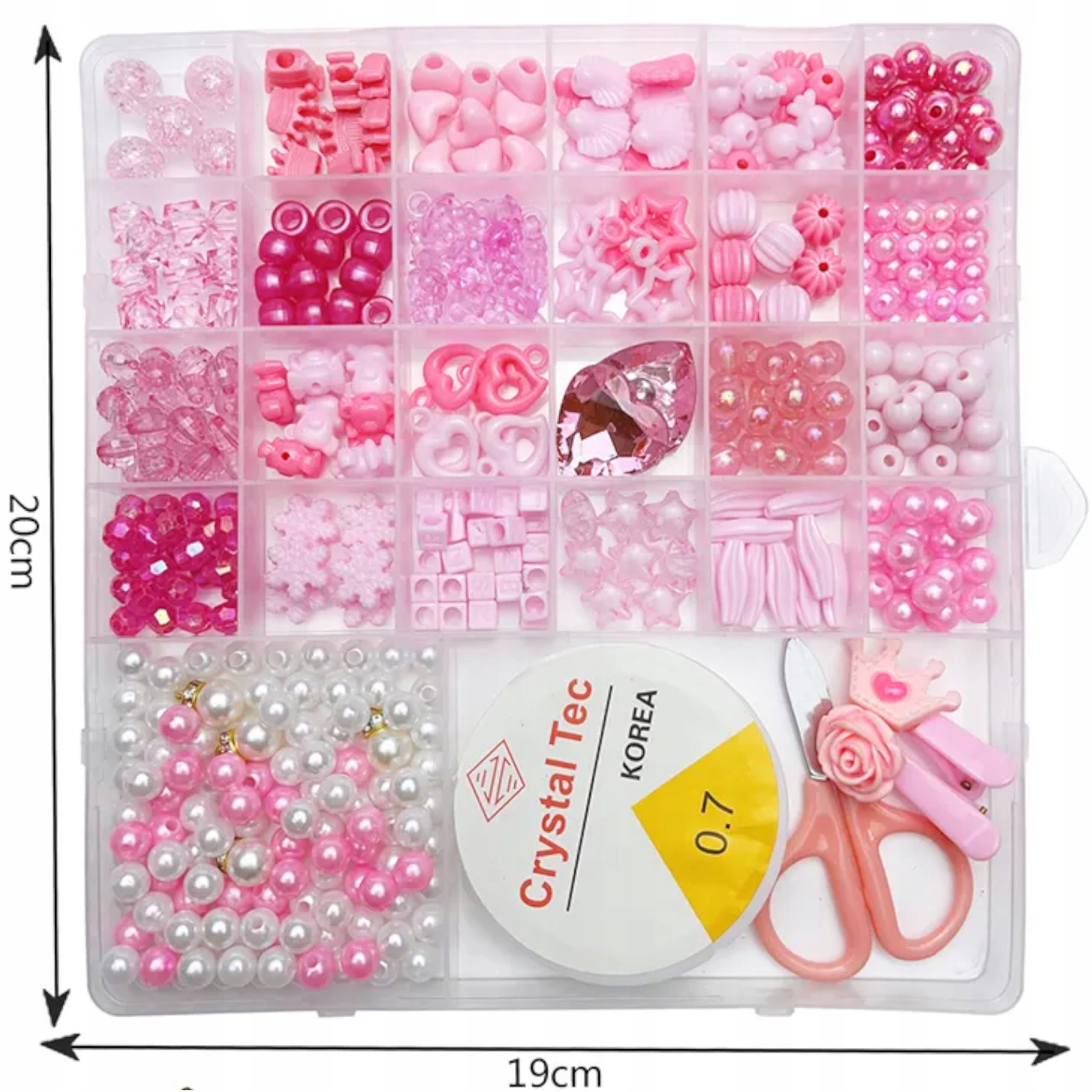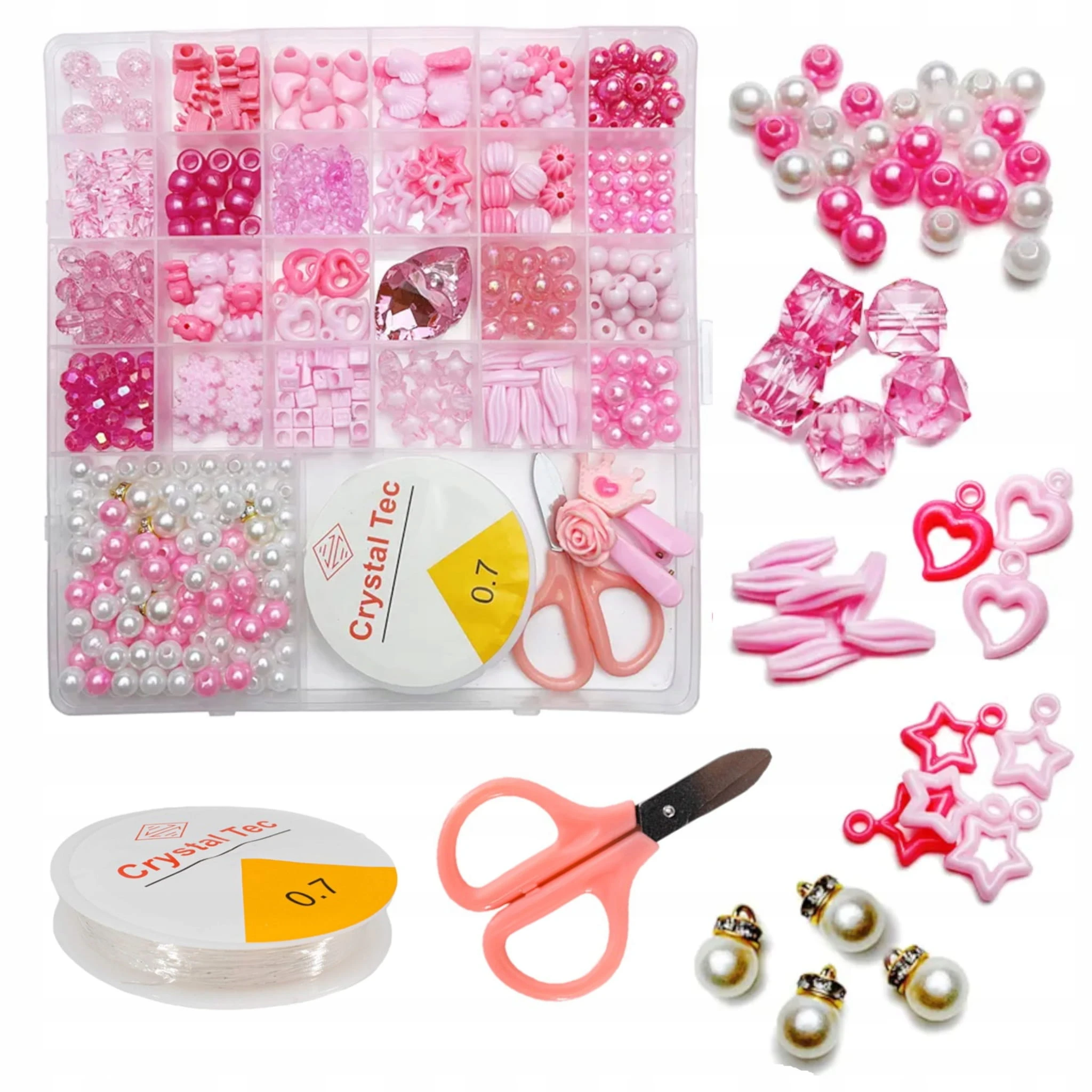 Kreatywny zestaw zawiera około 300 elementów, co pozwoli na wykonanie wielu różnych elementów biżuterii takich jak bransoletki czy naszyjniki. W komplecie są także nożyczki i żyłka do nawlekania koralików, dzięki czemu zawiera wszystko co potrzebne, aby zacząć tworzyć własne projekty.
