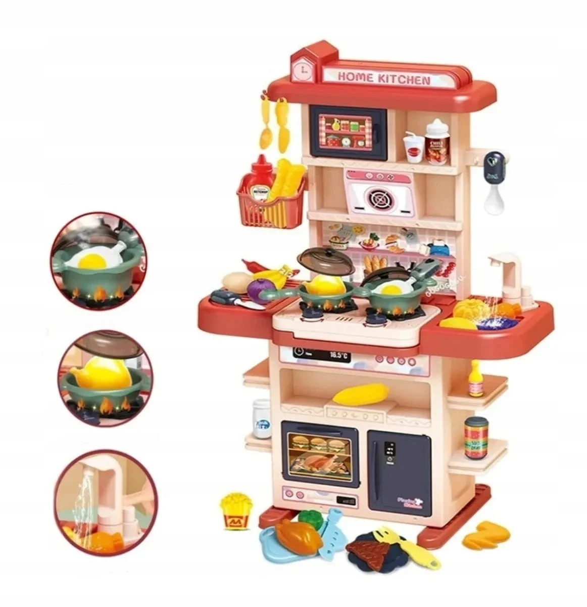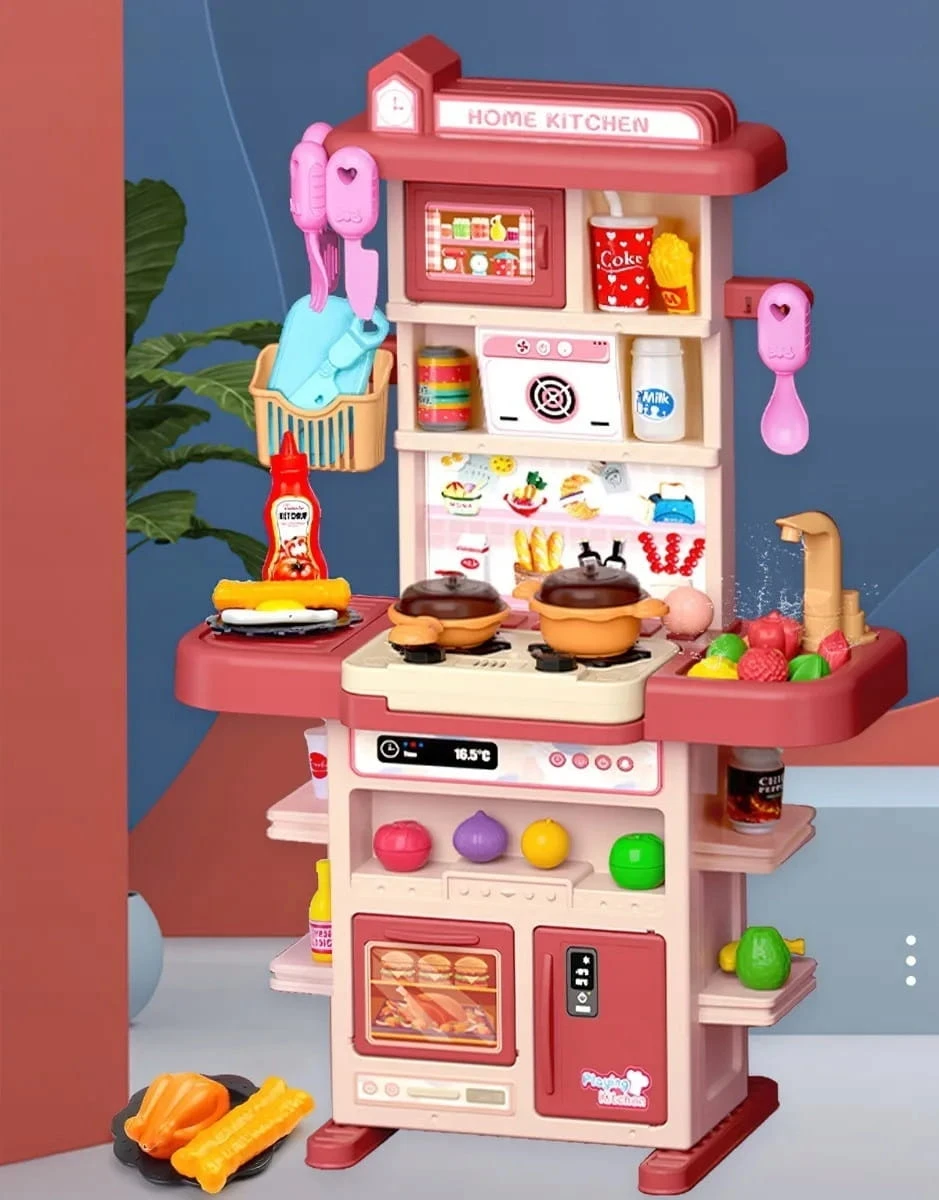 Kuchnia dla dzieci palniki para kran z wodą lodówka artykuły domowe gotowanie