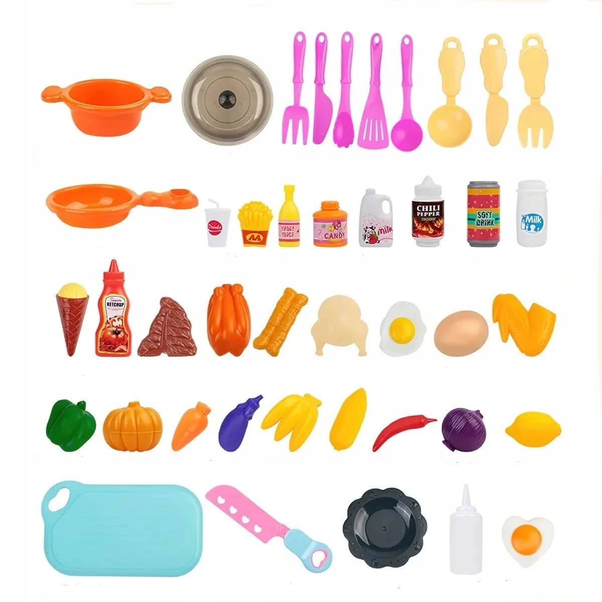 Zestaw zawiera garnki i sztućce, warzywa, owoce czy opakowania kartonowe imitujące produkty mleczne.