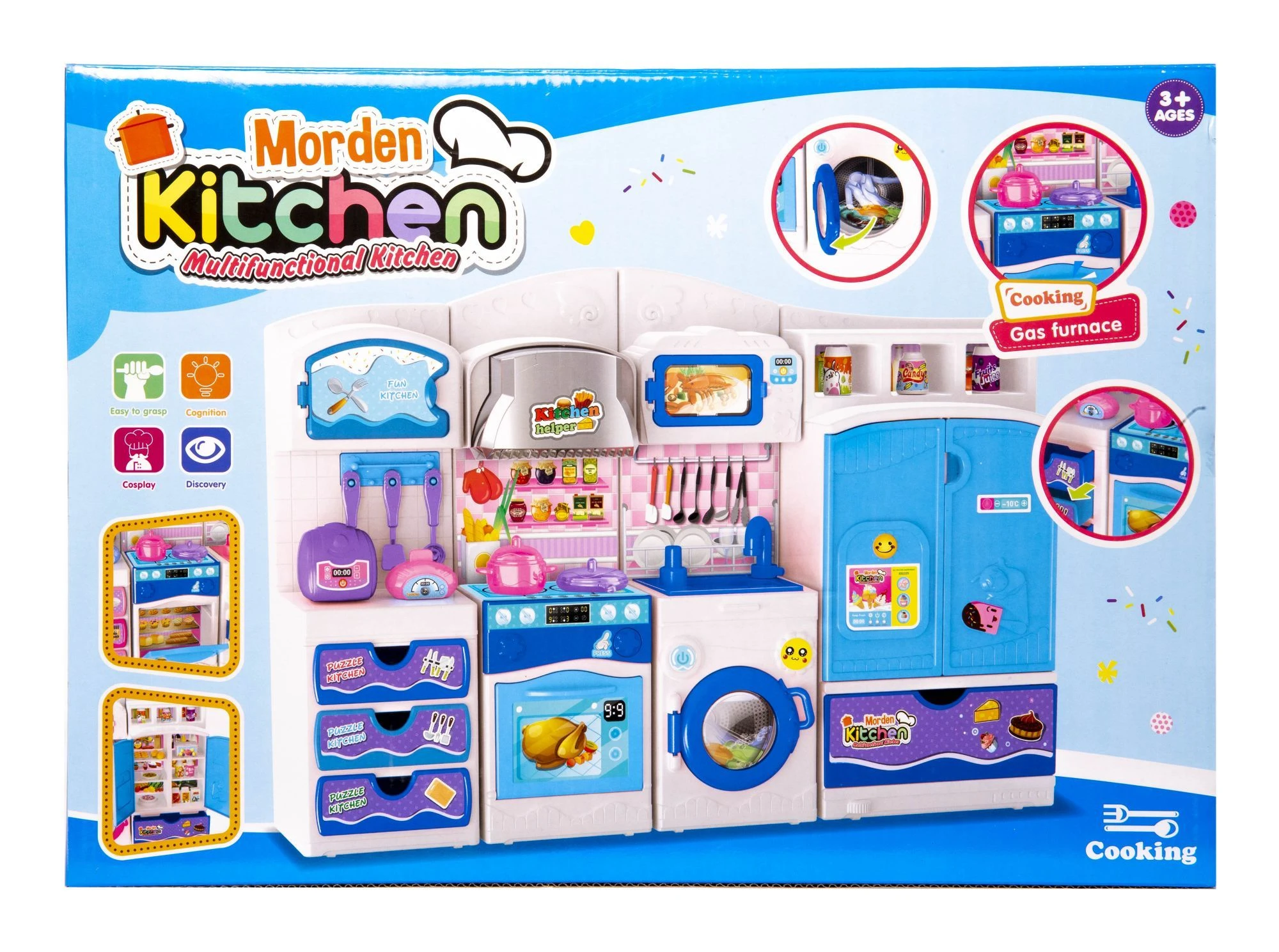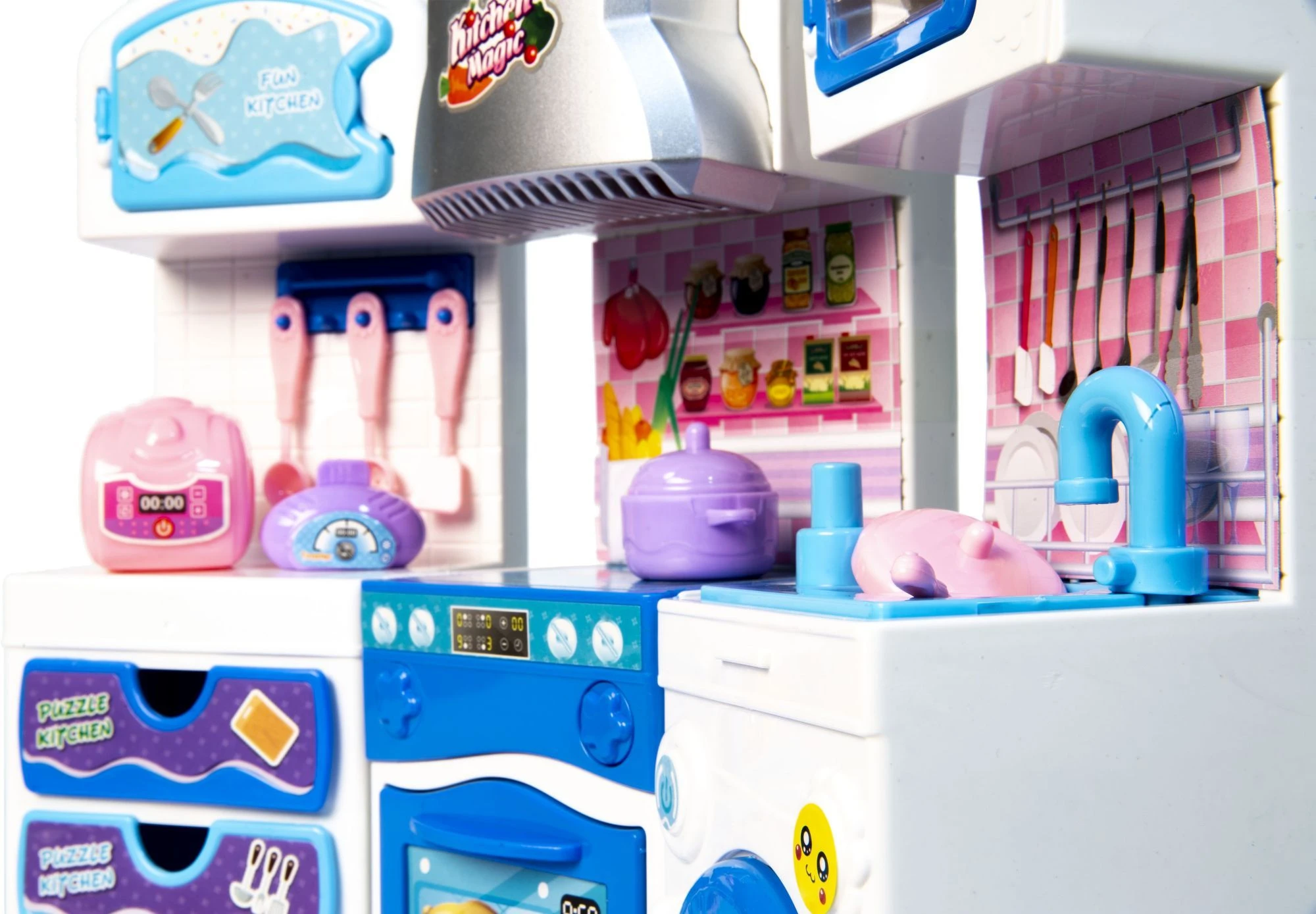 Zestaw mebelków i akcesoriów kuchennych dla lalek. Mebelki składają się z 4 osobnych modułów które w dowolny sposób można zestawiać. Poszczególne partie mebelków wyposażone są w niezbędne akcesoria kuchenne, takie jak garnki czy sztućce i inne potrzebne wyposażenie każdej kuchni.