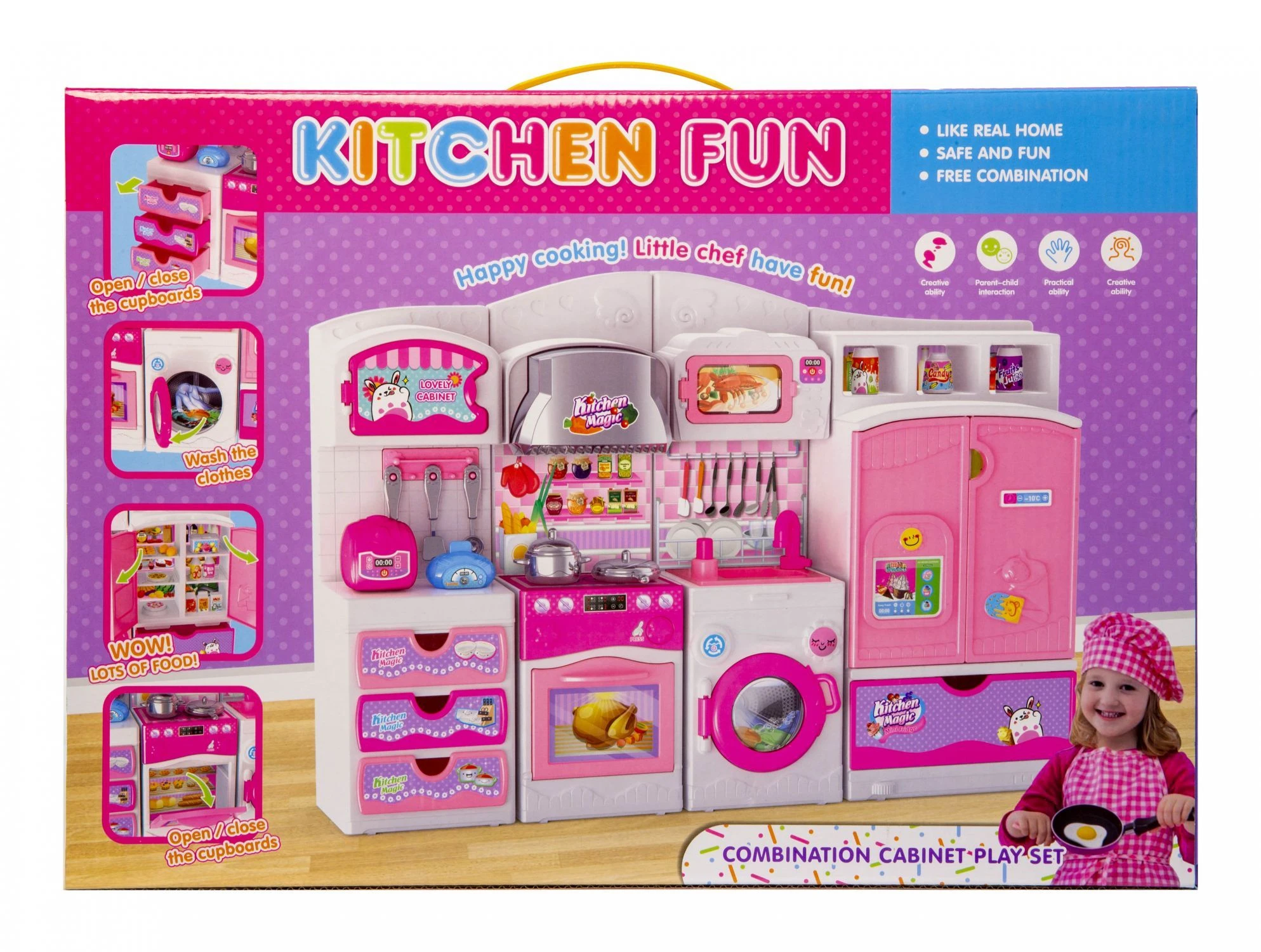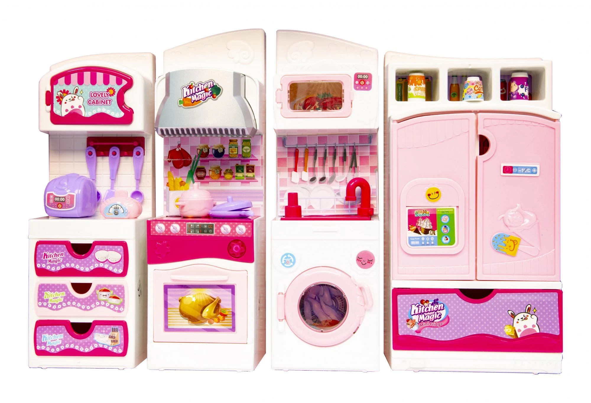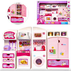 Zestaw mebelków i akcesoriów kuchennych dla lalek. Mebelki składają się z 4 osobnych modułów które w dowolny sposób można zestawiać. Poszczególne partie mebelków wyposażone są w niezbędne akcesoria kuchenne, takie jak garnki czy sztućce i inne potrzebne wyposażenie każdej kuchni.