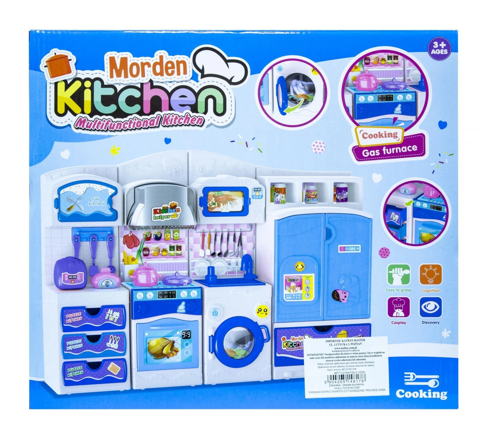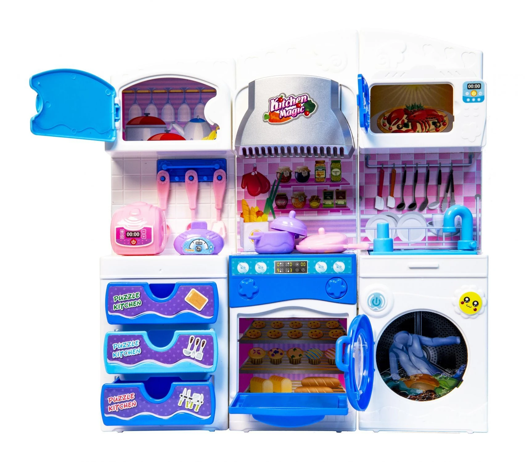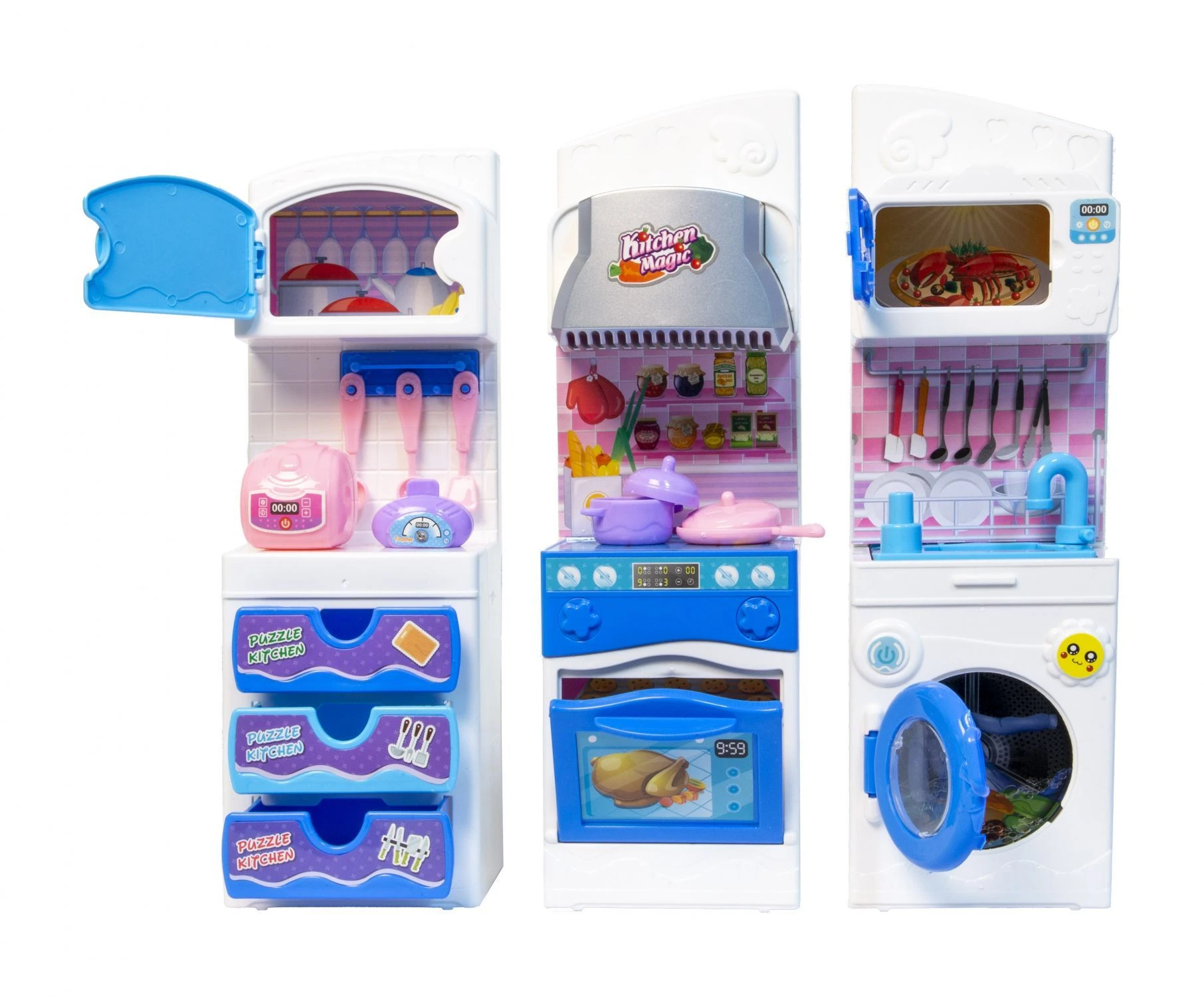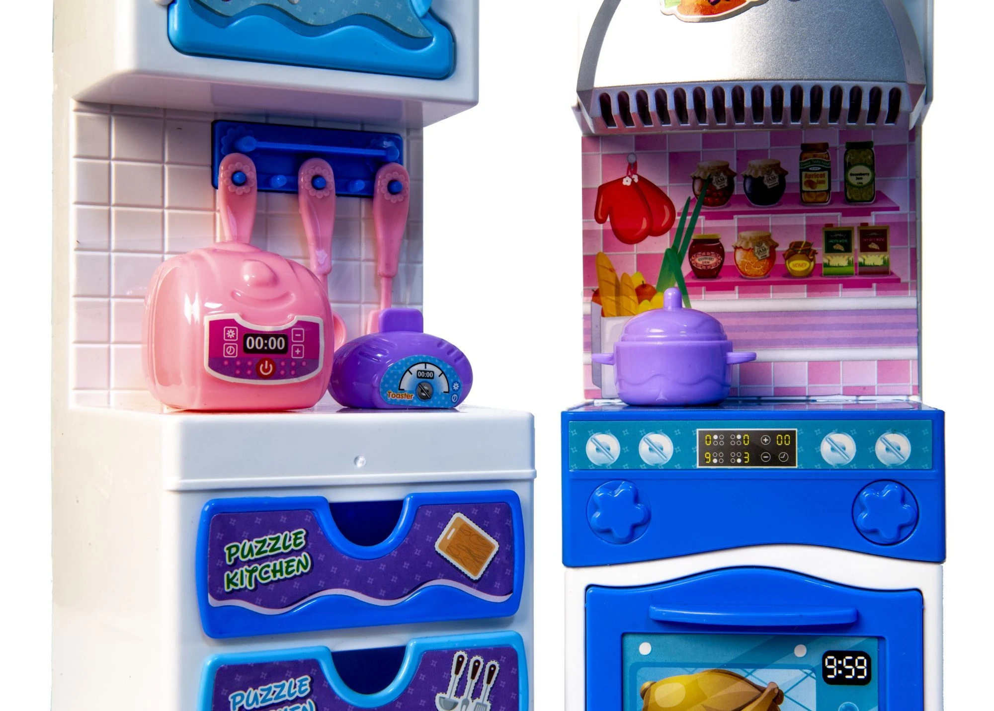 Zestaw mebelków i akcesoriów kuchennych dla lalek. Mebelki składają się z 3 osobnych modułów które w dowolny sposób można zestawiać. Poszczególne partie mebelków wyposażone są w niezbędne akcesoria kuchenne, takie jak garnki czy sztućce i inne potrzebne wyposażenie każdej kuchni.