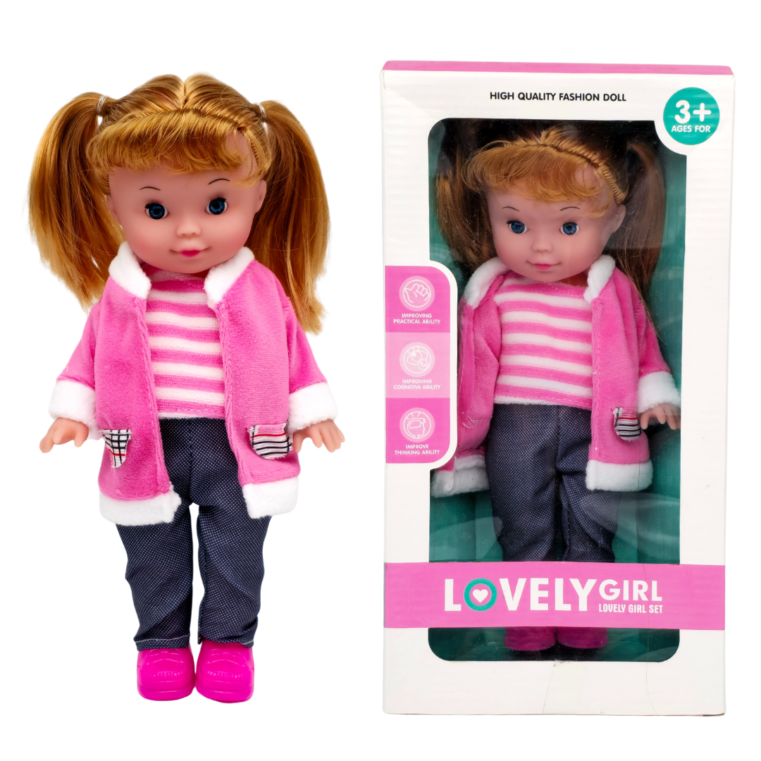 Urocza lalka o wysokości około 26 cm z rudymi kiteczkami i grzywką, ubrana jest w modny zestaw ubranek. Będzie ona doskonałym pomysłem na prezent dla każdej miłośniczki lal.