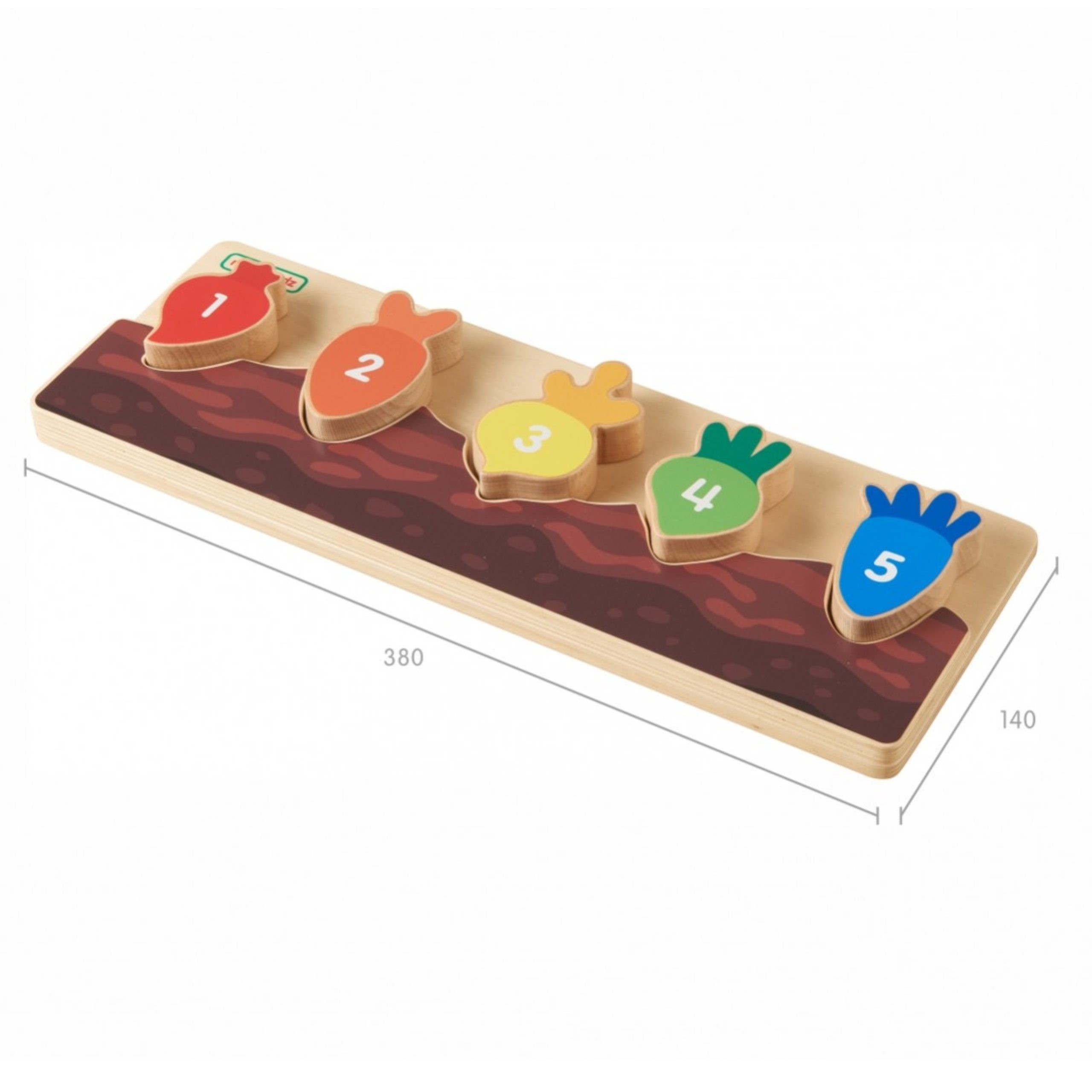 - - 5 x Kolorowe warzywa korzeniowe (m.in. marchewka, burak, rzepa) w kolorach: czerwonym, pomarańczowym, żółtym, zielonym i niebieskim. Każde warzywo posiada wyraźny nadruk cyfry, co wprowadza element nauki liczenia.