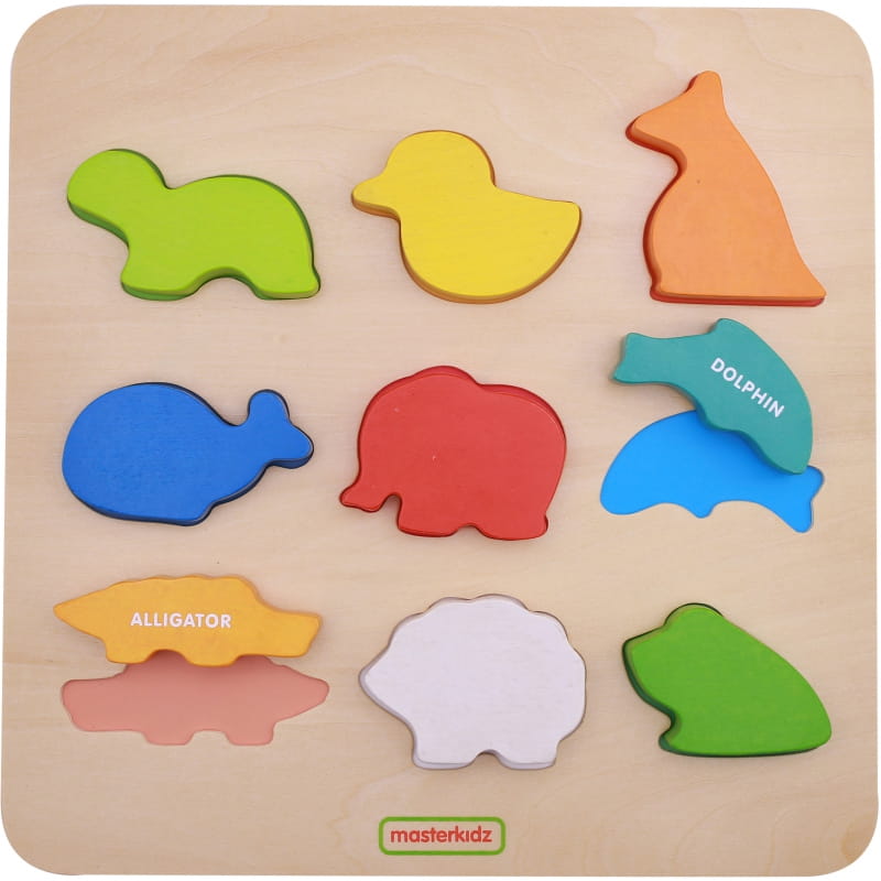 Wspaniała drewniana zabawka sensoryczna dla dzieci marki MASTERKIDZ, która polega na dopasowaniu klocków z kolorowymi zwierzątkami do otworów o odpowiednim kształcie. W zestawie 9 kolorowych klocków, oraz tablica z otworami, w których należy umieścić zwierzątka. Zabawa sorterem kształtów pozwala dziecku na rozwinięcie zdolności logicznego myślenia, a także poprawienie umiejętności motorycznych.