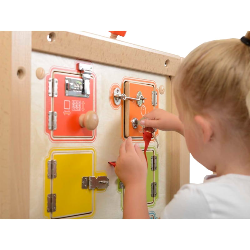 Otwieranie i zamykanie zamków to nie łatwe zadanie dla Twojego dziecka! Dlatego fantastyczna tablica ścienna marki Masterkidz jest gotowym rozwiązaniem do zdobywania tej umiejętności. Tablica składa się z drewnianej płyty oraz 6 mini-sejfów, na których można ćwiczyć. Niektóre z nich Twoje dziecko otworzy bez problemu, z kolei inne będą stanowić duże wyzwanie. Jest to jedna z zabawek, która nie pozwala odejść dziecku dopóki nie osiągnie celu.