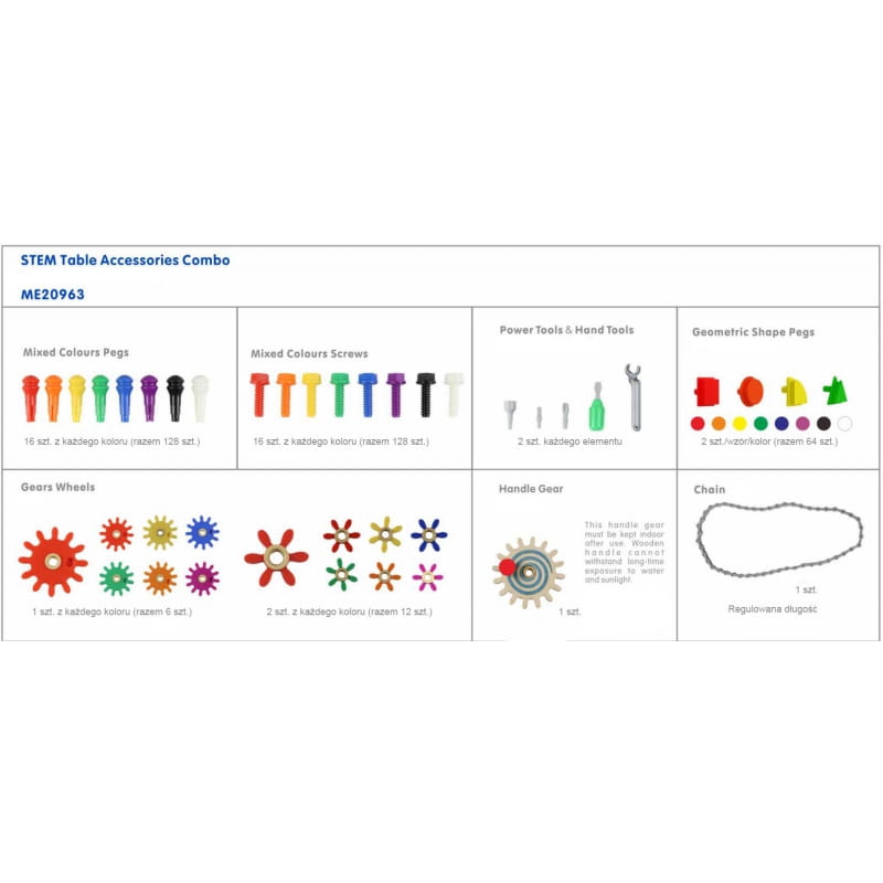 Zestaw Akcesoriów STEM od marki Masterkidz zawiera w sobie podstawowe akcesoria do zabawy z systemem STEM Masterkidz. Znajdziemy w nim 128 szt. kołeczków, 128 szt. śrubek, 64 szt. kołeczków geometrycznych, 2 zestawy narzędzi, 18 szt. kół zębatych, koło z uchwytem oraz łańcuch. Zestaw ten jest zaprojektowany do kreatywnej zabawy i poznawania świata nauki poprzez eksperymentowanie i konstruowanie. Dzieci mogą używać tych akcesoriów do tworzenia różnorodnych wzorów i konstrukcji, co rozwija ich zdolności manualne, logiczne myślenie oraz zrozumienie podstawowych zasad mechaniki i inżynierii. Ten zestaw to doskonały start dla zabawy z systemem STEM od Masterkidz. Jest kompatybilny zarówno z tablicami ściennymi, jak i wolnostojącymi, przy czym do rozpoczęcia zabawy wymagana jest jedna z nich.