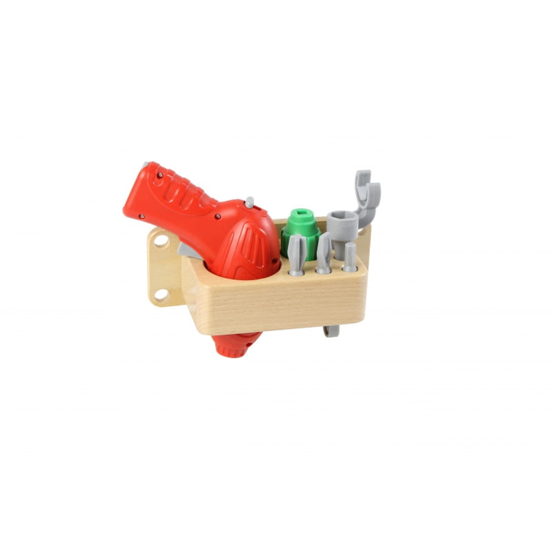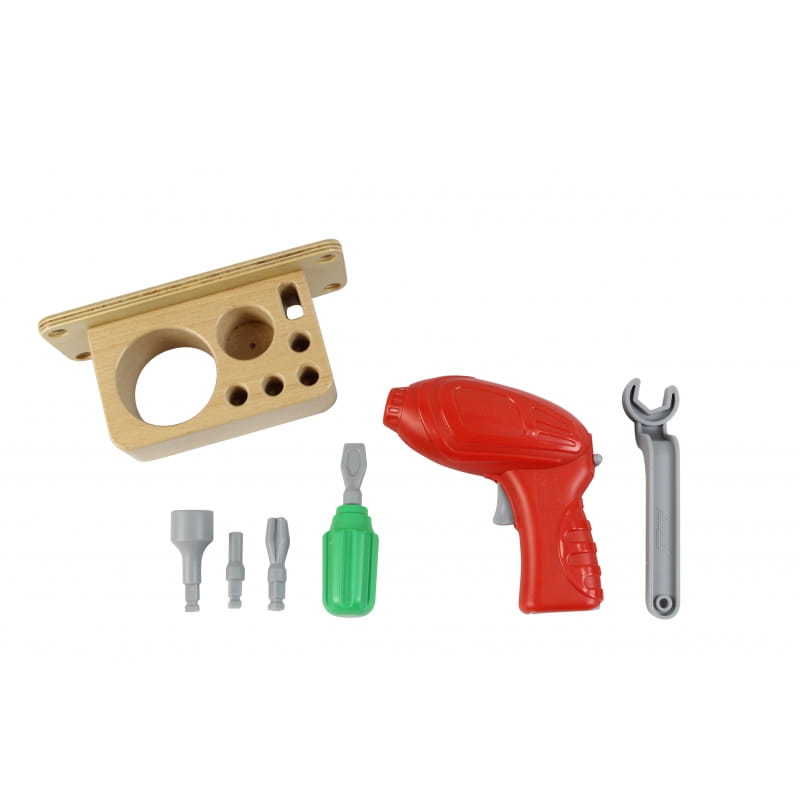 - - W zestawie ręcznych narzędzi do ścianki Naukowo-Kreatywnej Masterkidz, znajduje się śrubokręt z 4 wymiennymi końcówkami, klucz, wkrętarka (z lampką ułatwiającą wkręcanie), oraz półeczka do przechowywania.
