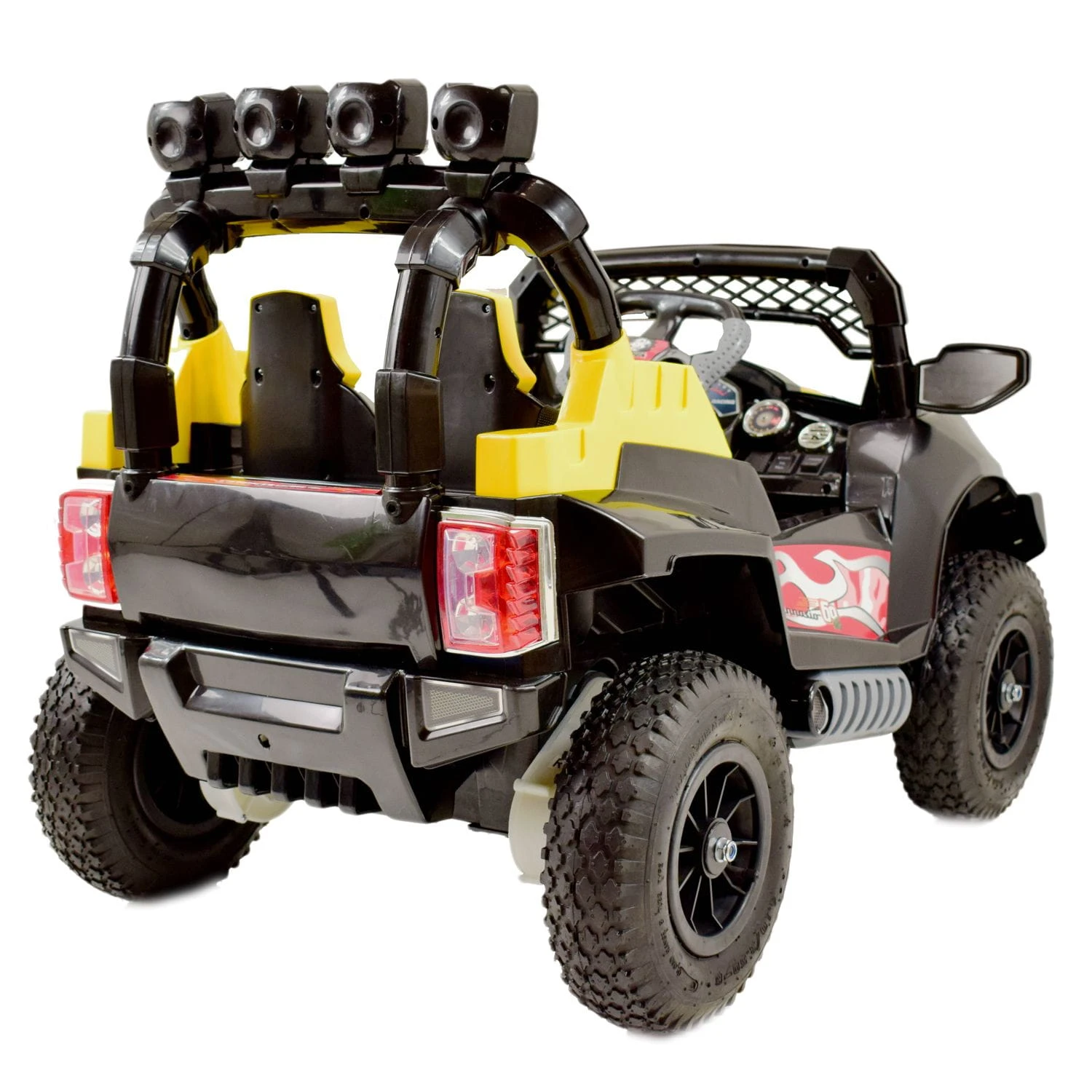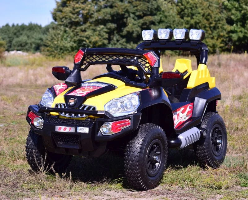 wejście MP3, wgrane piosenki w pamięć, 3 prędkości jazdy z pilota, duże pompowane koła, uruchamiany za pomocą kluczyka, amortyzatory na 4 kołach