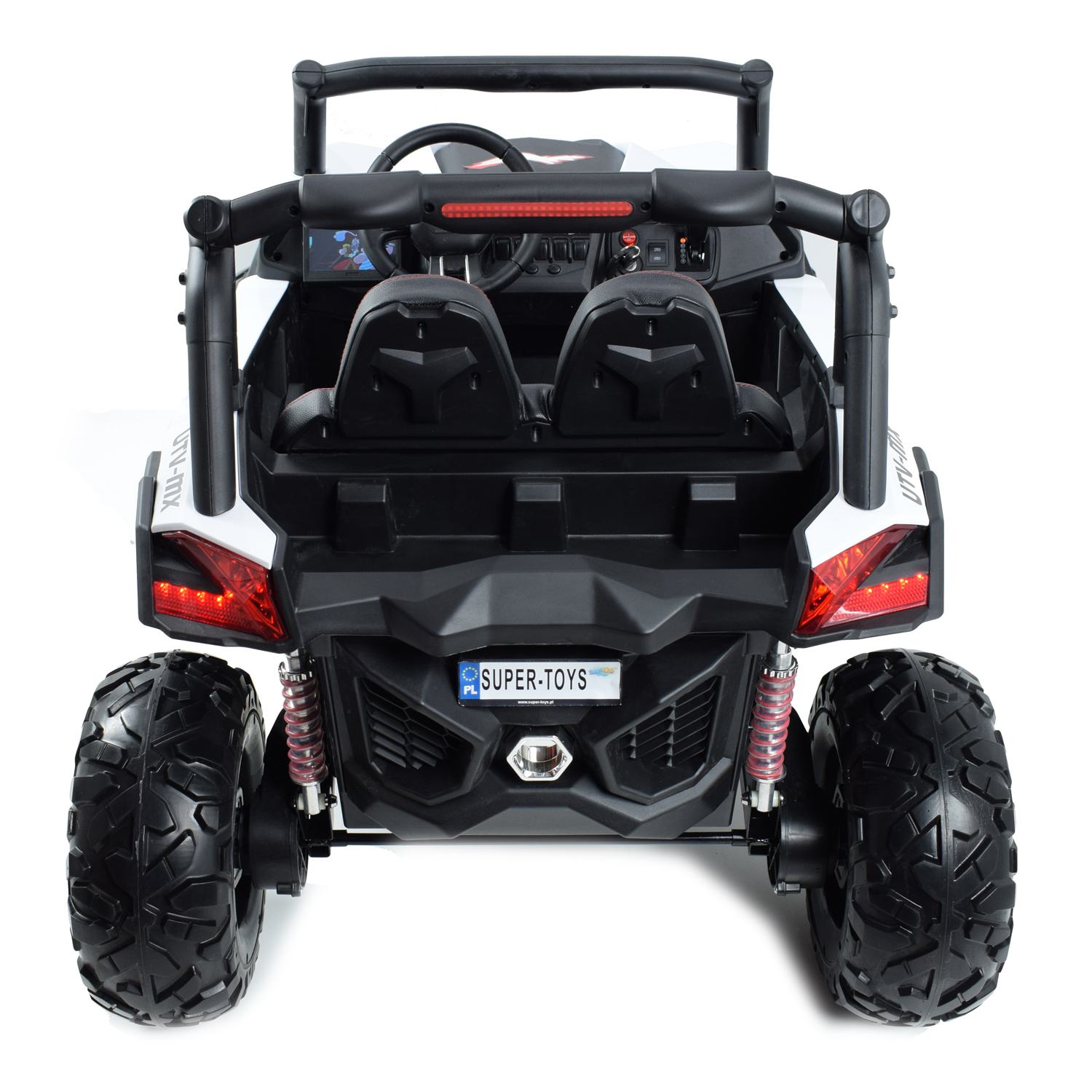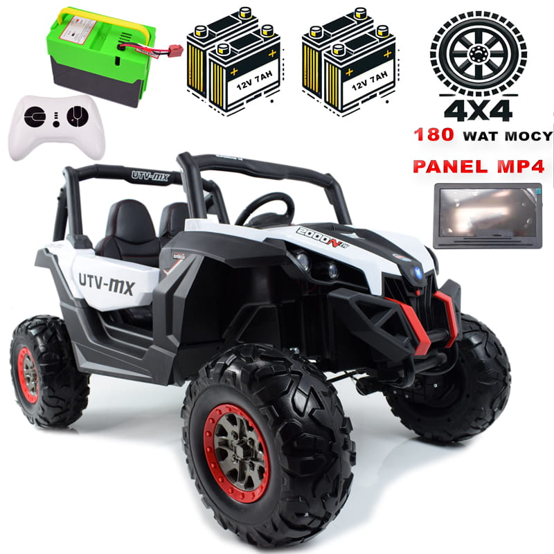 AUTO MEGA BUGGY 2 OSOBOWY Z PANELEM MP4, NAPĘDEM 4X4 z systemem ESW - system wolnego startu, hamulcem oraz z kołami EVA i miękkim siedzeniem zasilany na dwa akumulatory 12 V z napędem na cztery koła zachwyci nie jednego przyszłego kierowcę. Dzięki zastosowanym najmocniejszym silnikom 45 W, auto jeździ po nierównym terenie bez żadnych problemów - posiada olbrzymie miękkie koła EVA, Najciekawszą funkcją pojazdu jest SYSTEM WOLNEGO STARTU, oraz SYSTEM HAMOWANIA Z PILOTA Z FUNKCJĄ BLOKADY JAZDY MANUALNEJ - poprzez przytrzymanie przycisku STOP
