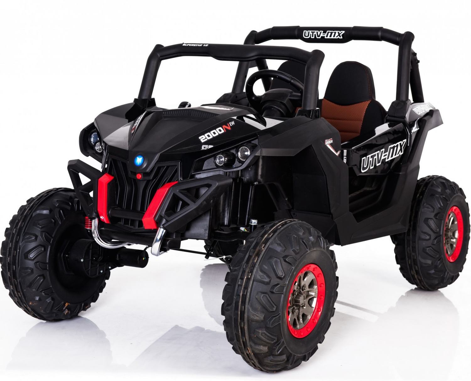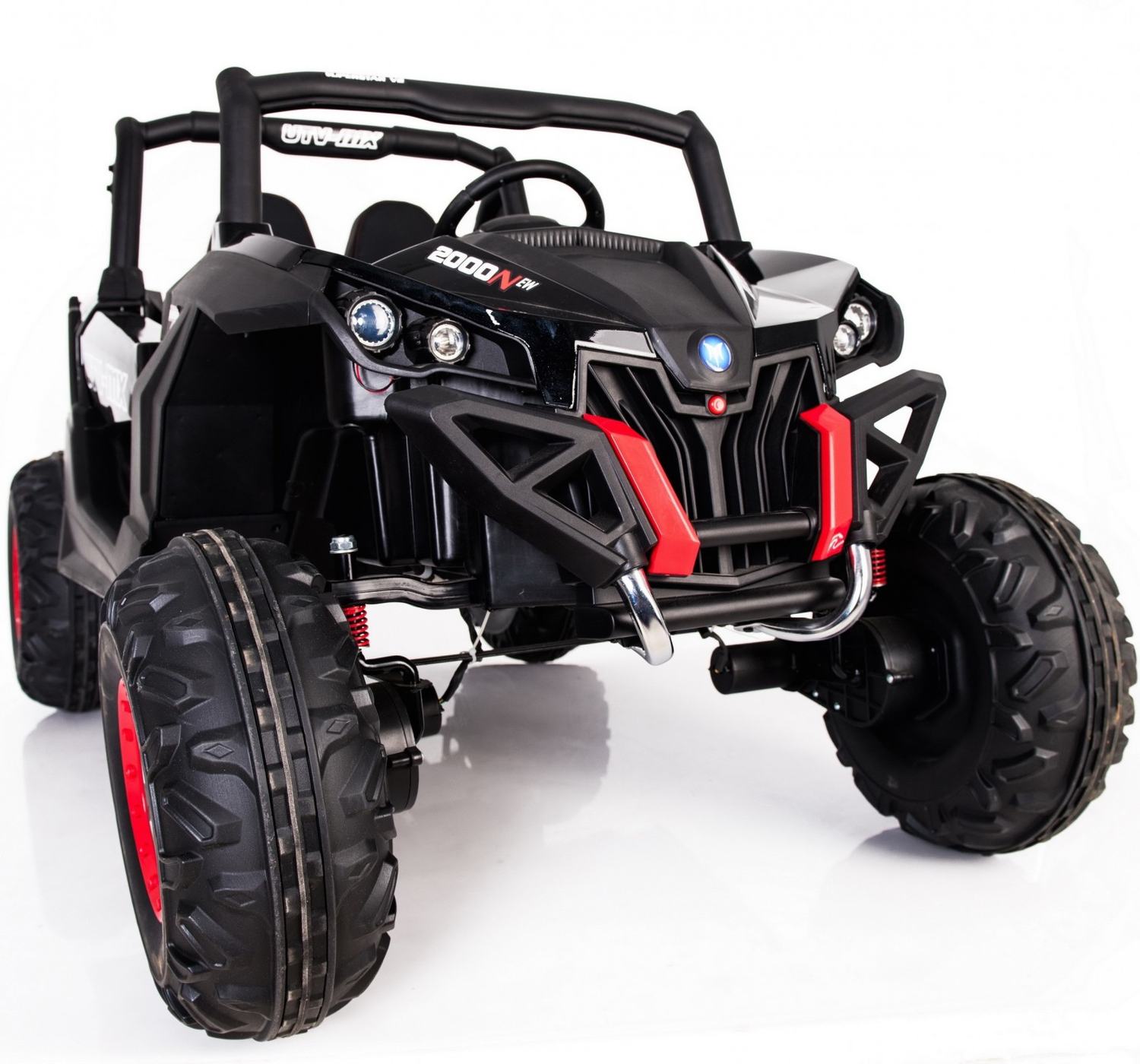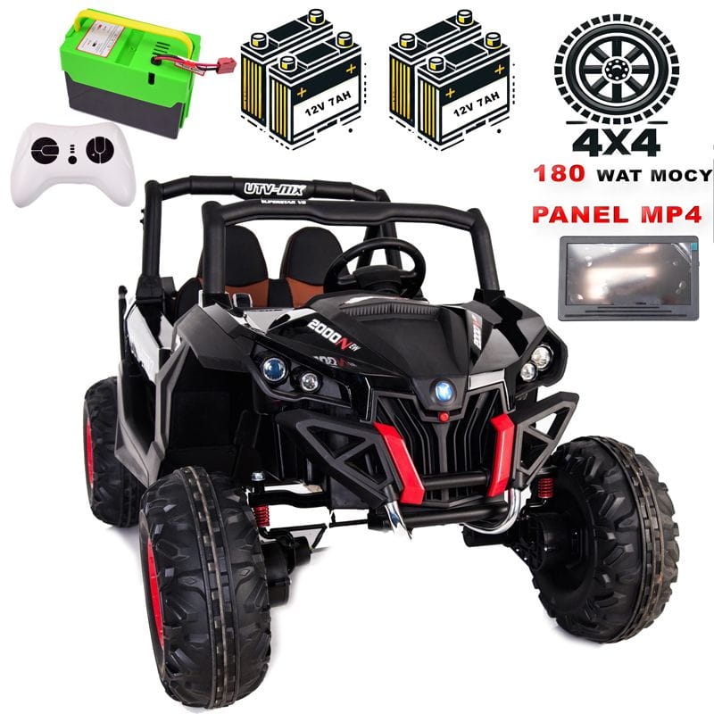 AUTO MEGA BUGGY 2 OSOBOWY Z PANELEM MP4, NAPĘDEM 4X4 z systemem ESW - system wolnego startu, hamulcem oraz z kołami EVA i miękkim siedzeniem zasilany na dwa akumulatory 12 V z napędem na cztery koła zachwyci nie jednego przyszłego kierowcę. Dzięki zastosowanym najmocniejszym silnikom 45 W, auto jeździ po nierównym terenie bez żadnych problemów - posiada olbrzymie miękkie koła EVA, Najciekawszą funkcją pojazdu jest SYSTEM WOLNEGO STARTU, oraz SYSTEM HAMOWANIA Z PILOTA Z FUNKCJĄ BLOKADY JAZDY MANUALNEJ - poprzez przytrzymanie przycisku STOP