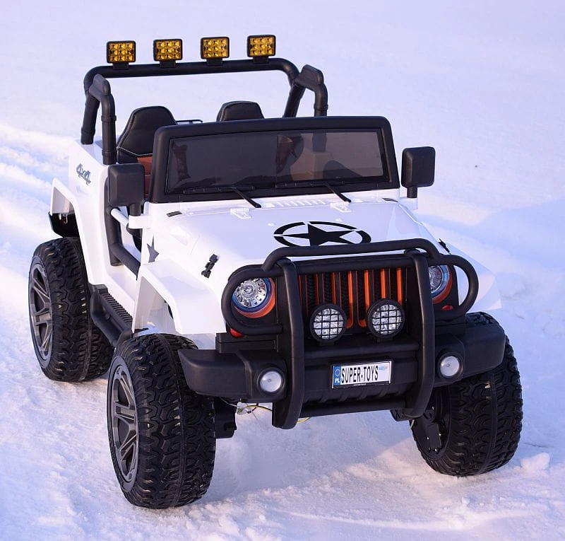 AUTO MEGA JEEP 4X4 Z REDUKTOREM NAPĘDU EXCLUSIVE z systemem ESW - system wolnego startu i hamulcem oraz z kołami EVA zasilane na 1X24 V z napędem na dwa lub cztery koła zachwyci nie jednego przyszłego kierowcę. Dzięki zastosowanym najmocniejszym silnikom 45 W, auto jeździ po nierównym terenie bez żadnych problemów - posiada olbrzymie miękkie koła EVA, Najciekawszą funkcją pojazdu jest SYSTEM WOLNEGO STARTU, oraz SYSTEM HAMOWANIA Z PILOTA Z FUNKCJĄ BLOKADY JAZDY MANUALNEJ Ciekawym elementem jest oświetlenie pojazdu - świecące światła przednie z możliwością ich wyłączenia osobnym przyciskiem Duże koła EVA zapewniają cichą jazdę. Podświetlana deska rozdzielcza pojazdu oraz wskaźnik naładowania akumulator z nowoczesnym panelem z wejściem USB, MP3, slotem na kartę i wgranymi opowieściami oraz RADIEM FM sterowanym za pomocą przycisku w kierownicy ( jak w prawdziwym aucie) dają pełen komfort użytkowania pojazdu - wiemy na jak długo mamy jeszcze " paliwa" ( napięcia w akumulatorach). Nowoczesny panel daje możliwość odgrywania utworów z urządzeń zewnętrznych oraz sterowania nimi za pomocą przycisku na kierownicy. Auto posiada nowoczesna dźwignię zmiany kierunku jazdy.