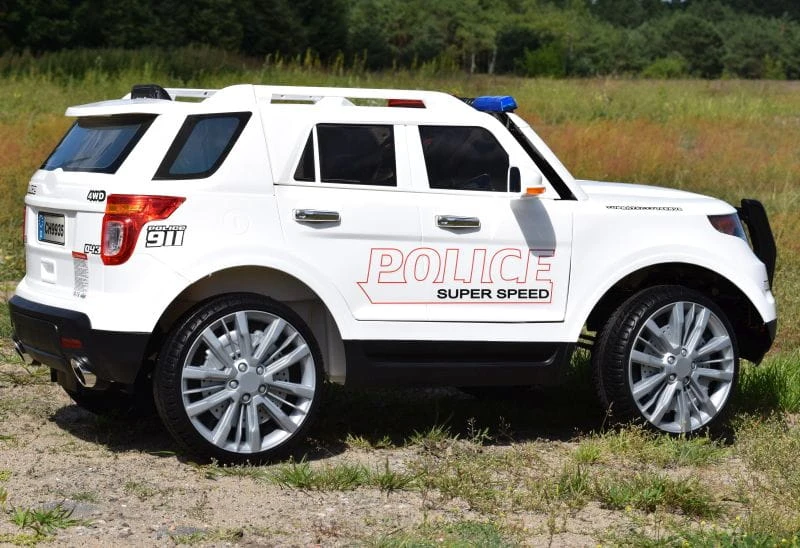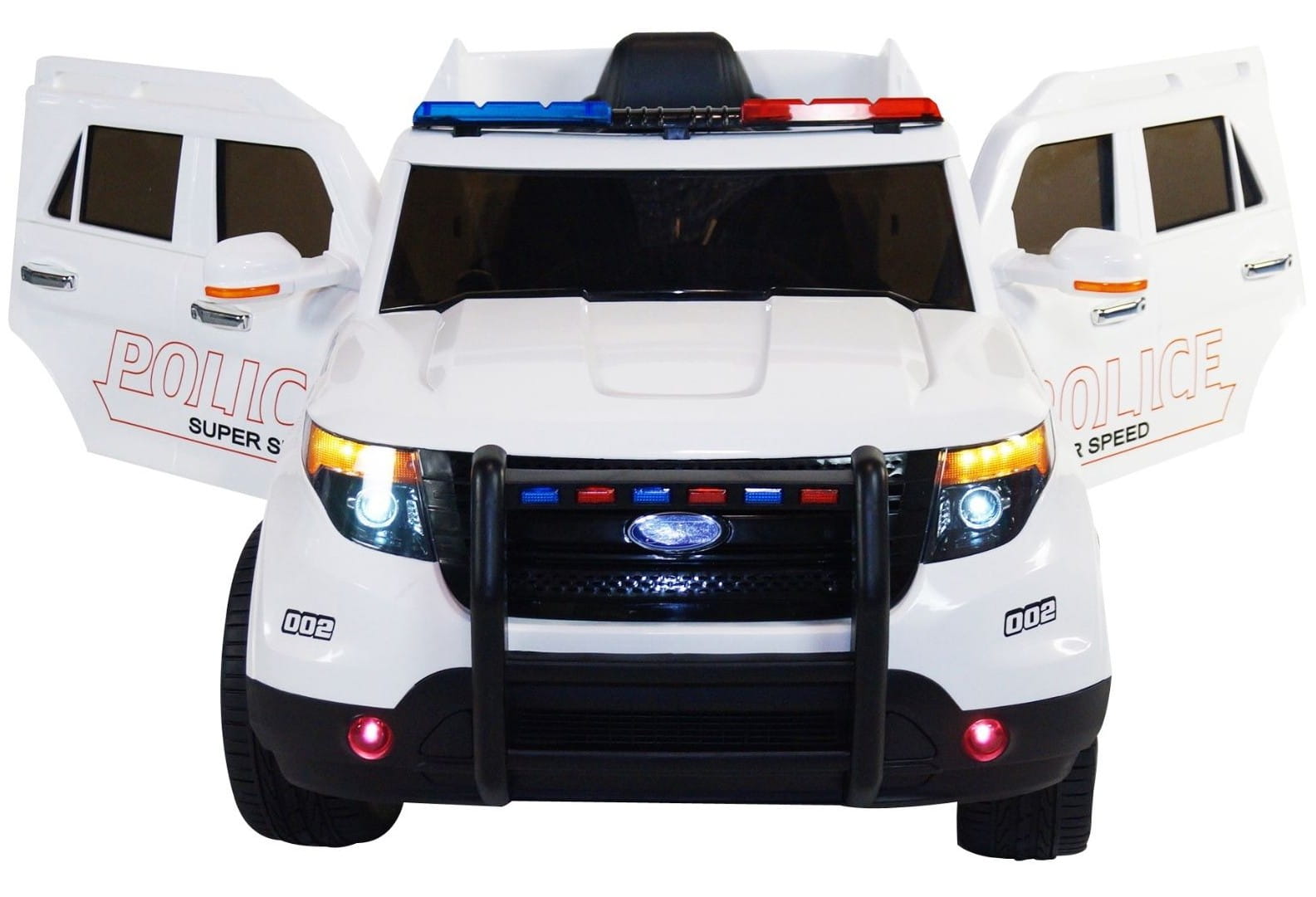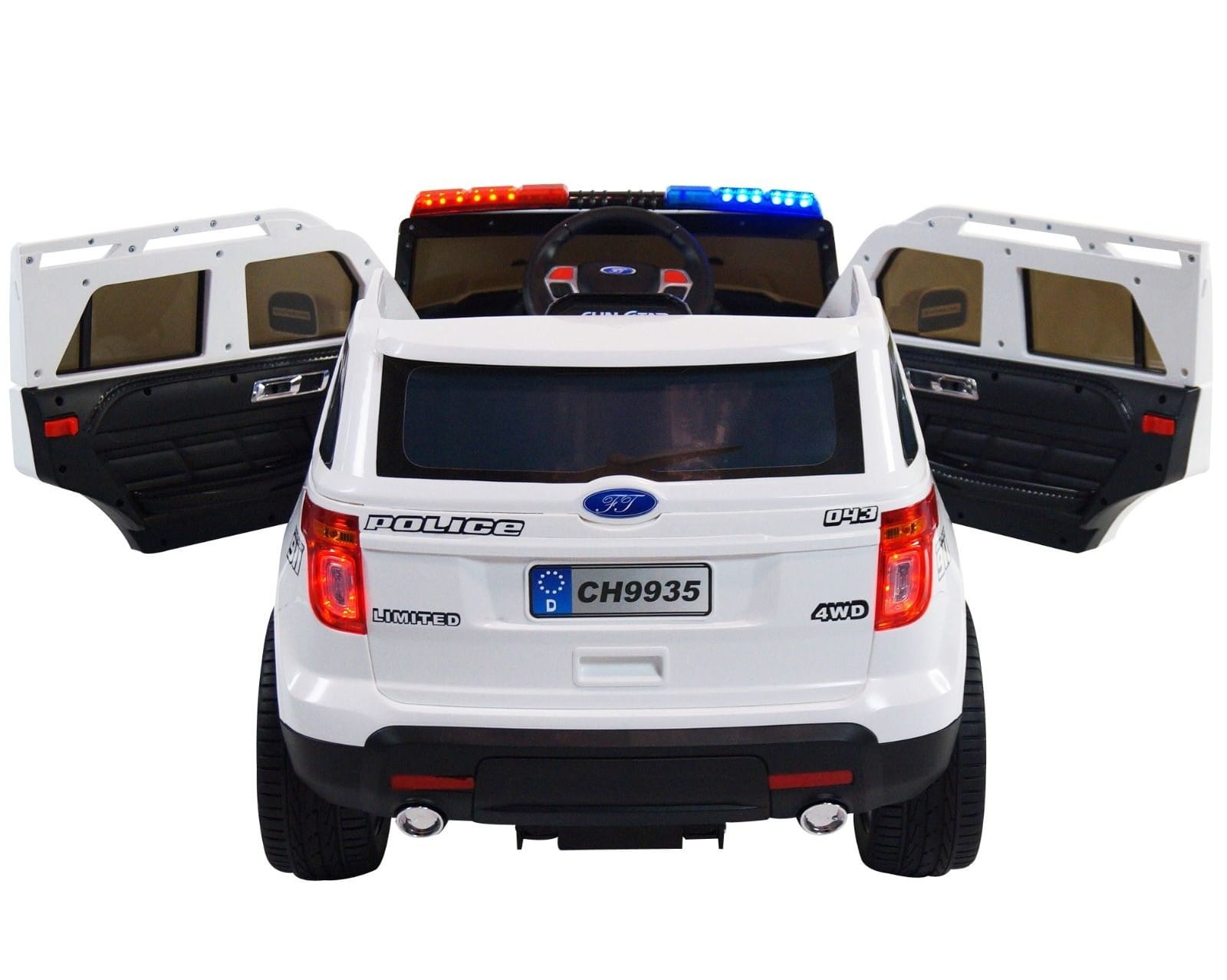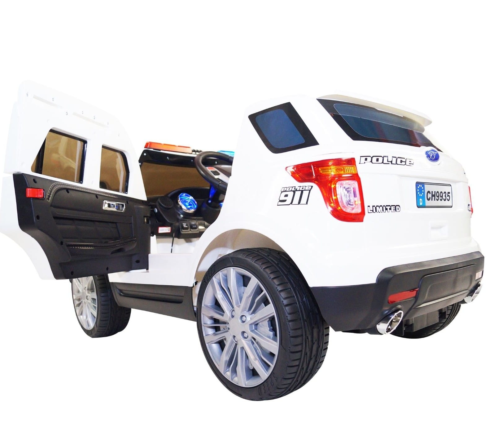 AUTO POLICJA 9935 zasilane na 12 V z MEGAFONEM POLICYJNY ( dziecko może wydawać komendy jak prawdziwy policjant), miękkimi koła EVA, siedzeniem z ECO SKÓRY Pojazd posiada otwierane drzwi i amortyzatory
