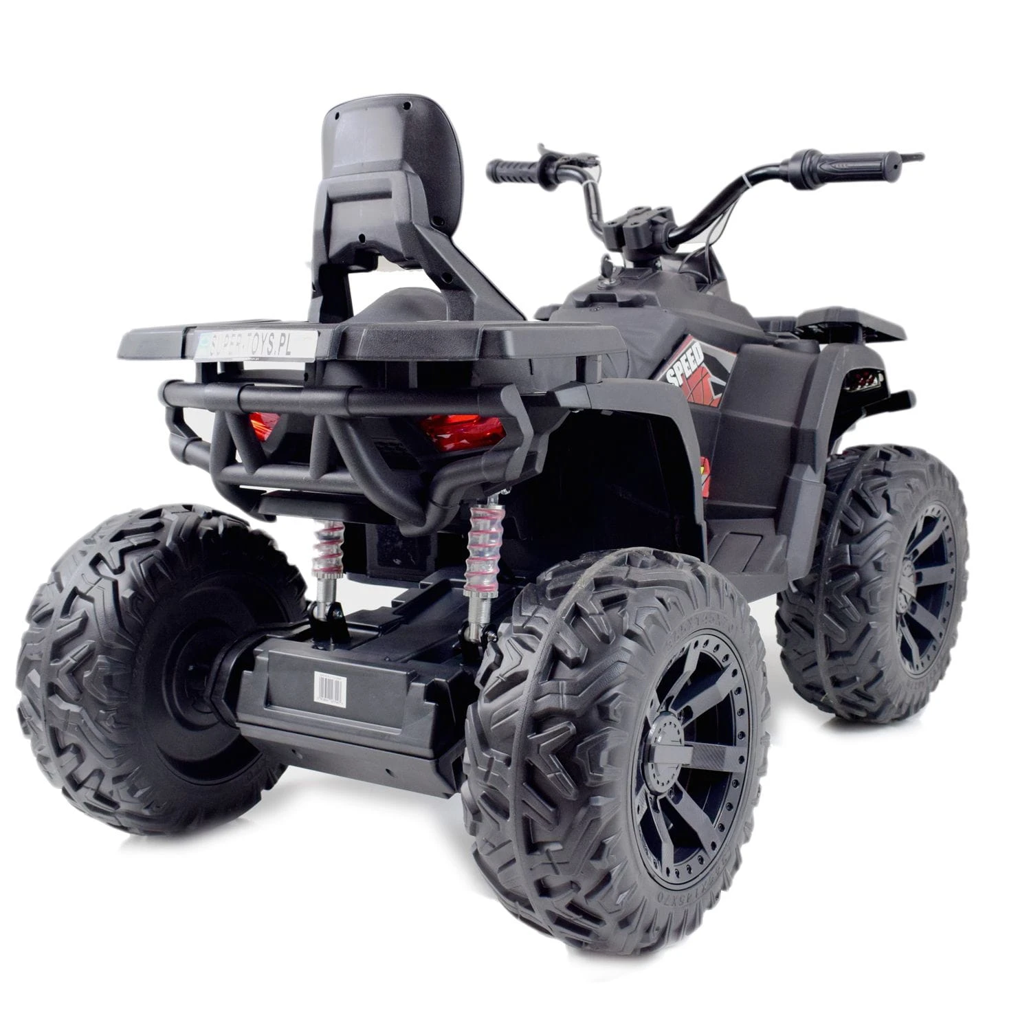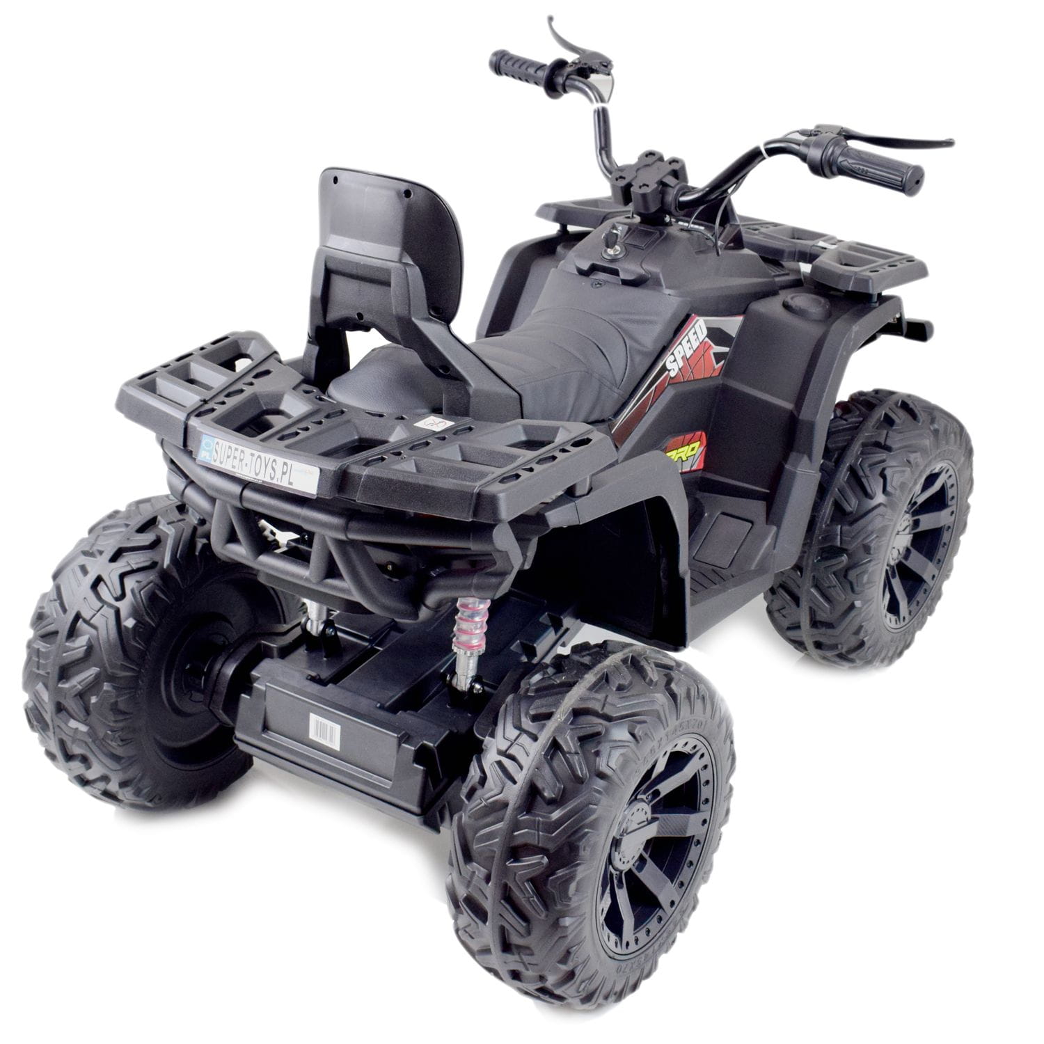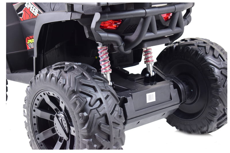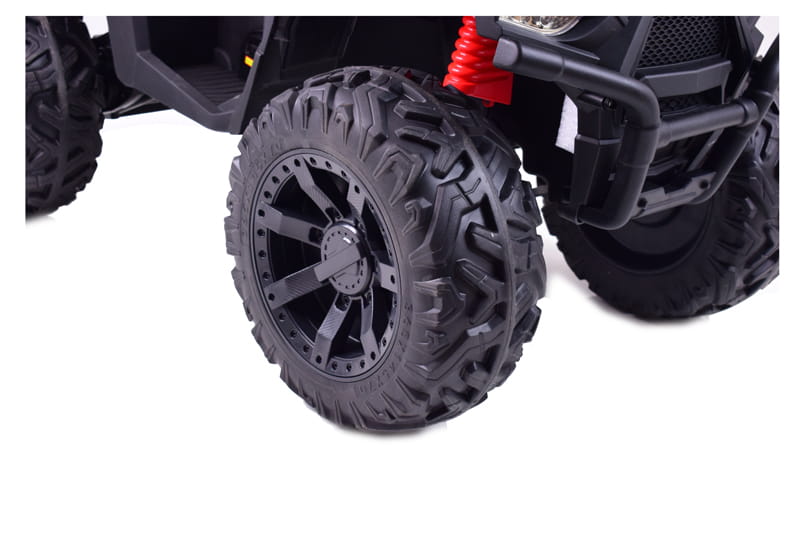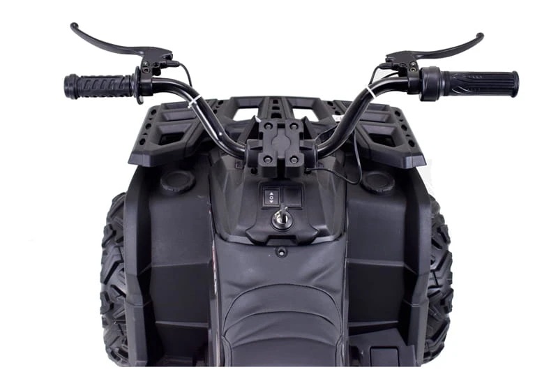 Quad z systemem wolnego startu ESW to zdecydowanie najbezpieczniejsze rozwiązanie, dodatkowo pojazd posiada koła EVA ( miękkie koła jeżdżą cicho), metalowe amortyzatory, panel sterowania z wejściem na urządzenia zewnętrzne zasilane na 24 V z napędem na dwa koła zachwyci nie jednego przyszłego kierowcę. Dzięki zastosowanym najmocniejszym silnikom 200 W, jeździ po nierównym terenie bez żadnych problemów, a dodatkowo silniki te są bardzo dobrej jakości. Dodatkową atrakcją w tym modelu są hamulce jak w prawdziwym quadzie.