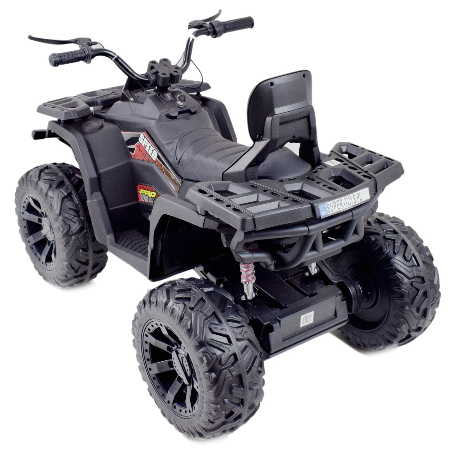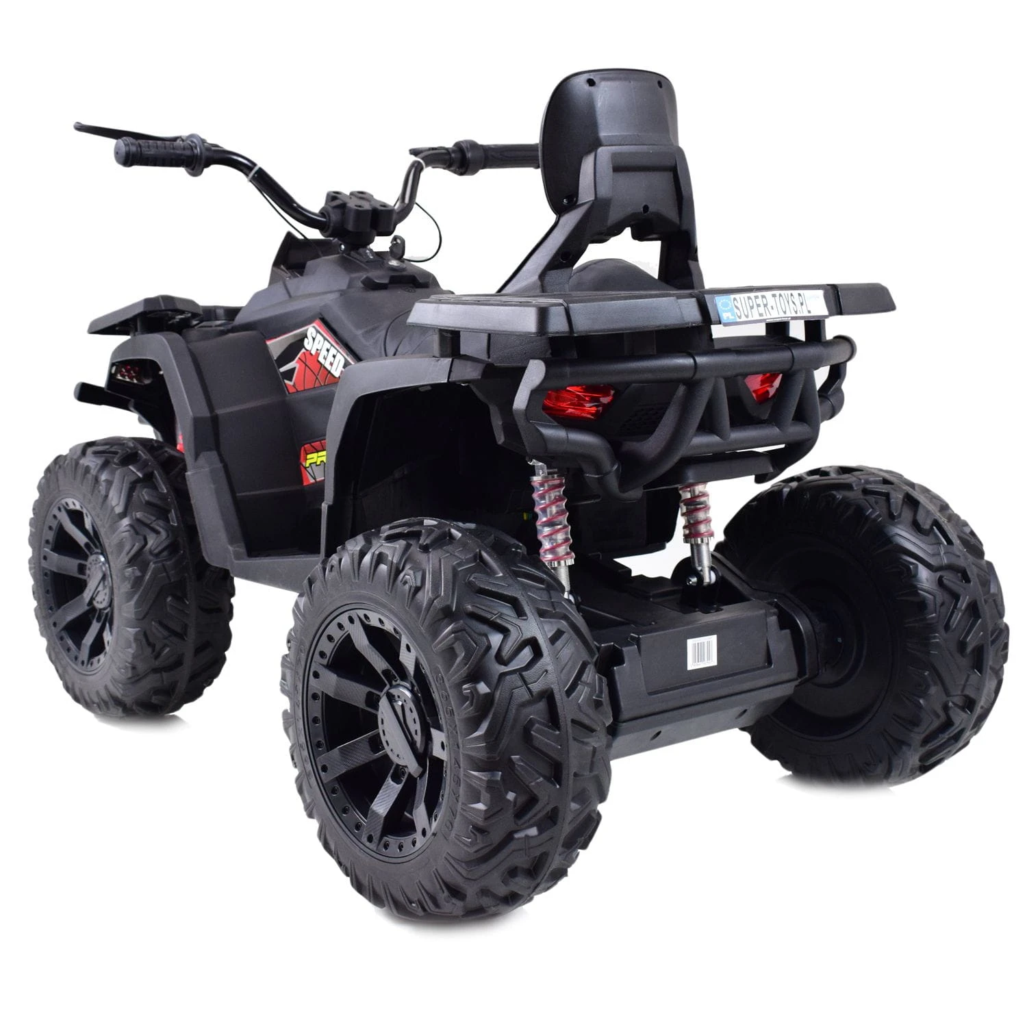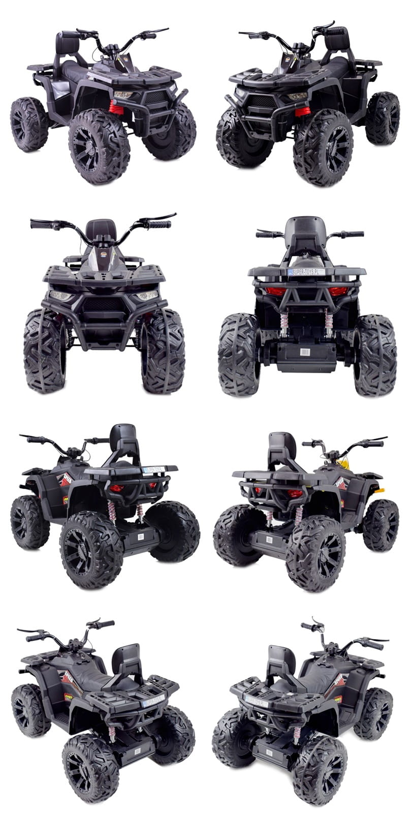 Quad z systemem wolnego startu ESW to zdecydowanie najbezpieczniejsze rozwiązanie, dodatkowo pojazd posiada koła EVA ( miękkie koła jeżdżą cicho), metalowe amortyzatory, panel sterowania z wejściem na urządzenia zewnętrzne zasilane na 24 V z napędem na dwa koła zachwyci nie jednego przyszłego kierowcę. Dzięki zastosowanym najmocniejszym silnikom 200 W, jeździ po nierównym terenie bez żadnych problemów, a dodatkowo silniki te są bardzo dobrej jakości. Dodatkową atrakcją w tym modelu są hamulce jak w prawdziwym quadzie.
