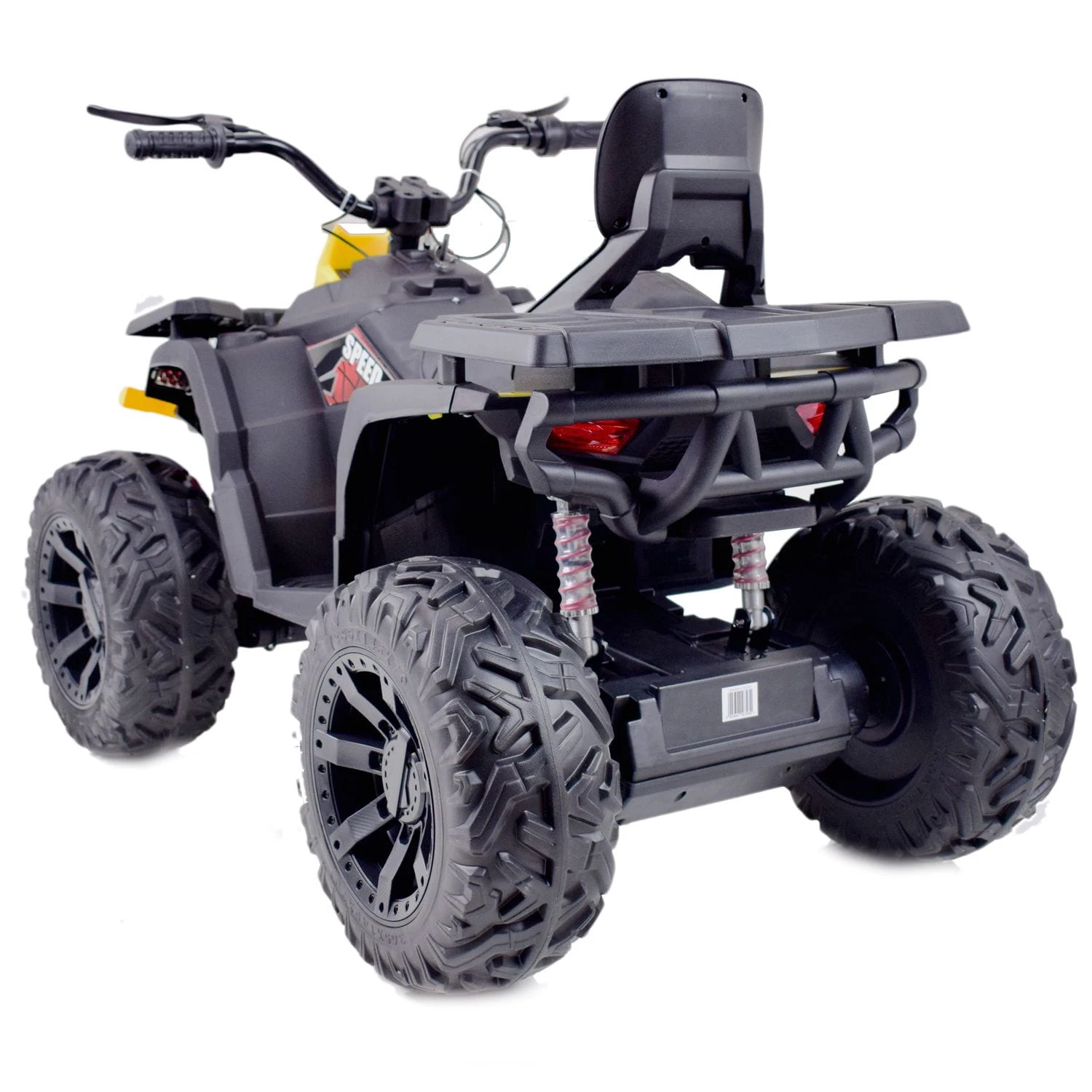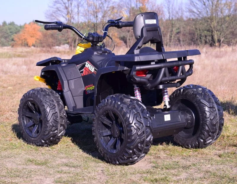 Quad z systemem wolnego startu ESW i pilotem 2.4 GHZ to zdecydowanie najbezpieczniejsze rozwiązanie, dodatkowo pojazd posiada koła EVA ( miękkie koła jeżdżą cicho), metalowe amortyzatory, panel sterowania z wejściem na urządzenia zewnętrzne zasilane na 12 V z napędem na cztery koła zachwyci nie jednego przyszłego kierowcę. Dzięki zastosowanym najmocniejszym silnikom 4x45 W, jeździ po nierównym terenie bez żadnych problemów, a dodatkowo silniki te są bardzo dobrej jakości. Dodatkową atrakcją w tym modelu są hamulce jak w prawdziwym quadzie.