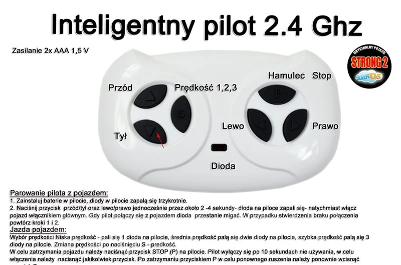 Rodzice mają pełną kontrolę nad jazdą Pociechy - w każdej chwili mogą zareagować pilotem na jazdę swojego Dziecka ( w innych modelach jest możliwa jazda na zdalnym sterowaniu tylko po przełączeniu włącznika R/C, tutaj takiego przełącznika nie ma ). Dzięki właśnie takiemu rozwiązaniu kiedy Rodzice widzą że dziecko jedzie w złym kierunku mogą natychmiast zareagować pilotem - zmienić kierunek jazdy lub w tej wersji natychmiast zatrzymać pojazd - funkcja STOP w pilocie. Dodatkowo z pilota jest możliwe ustawienie 1 z 3 prędkości jazdy.