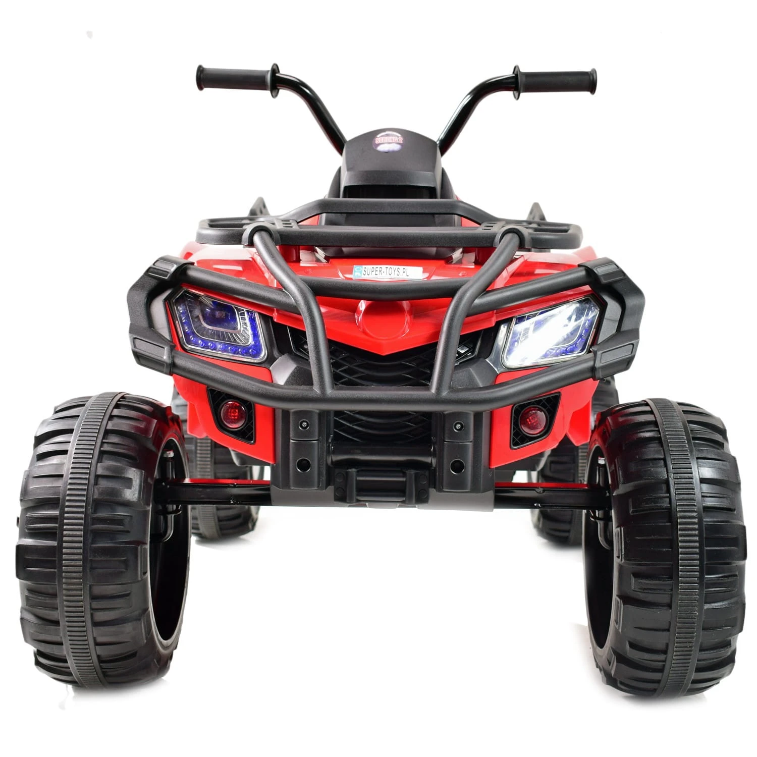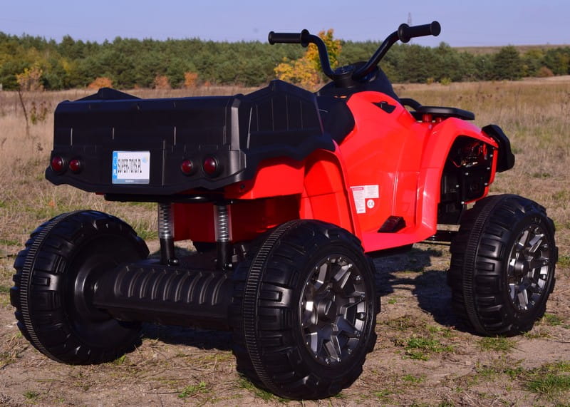 Quad z zasilaniem na 24 V z kołami EVA ( miękkie koła jeżdżą cicho), 4 amortyzatory, panel sterowania z prawdziwym RADIEM i wejściem na urządzenia zewnętrzne zasilane na 24 V z napędem na dwa koła zachwyci nie jednego przyszłego kierowcę. Dzięki zastosowanym najmocniejszym silnikom 100 W, jeździ po nierównym terenie bez żadnych problemów, a dodatkowo silniki te są bardzo dobrej jakości.