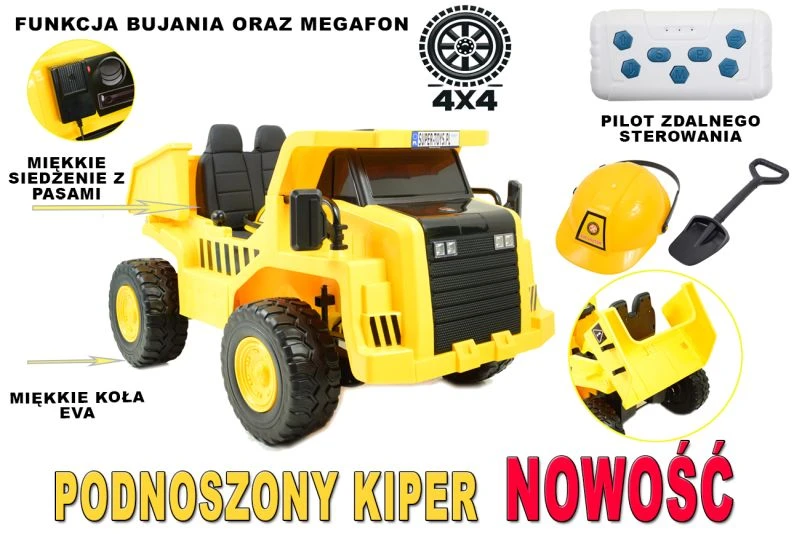 Wygląd przypomina prawdziwe pojazdy z tej grupy. Duże koła zapewniają komfort jazdy, kiper jest ruchowy - poruszany elektrycznie za pomocą dźwigni z lewej strony kierownicy- możliwość podnoszenia ok 3 kg.