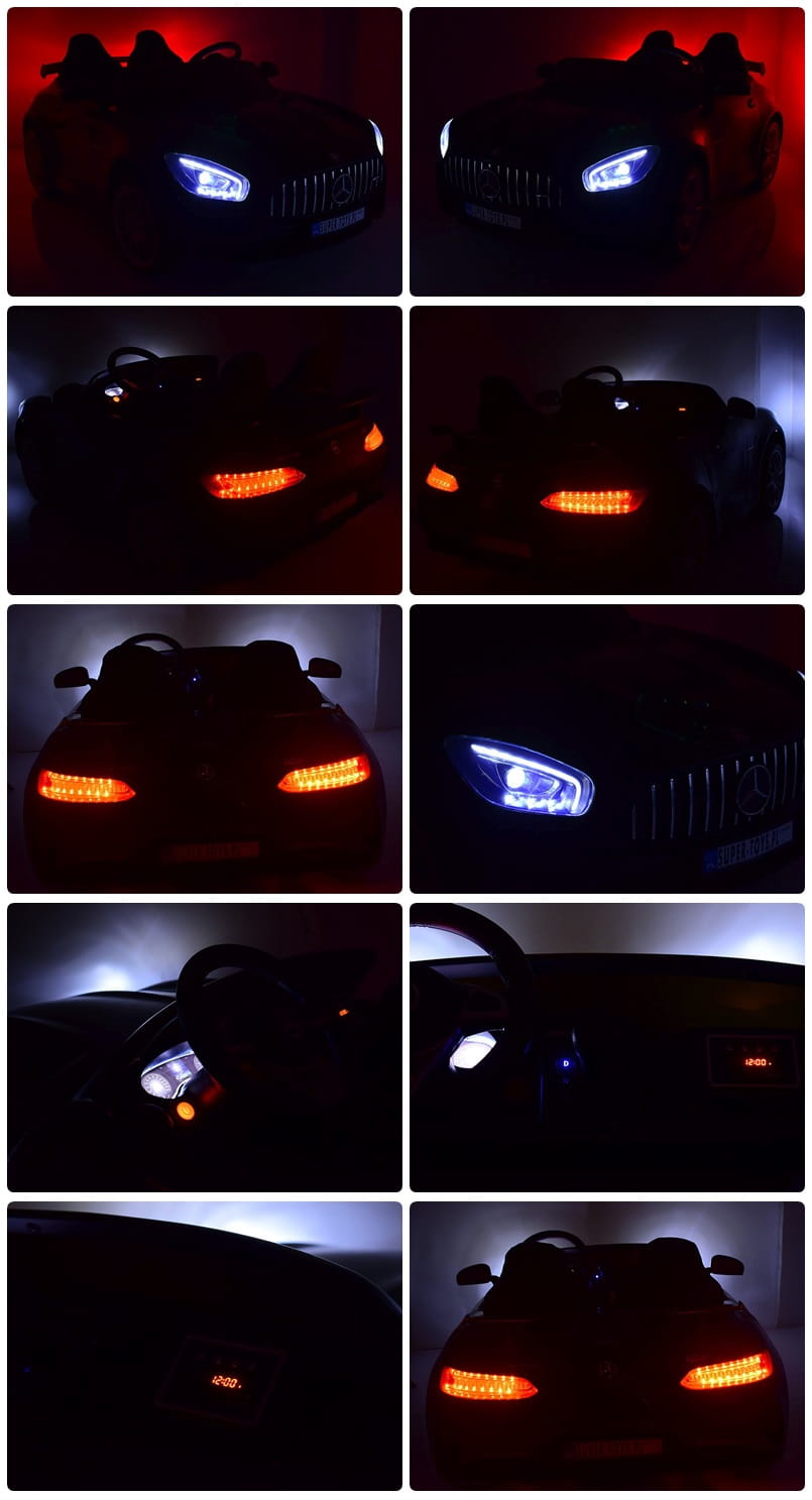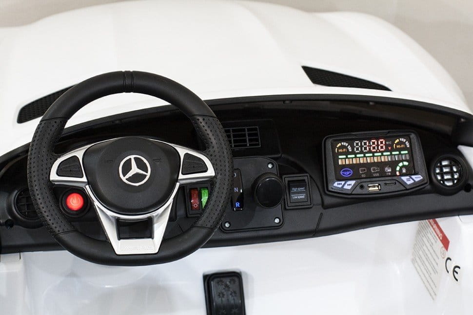 AUTO MERCEDES GT R z miękkimi koła EVA zasilane na 2x12 V z napędem na 4 koła zachwyci nie jednego przyszłego kierowcę. Dzięki zastosowanym najmocniejszym silnikom 45 W, auto jeździ po nierównym terenie bez żadnych problemów, a dodatkowo silniki te są bardzo dobrej jakości. Najciekawszą funkcją pojazdu są AMORTYZATORY.