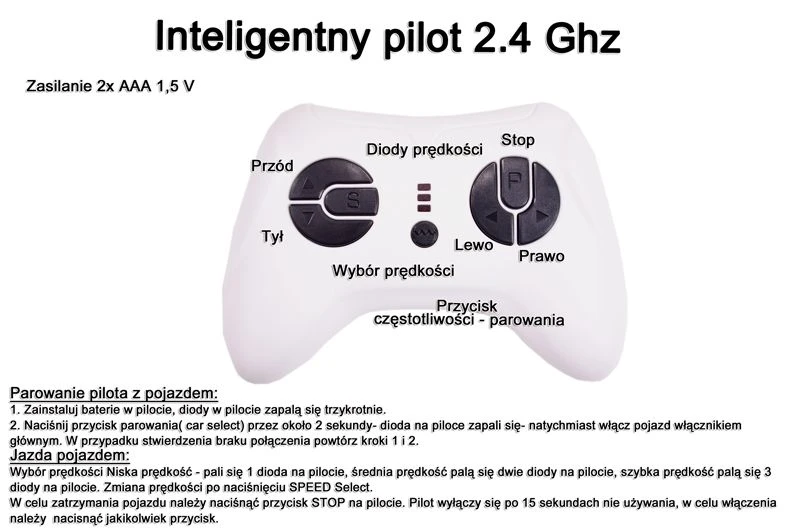 Hamowanie: | Pojazd hamuje po zdjęciu nogi z gazu lub po naciśnięciu przycisku STOP na pilocie |