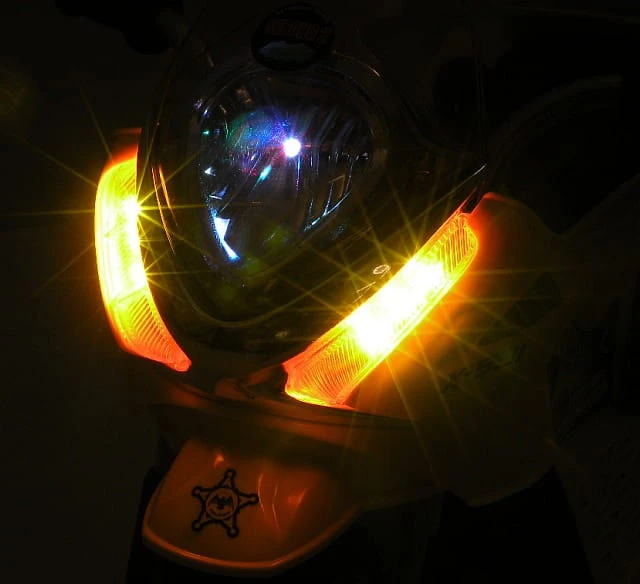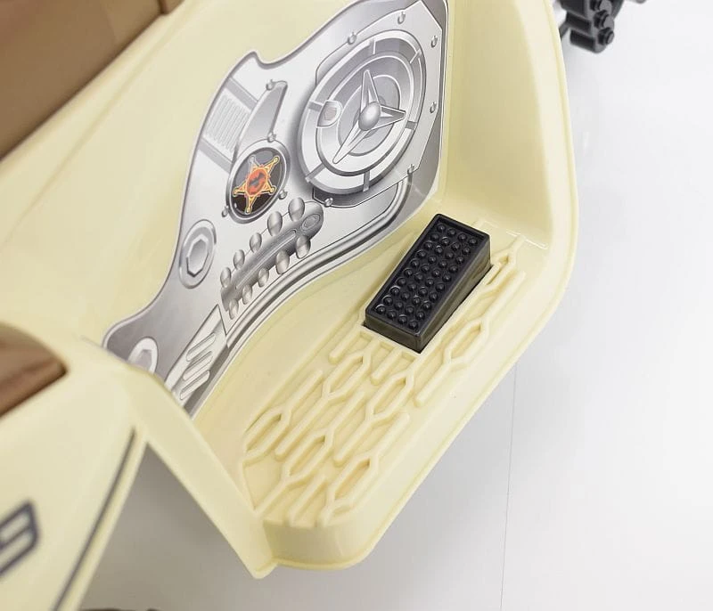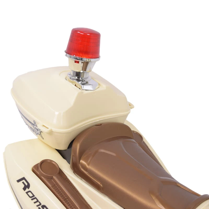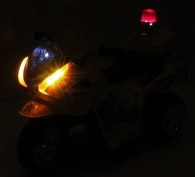 Panel z dźwiękami (melodyjki i kogut z dźwiękami) i oświetlenie pojazdu ( światła ) umili o urozmaici zabawą. Ciekawym elementem jest oświetlenie pojazdu - świecące światło przednie, migające wielokolorowe światełko pod owiewką oraz to co najważniejsze KOGUT POLICYJNY z odgłosem syreny policyjnej - świecący i migający jak prawdziwy kogut policyjny. Kogut świeci również w rytmie wygrywanej muzyki.