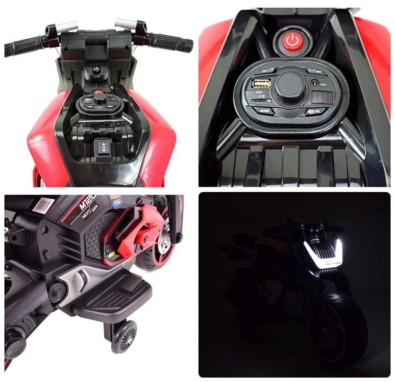 Najnowszy panel z dźwiękami ( dźwięki odpalania motocykla) z wejściem USB, AUX wejście na kartę i oświetlenie pojazdu ( światła) umili o urozmaici zabawą.