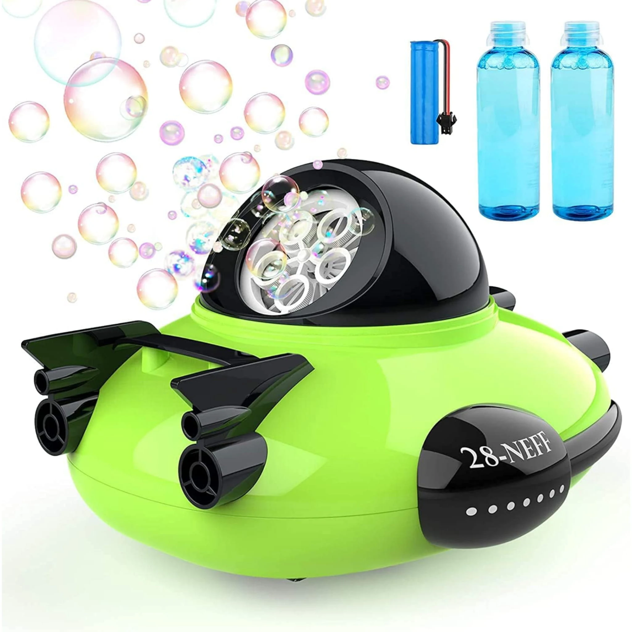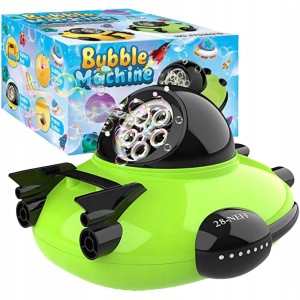 Maszynka z bańkami to idealna zabawka dla dzieci uwielbiających zabawę na podwórku. Wszystkie elementy zostały wykonane, tak aby były wygodne i bezpieczne dla maluchów. Wesoły wzór łodzi podwodnej zachęca do zabawy w tworzenie kolorowych baniek. Statek posiada włącznik on/off, po przełączeniu którego wydobywają się kolorowe bańki. Do zestawu dołączone są 2 buteleczki z płynem do baniek, który należy wlać do pojemniczka w zabawce. Kolorowe banki wypuszczane są nieustannie przez górę statku, gdy zabawka jest włączona.