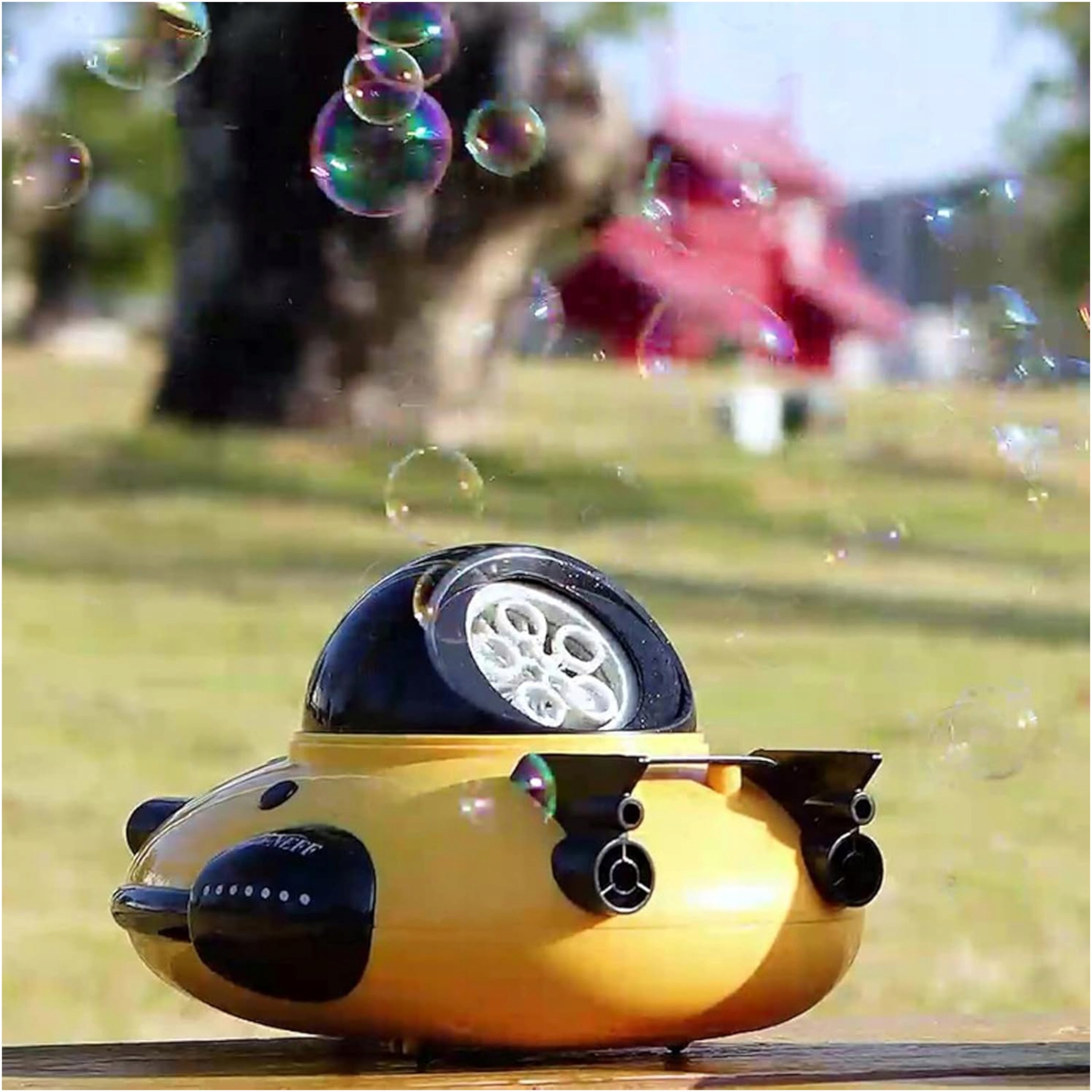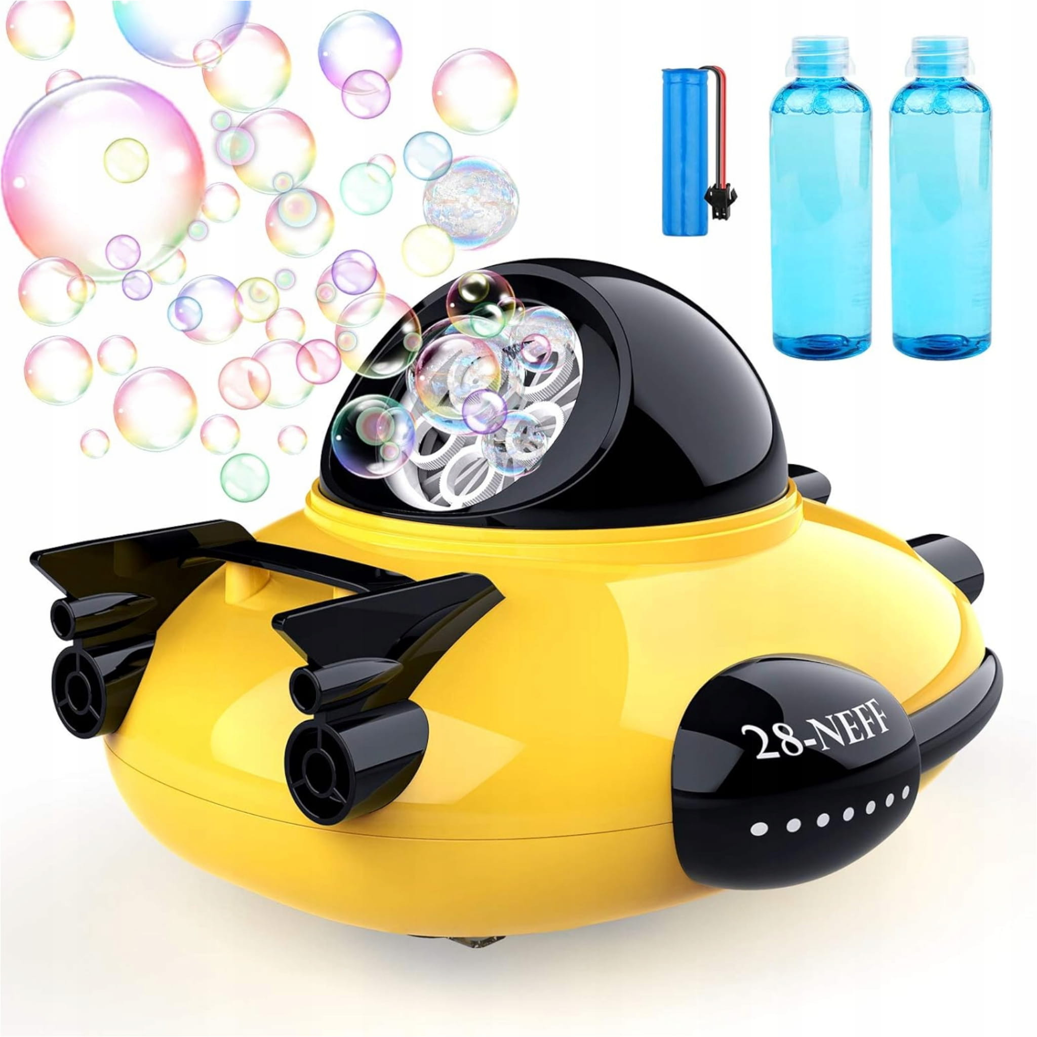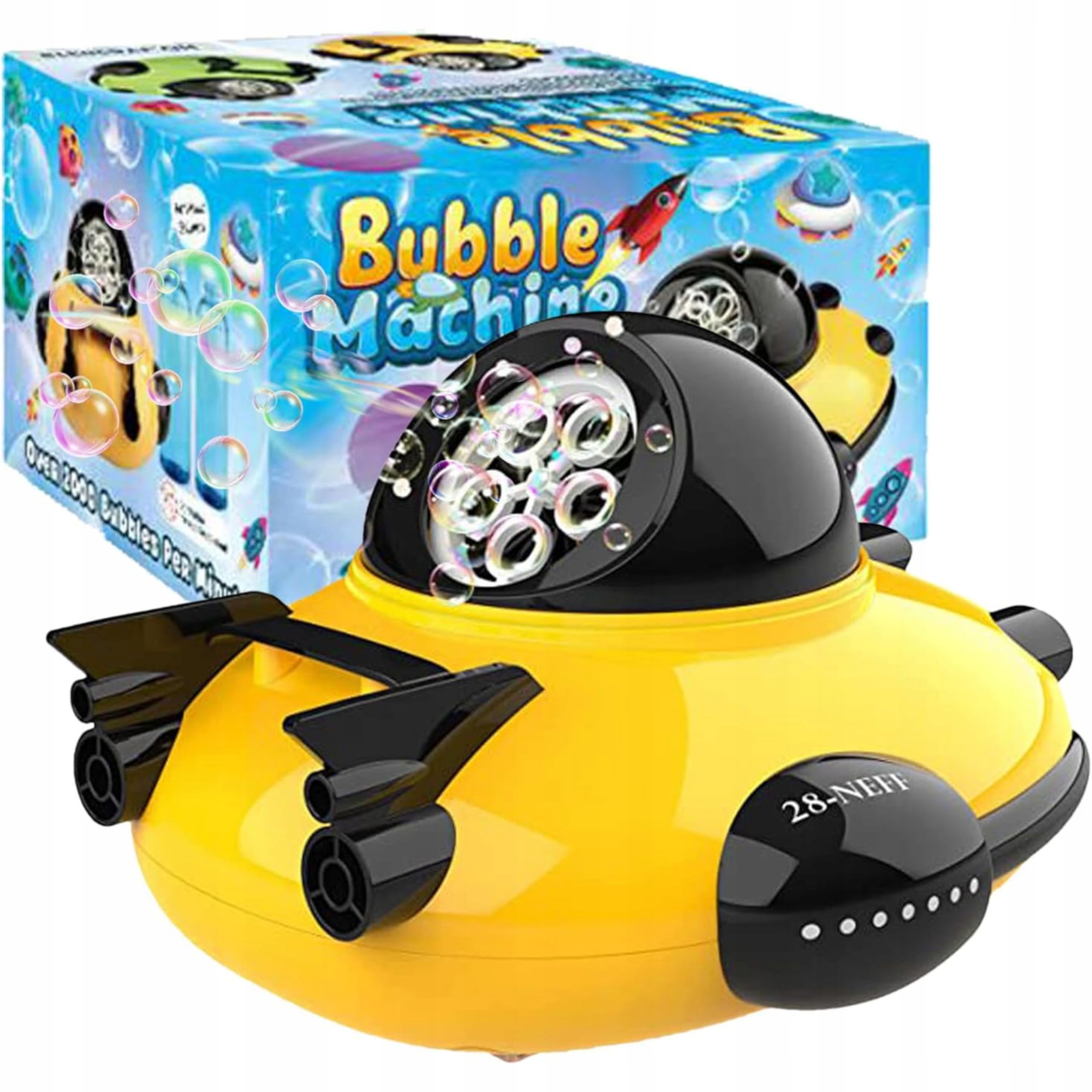 Maszynka z bańkami to idealna zabawka dla dzieci uwielbiających zabawę na podwórku. Wszystkie elementy zostały wykonane, tak aby były wygodne i bezpieczne dla maluchów. Wesoły wzór łodzi podwodnej zachęca do zabawy w tworzenie kolorowych baniek. Statek posiada włącznik on/off, po przełączeniu wydobywają się kolorowe bańki. Do zestawu dołączone są 2 buteleczki z płynem do baniek, który należy wlać do pojemniczka w zabawce. Kolorowe banki wypuszczane są nieustannie przez górę statku, gdy zabawka jest włączona.