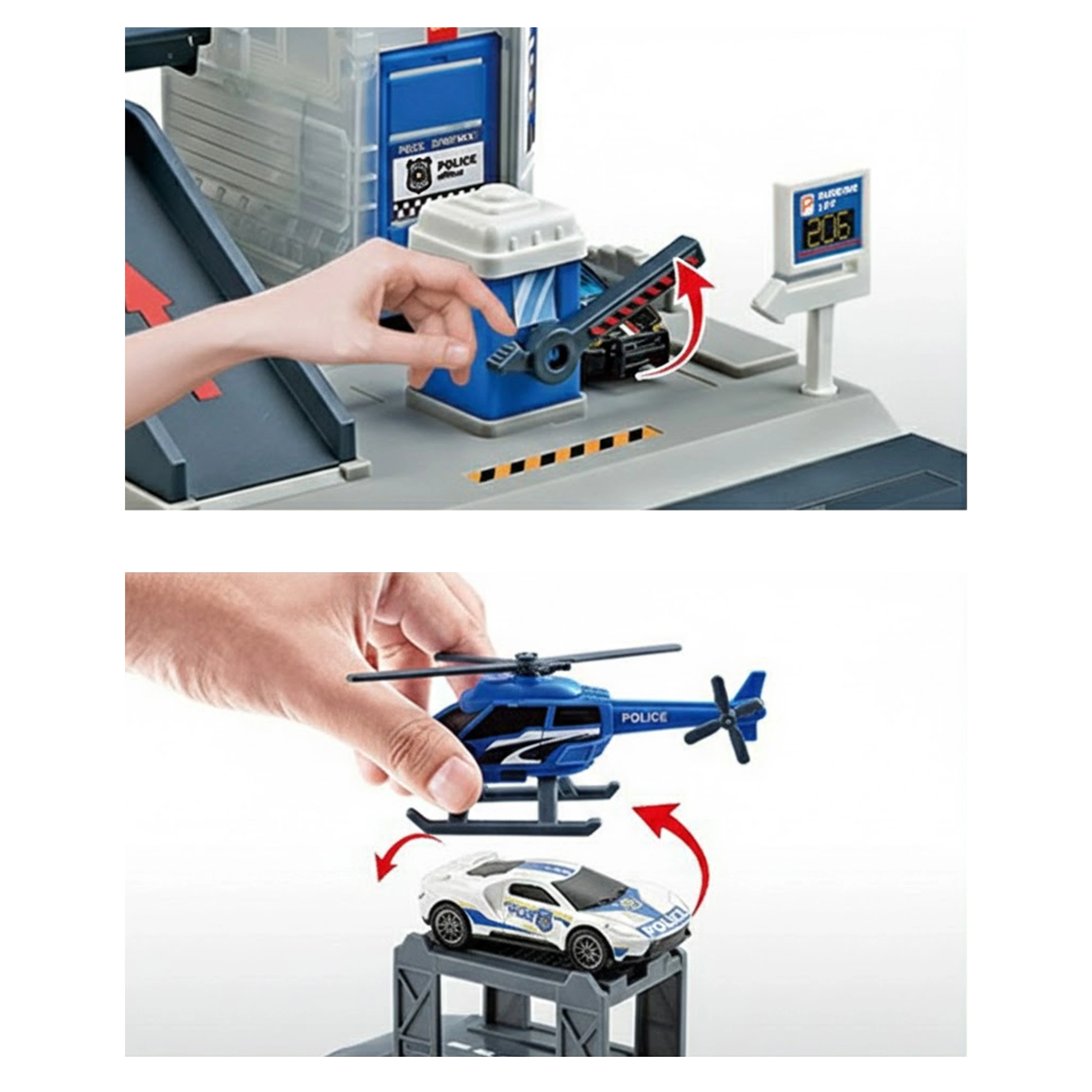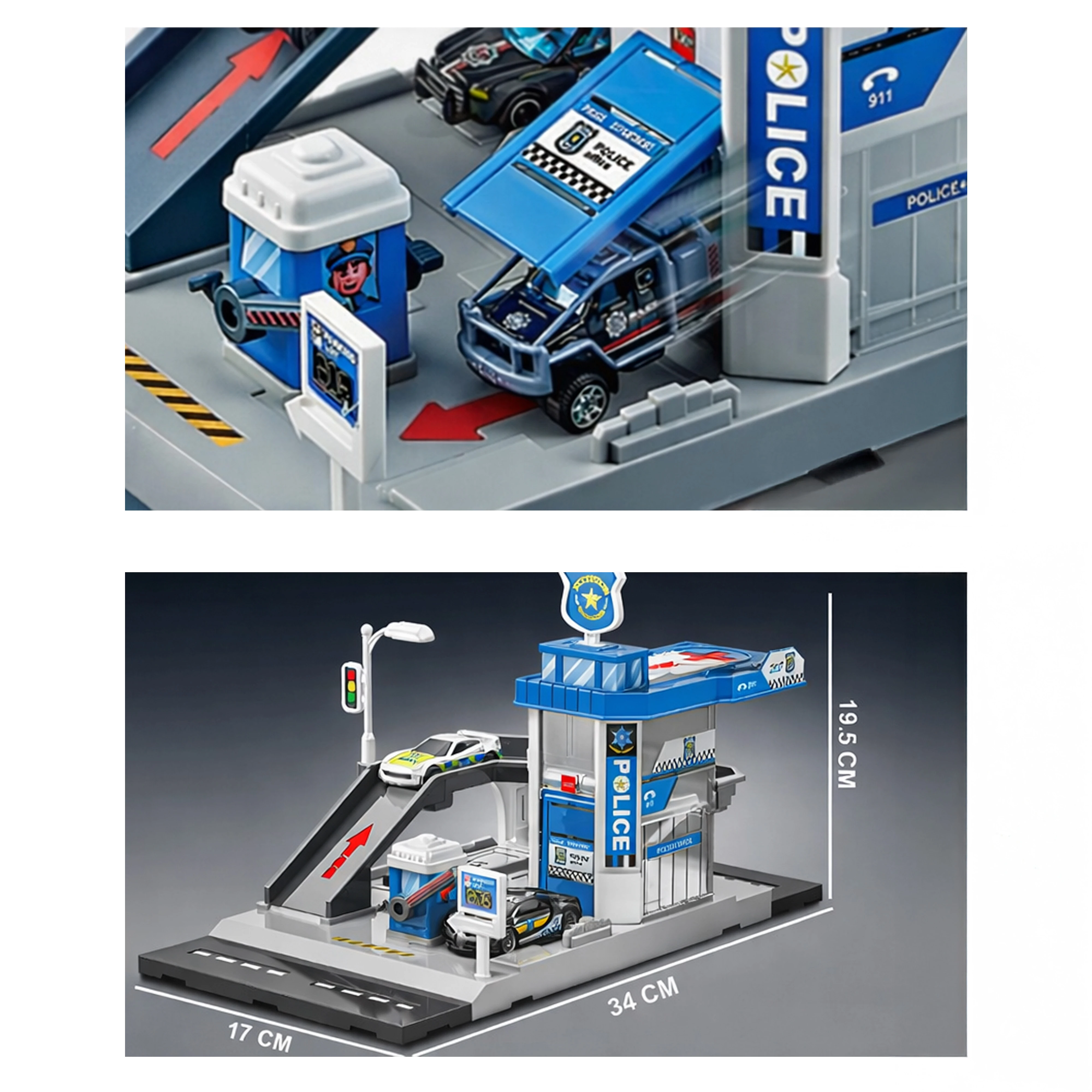 Miejski komisariat policji z parkingiem, wyposażony w 2 metalowe autka [MH-603]