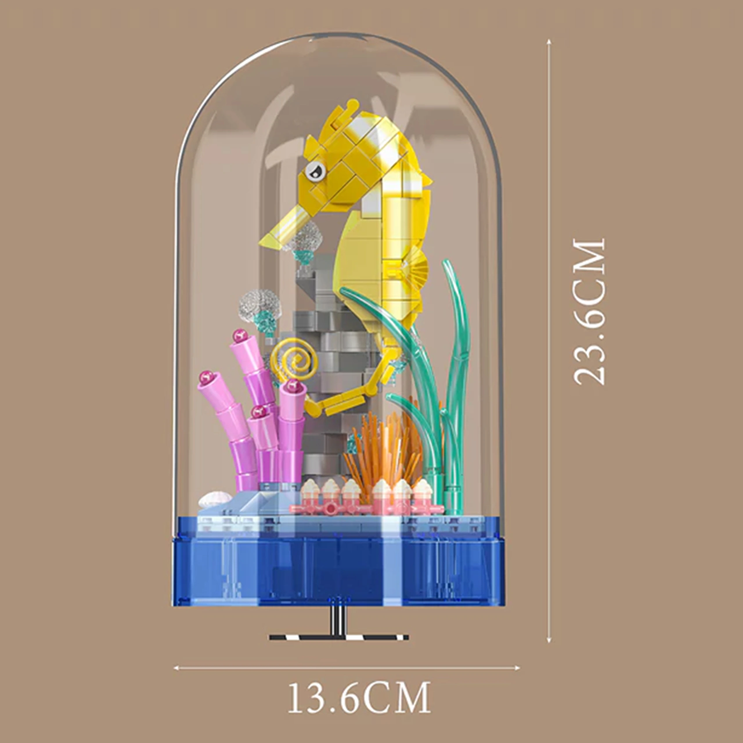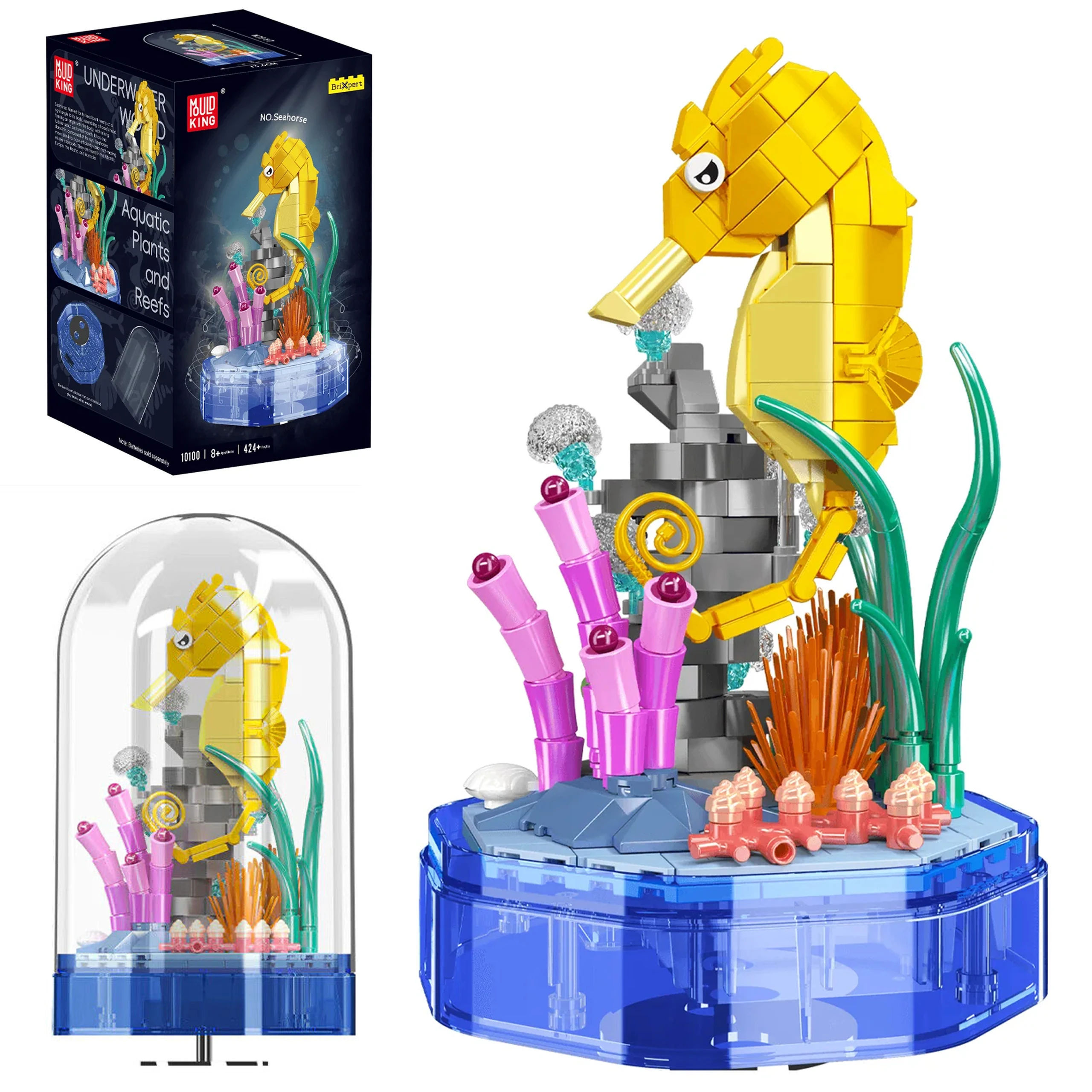Pozytywka z Konikiem Morskim – Mould King 10100, 424 Klocki, Świecąca Dekoracja z Melodią i Kopułą Ochronną