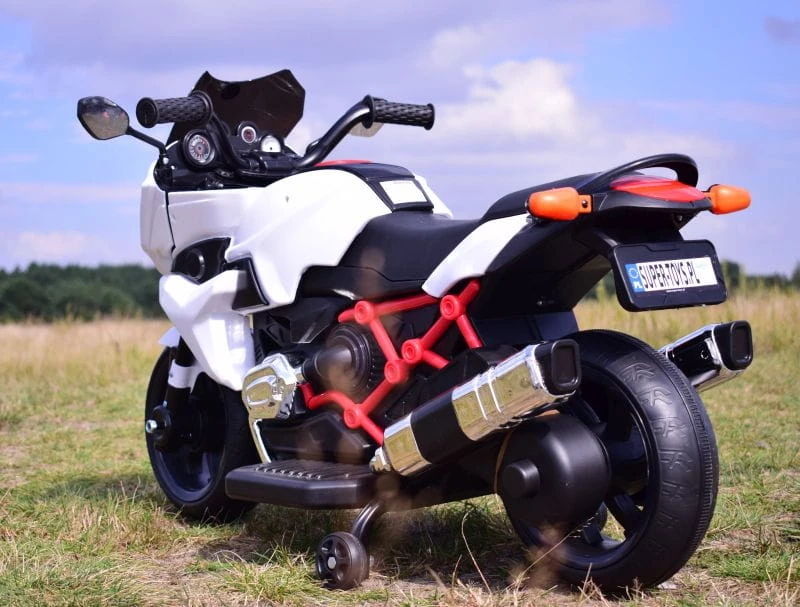 Panel z dźwiękami ( dźwięki odpalania motocykla) z wejściem USB i AUX i oświetlenie pojazdu ( światła oraz świecące koła) umili o urozmaici zabawą.