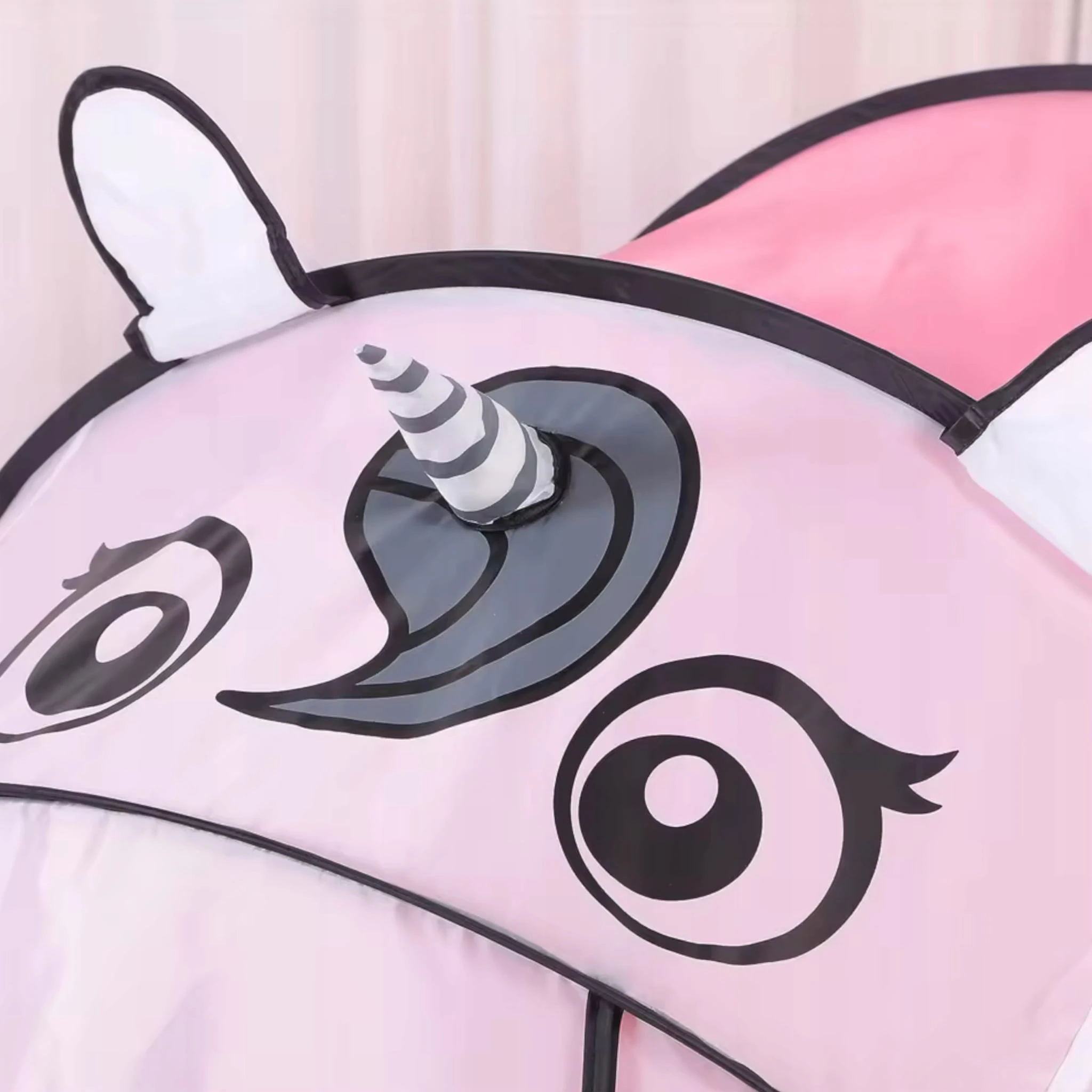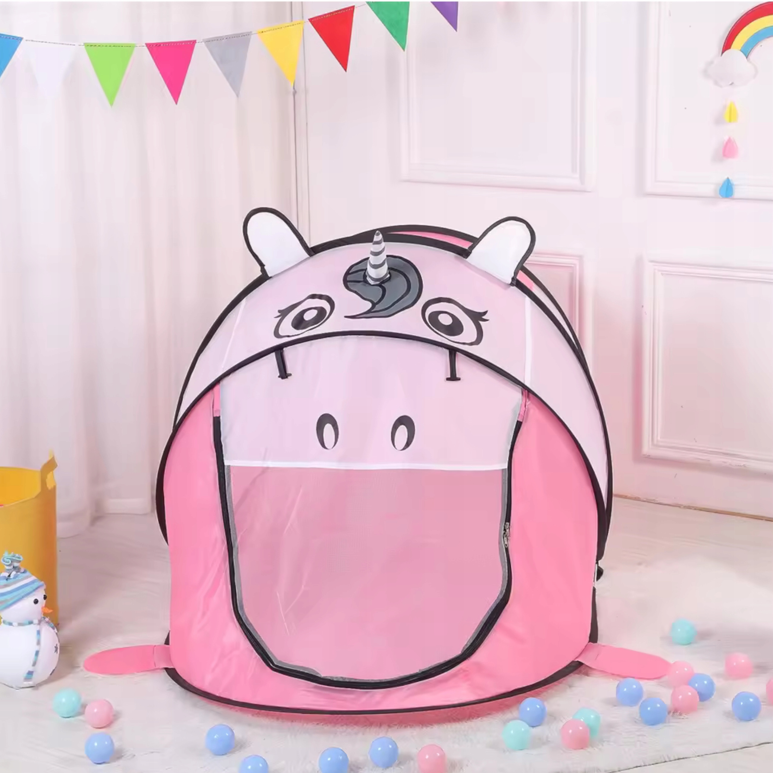 Namiot z motywem jednorożca posiada żywą kolorystkę, która pobudza wyobraźnie dziecka i zachęca do zabawy.