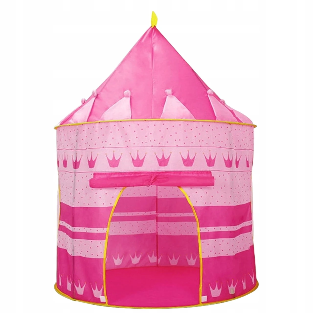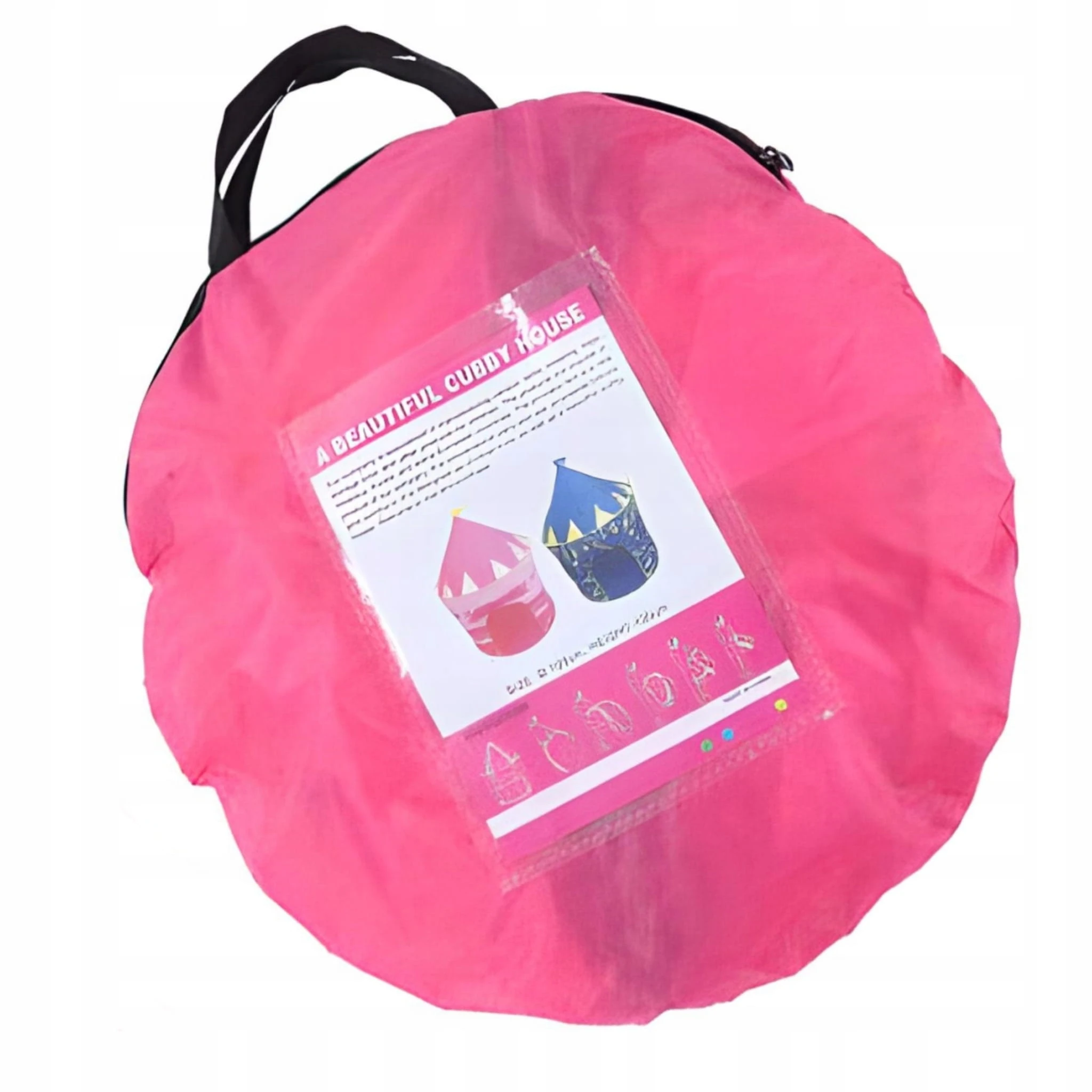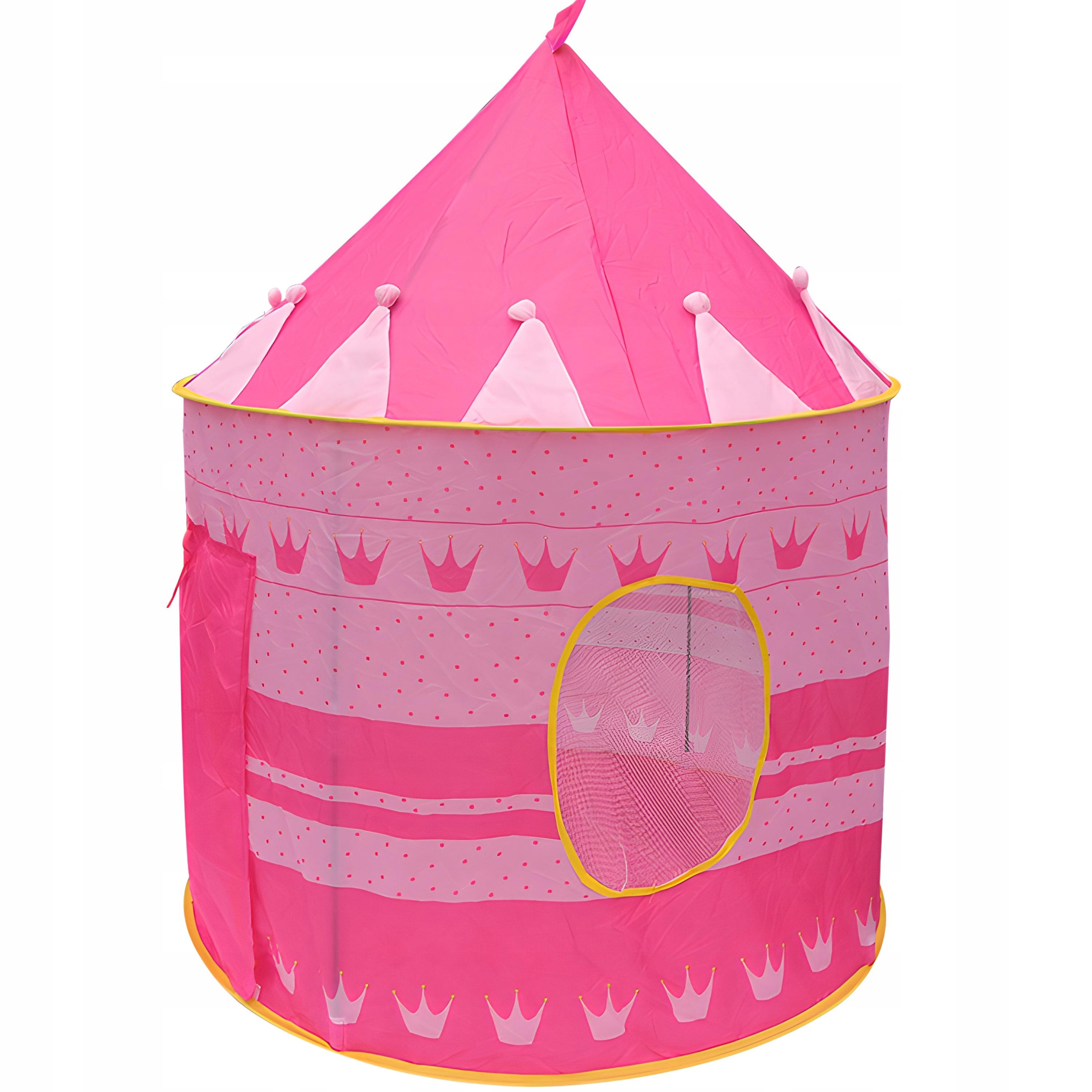 Namiot ma okrągły kształt i stożkowaty dach jak w zamkowej wieży. Ścianki zdobią dwa okienka z siateczką, zapewniające jednocześnie przepływ powietrza. Wejście można przymocować sznureczkiem, aby pozostało otwarte. Ponadto namiot posiada podłogę dzięki, której Twoje dziecko nie pobrudzi się podczas zabawy. Lekka konstrukcja domku sprawia, że można go w łatwy sposób złożyć i przenosić w różne miejsca ogrodu czy domu. Materiał, z którego został wykonany namiot jest łatwy w czyszczeniu. Po złożeniu namiot zajmuje mało miejsca, dzięki czemu łatwo można go zabrać na wyjazd rodzinny lub urlop.