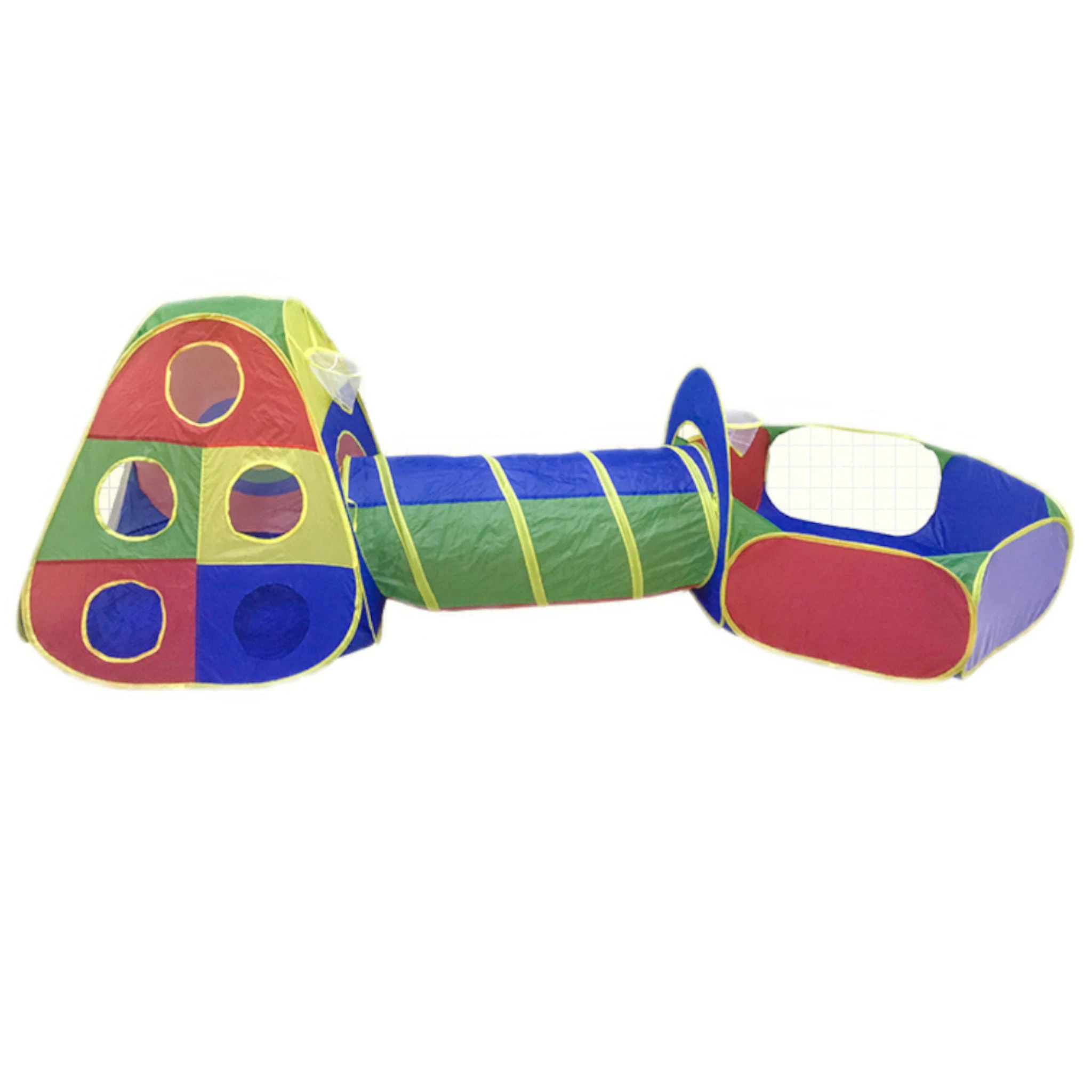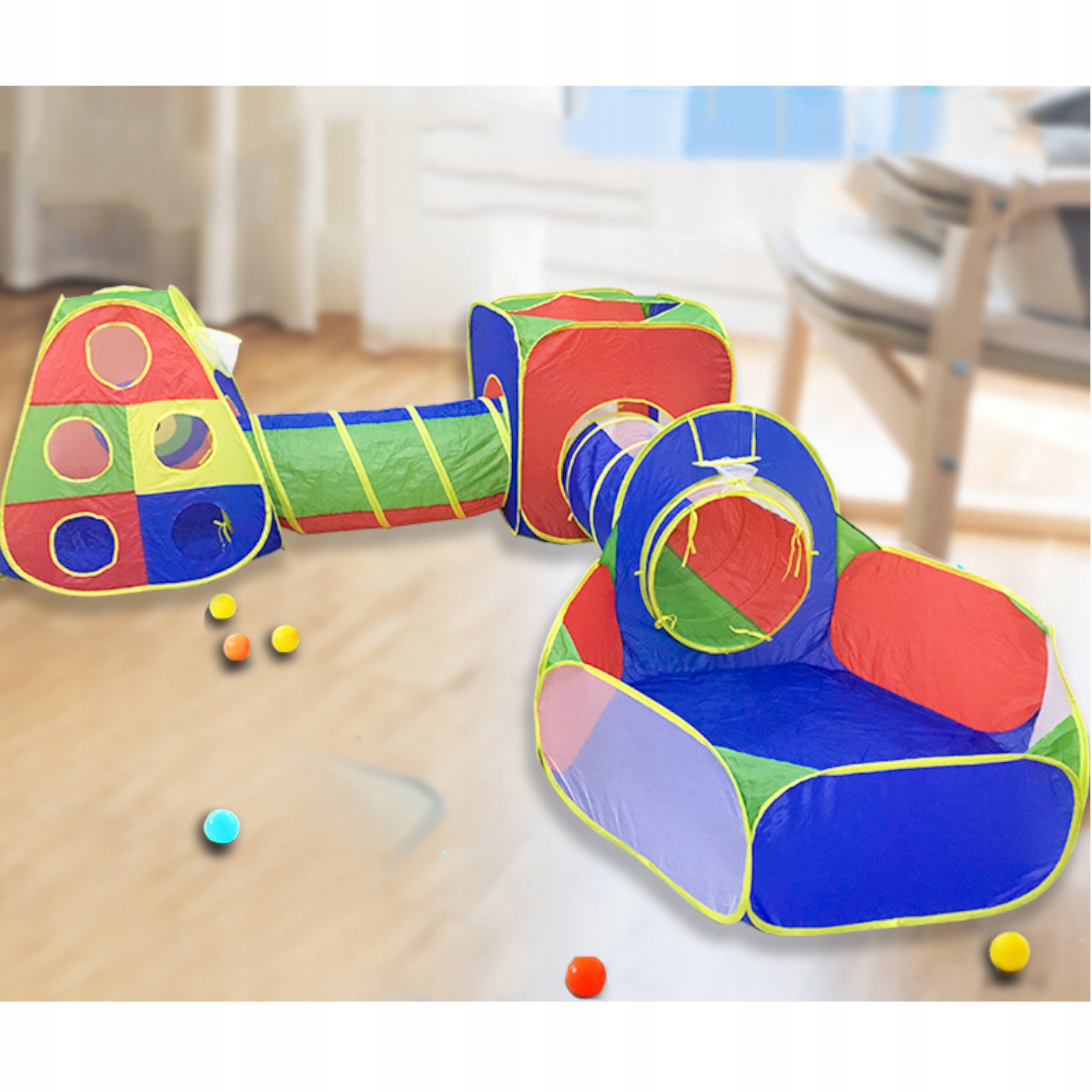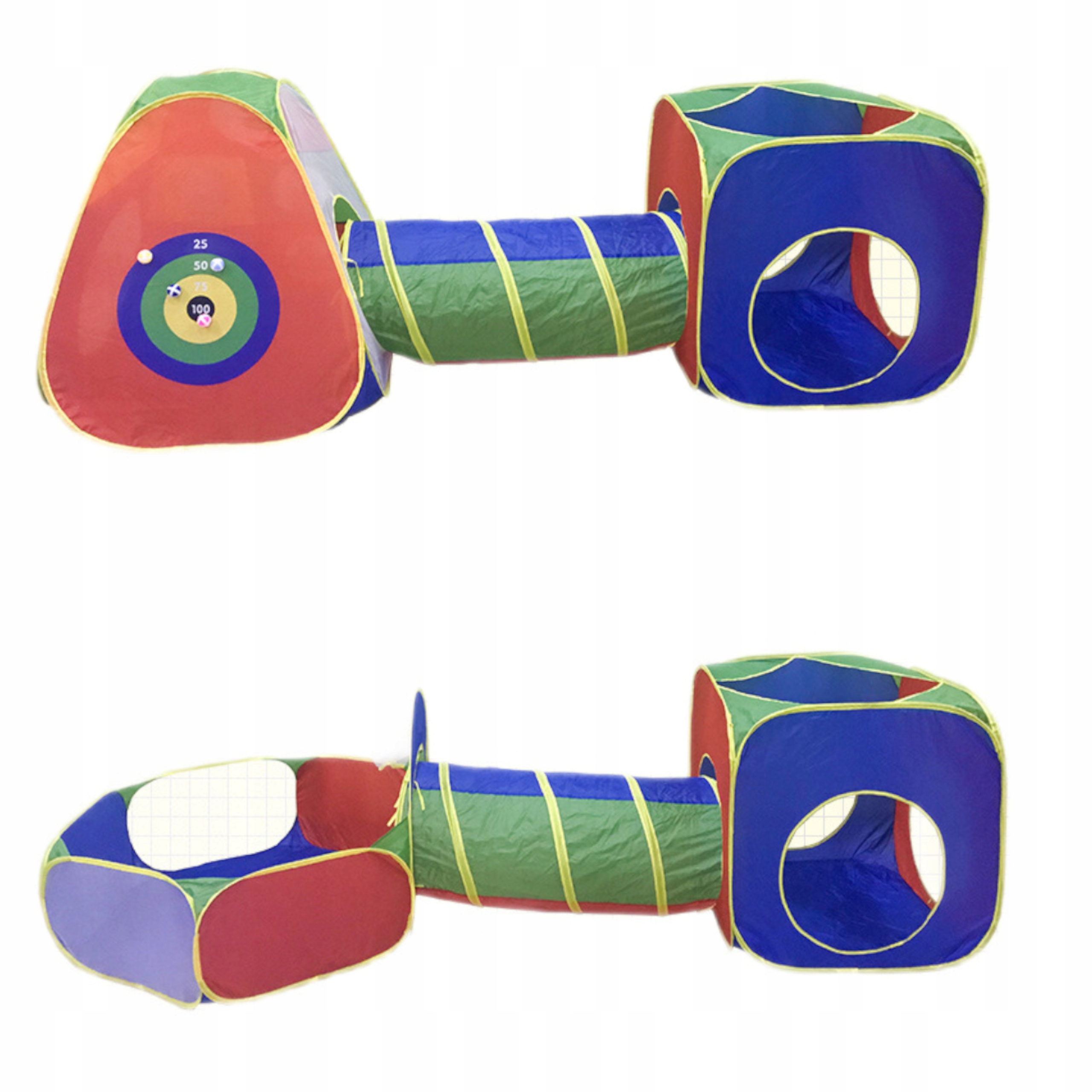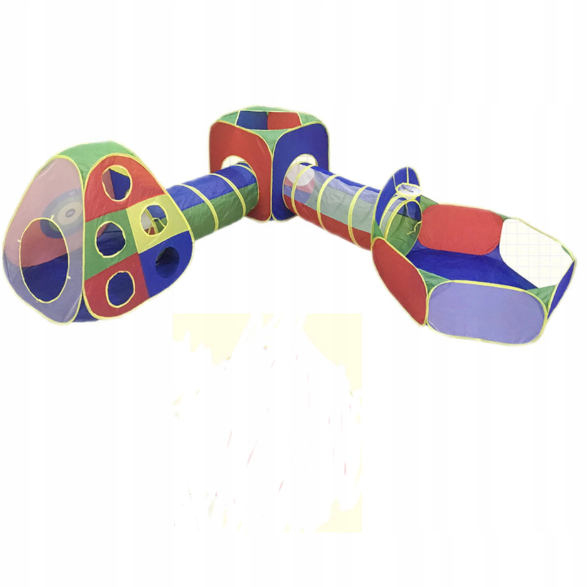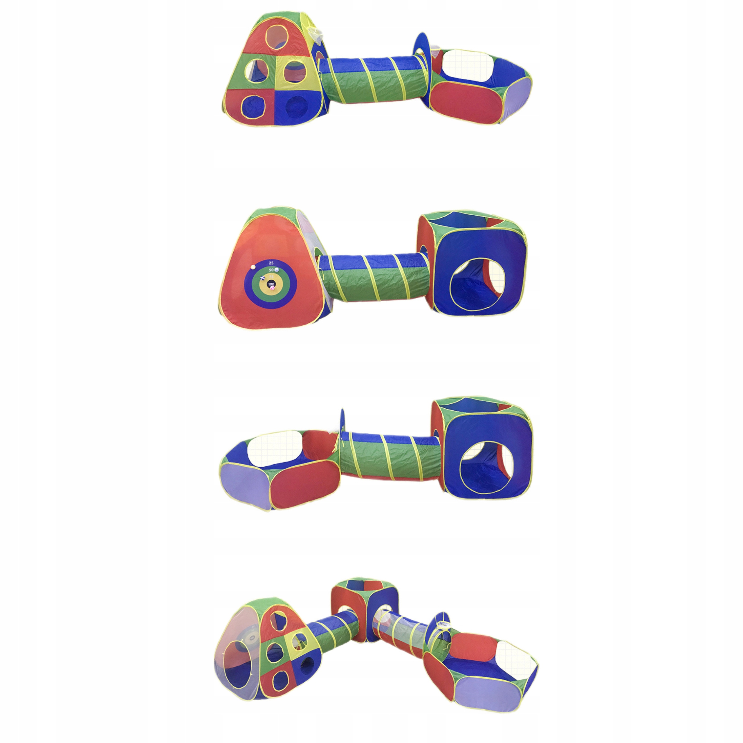 Zestaw 5w1 zawiera namiot w kształcie domku, który posiada wejście mocowane na sznurek aby pozostało otwarte i zapewniające jednocześnie przepływ powietrza. Z jednej ze ścianek znajduje się okrąg na włożenie i przymocowanie tunelu, który można połączyć z drugim namiotem w kształcie kwadratu oraz tunelem i basenikiem który posiada zamocowany kosz do piłeczek.