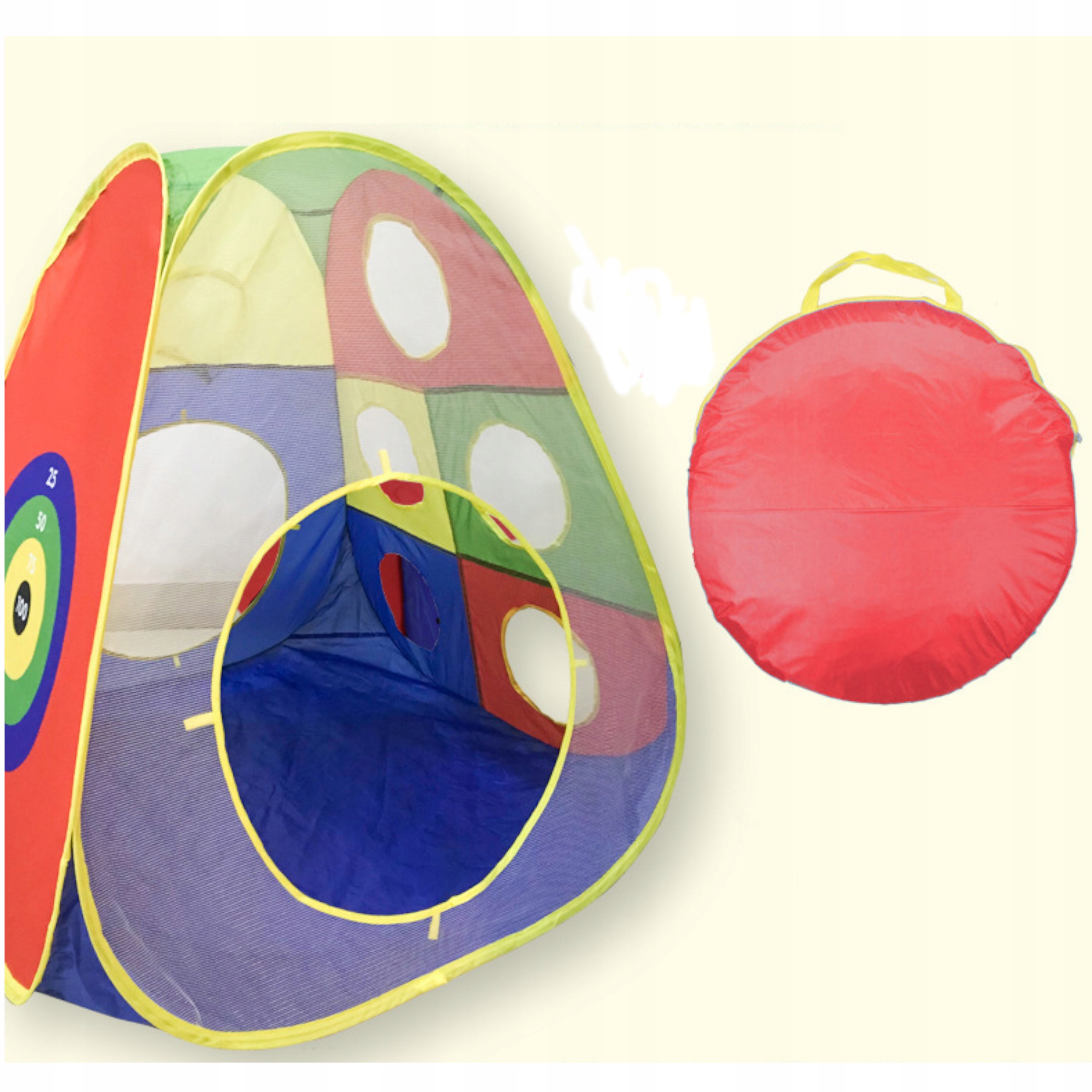 Namiot z jednej strony posiada narysowana tarczę do gry w dart/rzutki oraz kosz do rzucania piłeczek.