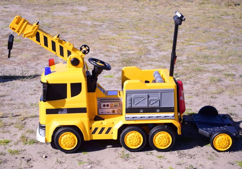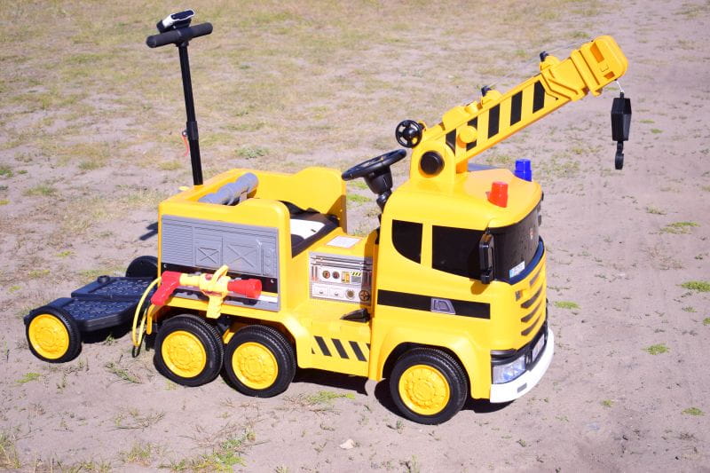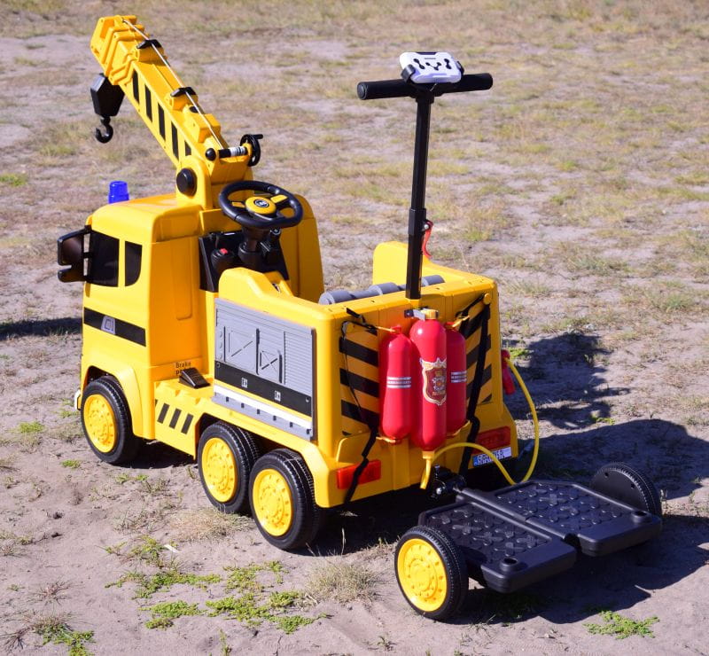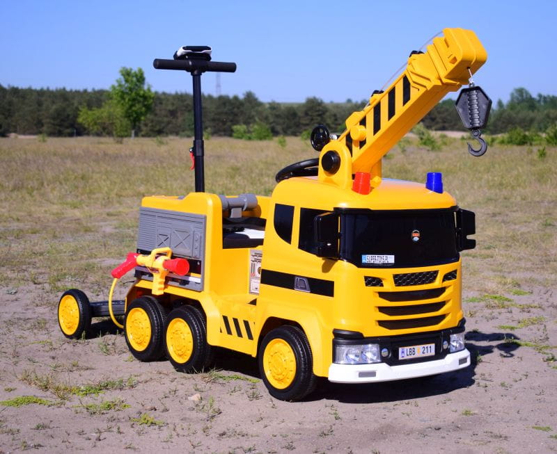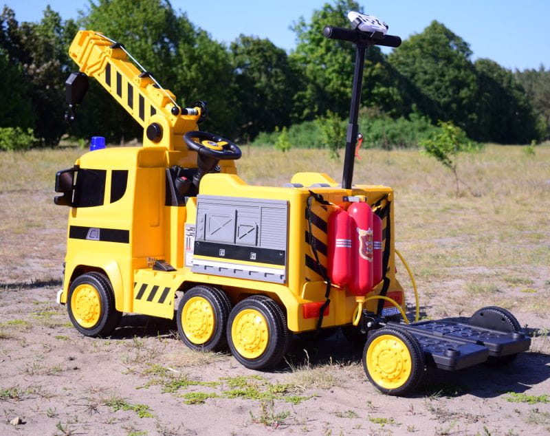 MEGA DŹWIG Z RUCHOMYM HAKIEM w pełnej wersji napędzana dwoma mocnymi silnikami 45 W, z całą pewności zainteresuje młodego strażaka. Zasilanie pojazdu stanowi akumulator 12V 10 Ah co stanowi atut tego pojazdu.