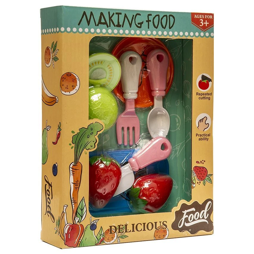 - zestaw kolorowych owoców – 2 precyzyjnie odwzorowane: truskawka (6,5 cm) i melon (6 cm) oraz akcesora w postaci: deski do krojenia o wymiarach: 13 x 7,5 cm, nóż o długości 14 cm, łyżka o długości 11 cm, widelec o długości 11 cm i talerz o średnicy około 9 cm umożliwia interesującą zabawę w dom lub w gotowanie; żywe i soczyste kolory przyciągną uwagę dziecka i zachęcą do zabawy,