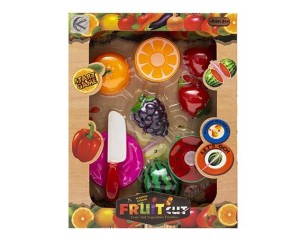 - zestaw kolorowych owoców – pomarańcza, truskawka, winogrono, arbuz, talerzyk oraz nożyk umożliwia interesującą zabawę w dom lub w gotowanie; żywe i soczyste kolory przyciągną uwagę dziecka i zachęcą do zabawy,