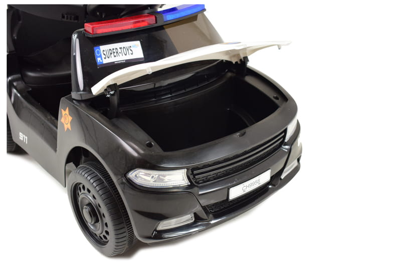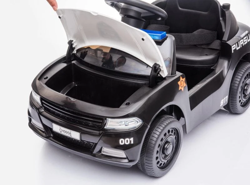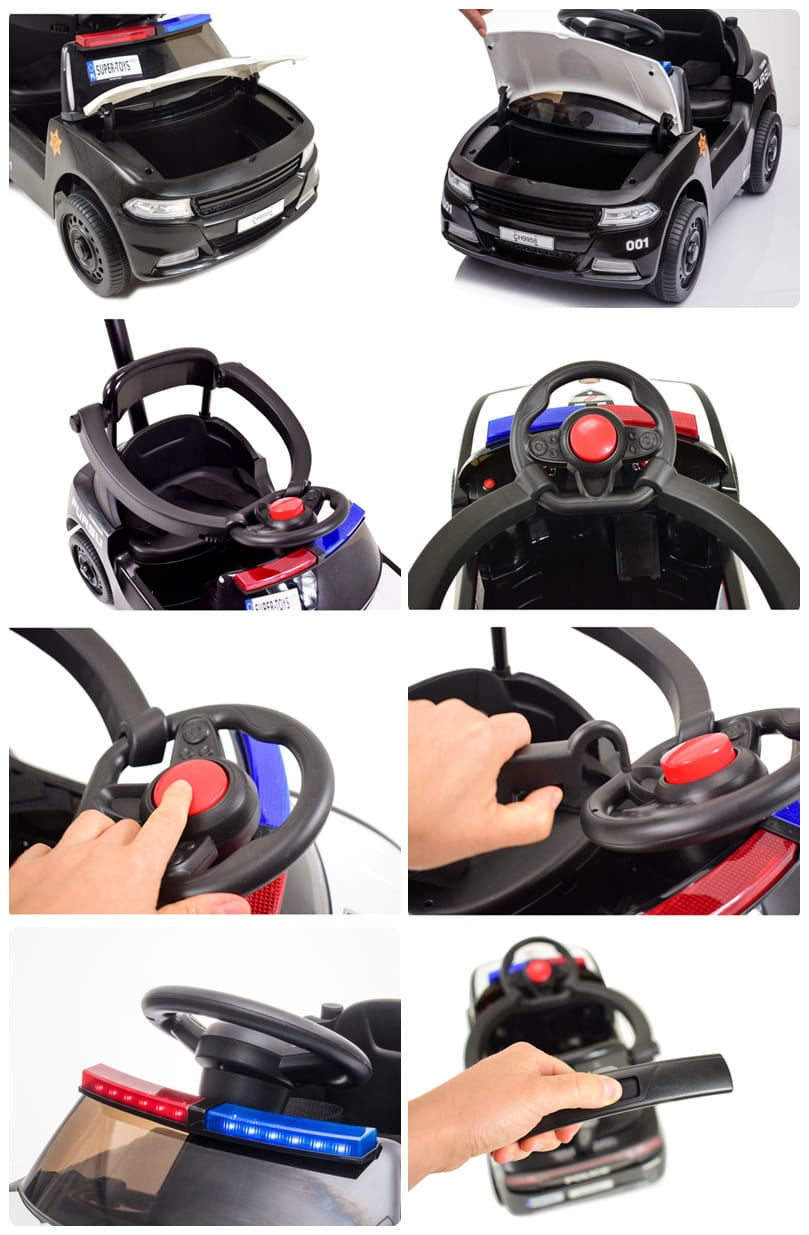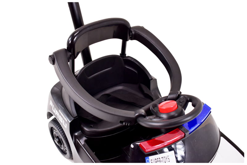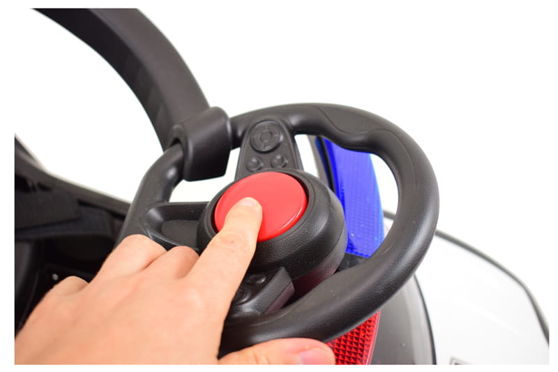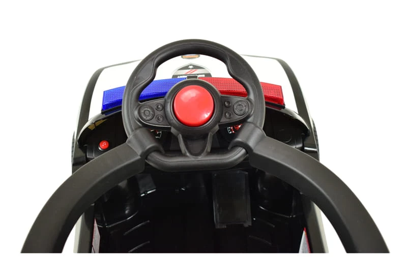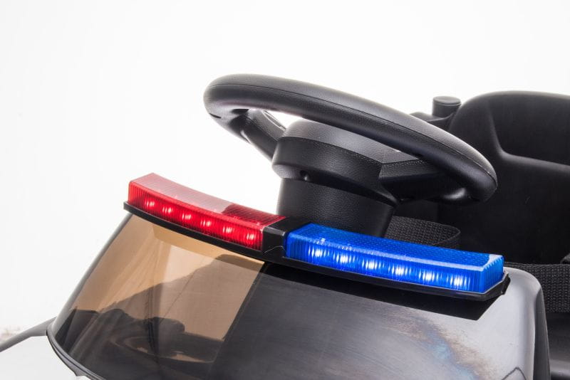 Samochód wyposażony jest w wygodne siedzenie z pasami i barierkami oraz dźwięki policyjne i świecący świecący kogut policyjny. Barierki można w łatwy sposób odpinać lub zdemontować.