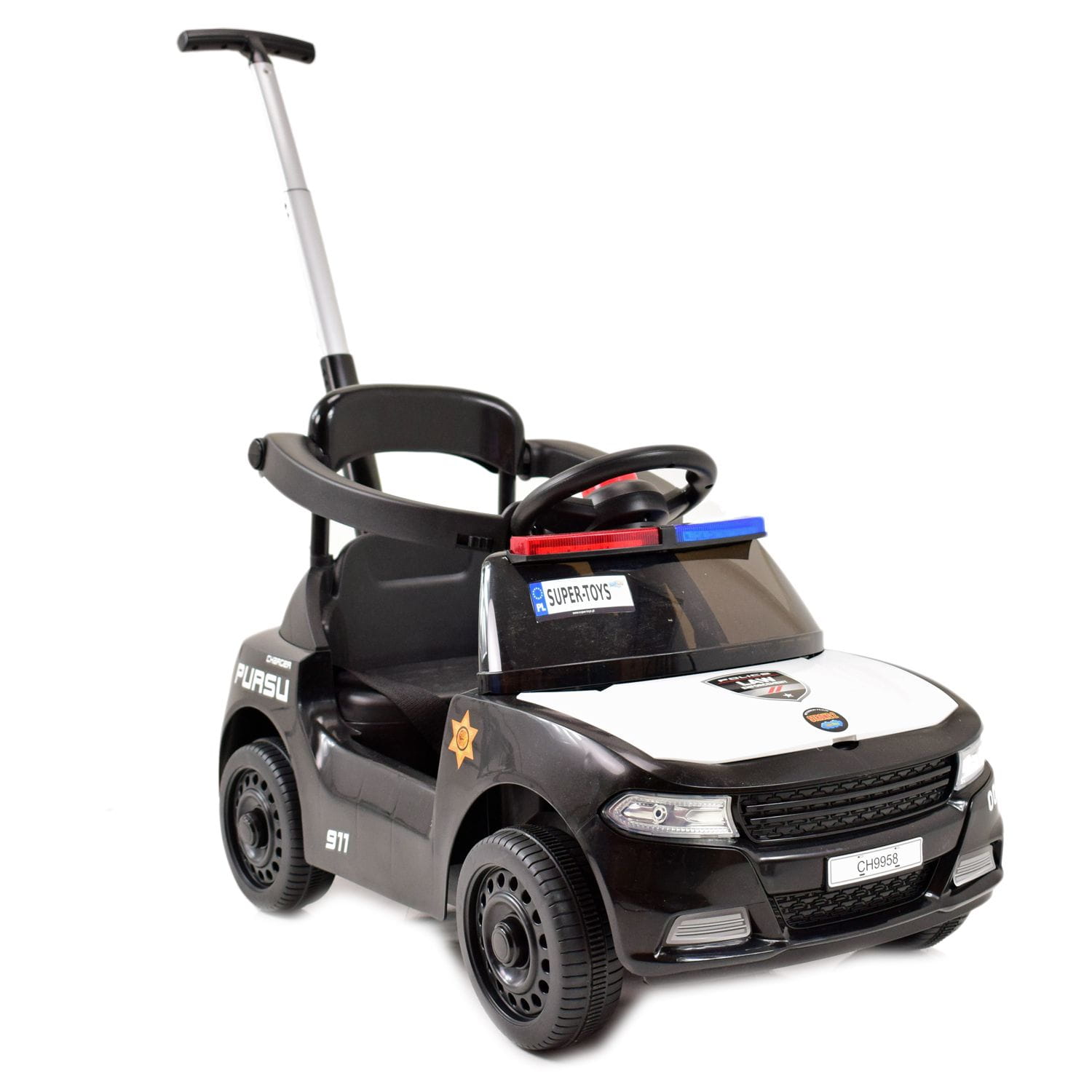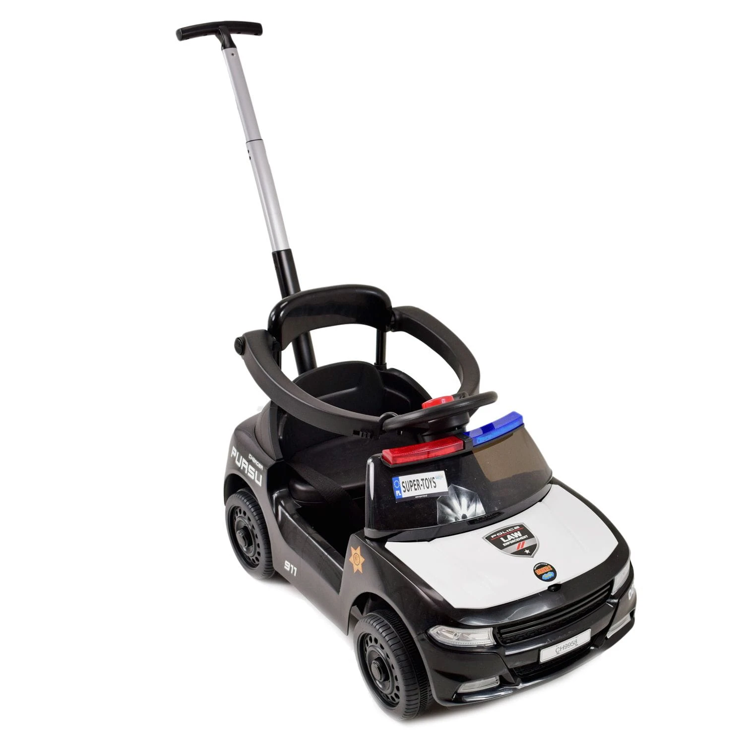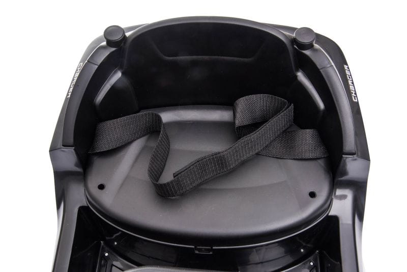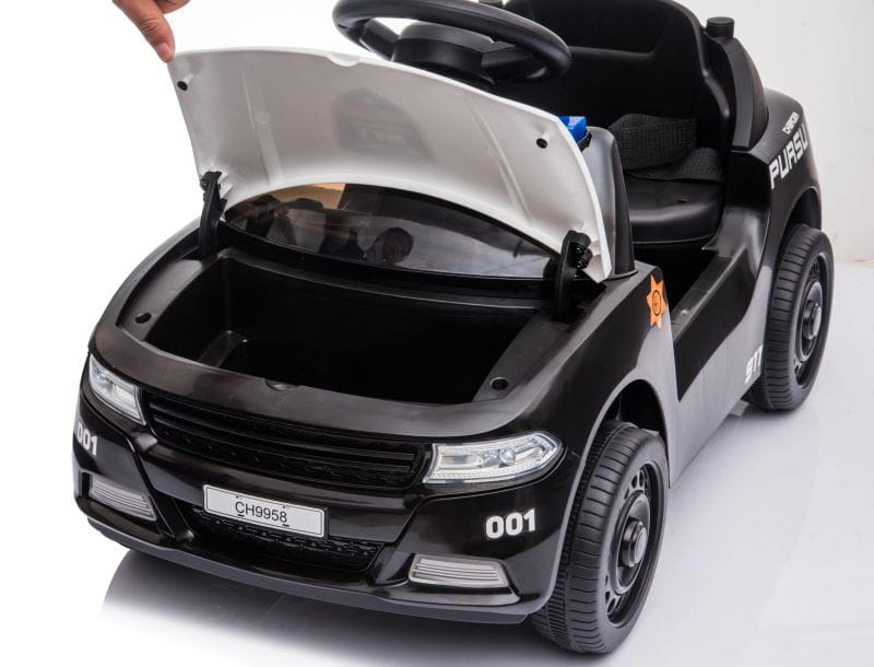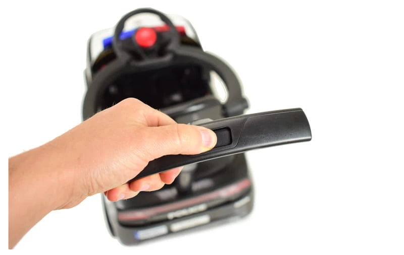 Samochód wyposażony jest w wygodne siedzenie z pasami i barierkami oraz dźwięki policyjne i świecący świecący kogut policyjny. Barierki można w łatwy sposób odpinać lub zdemontować.